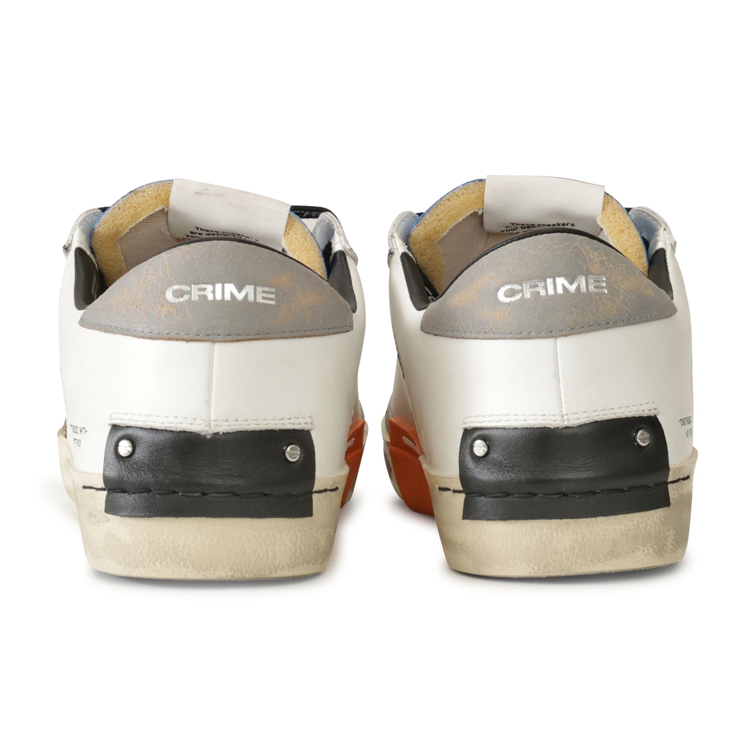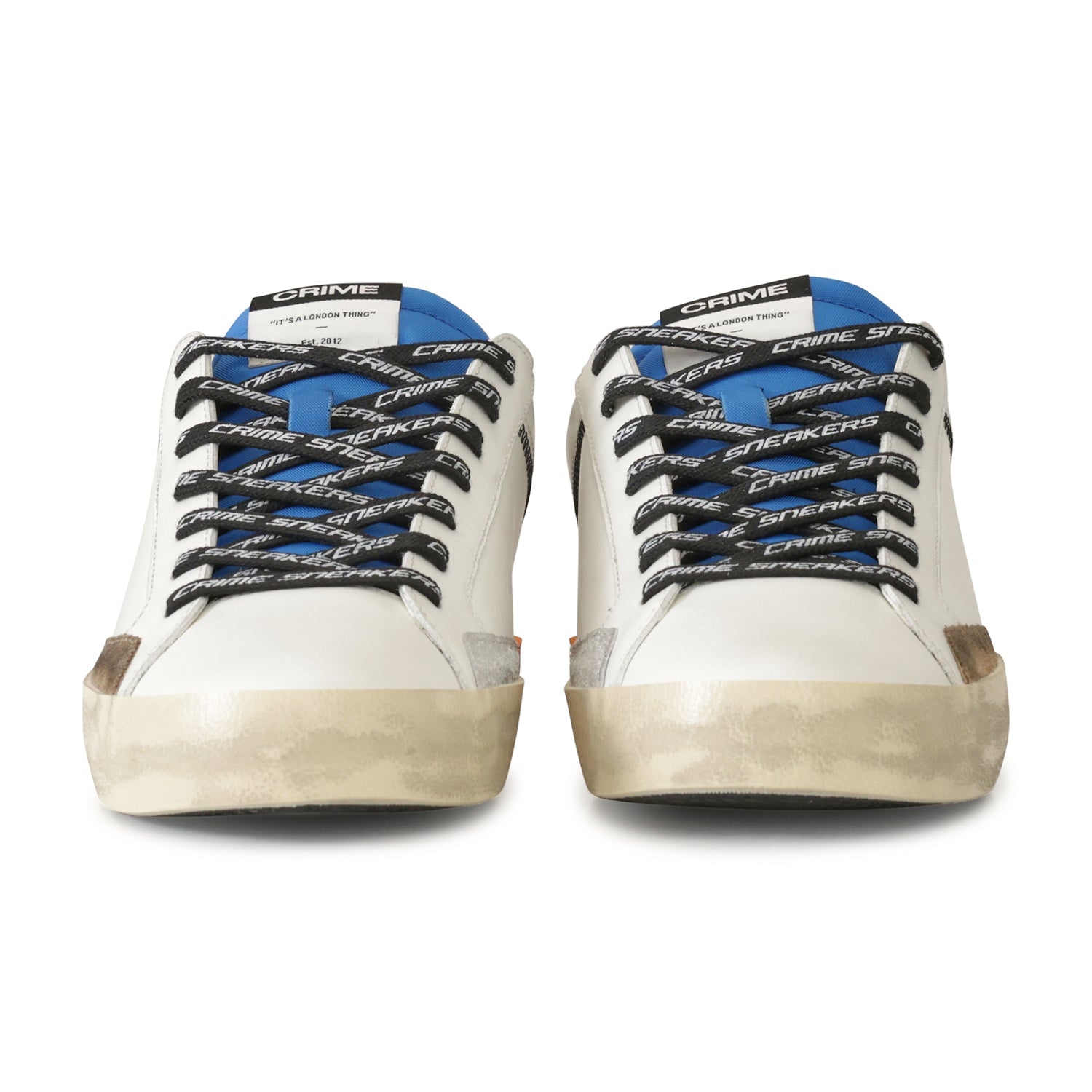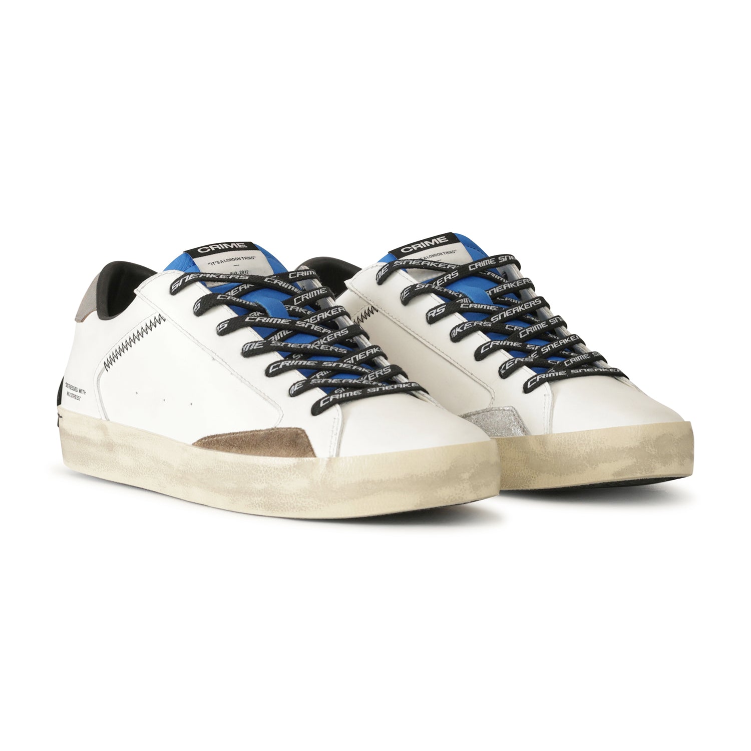 Sneakers DISTRESSED bianca di CRIME in pelle con profili in camoscio beige, tallone in pelle grigia, linguetta in tessuto cobalto. Fondo in gomma.