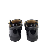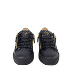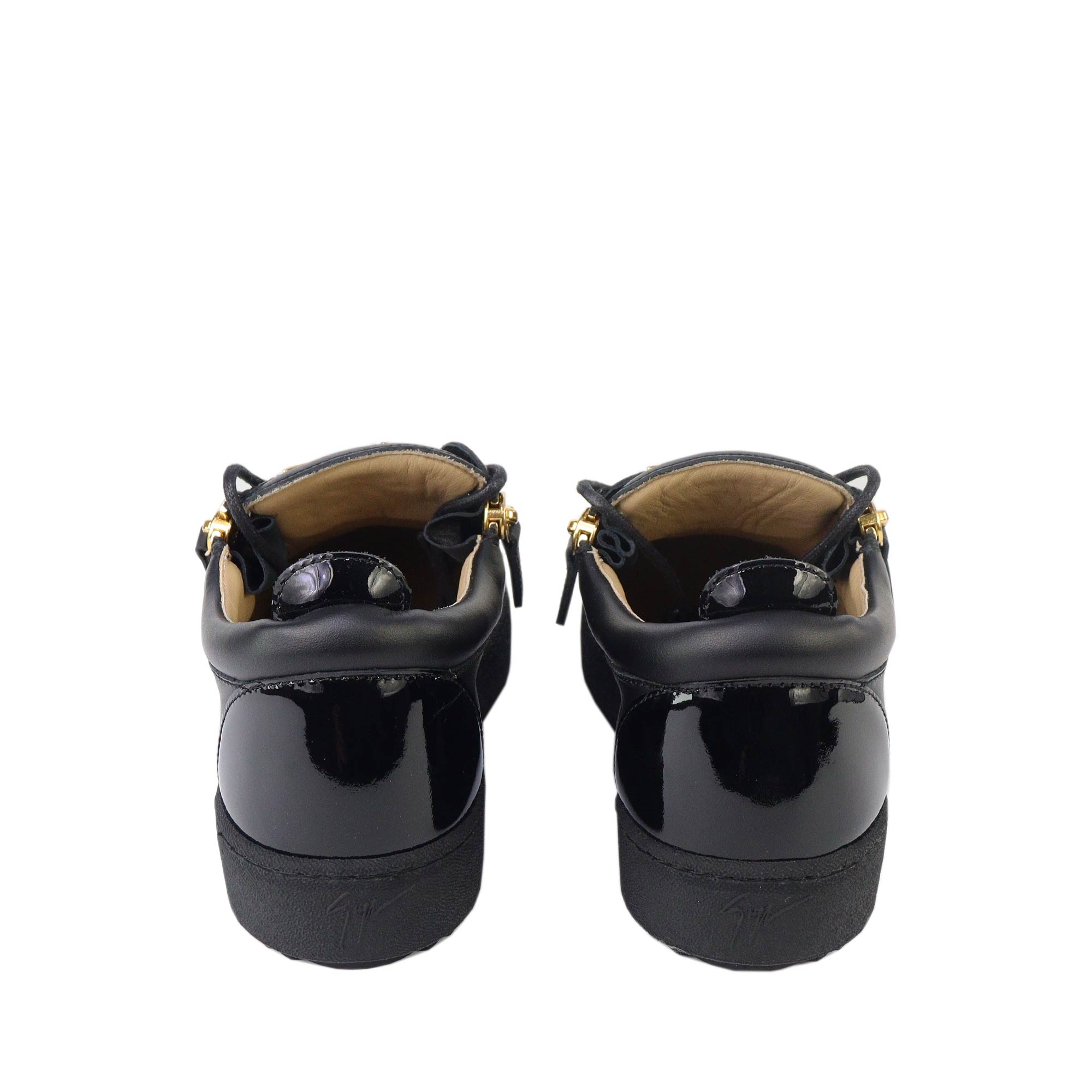 Sneakers FRANKIE nera di GIUSEPPE ZANOTTI DESIGN realizzata in pelle con profili in vernice in tinta, zip e logo in oro. Fondo in gomma