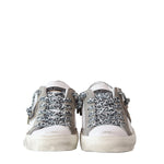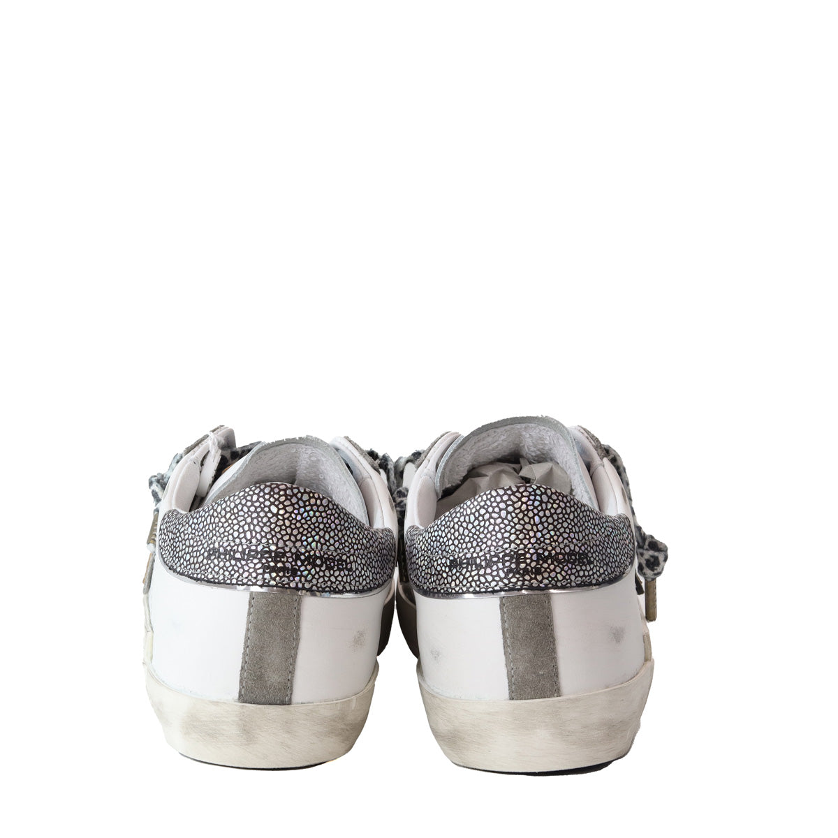 Sneakers PARIS bianca di PHILIPPE MODEL in pelle con scudetto logo in nero, profili in camoscio grigio e tallone in microleopardato bianco e nero. Fondo in gomma in bianco con effetto used.
