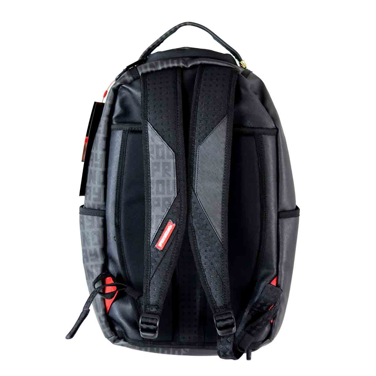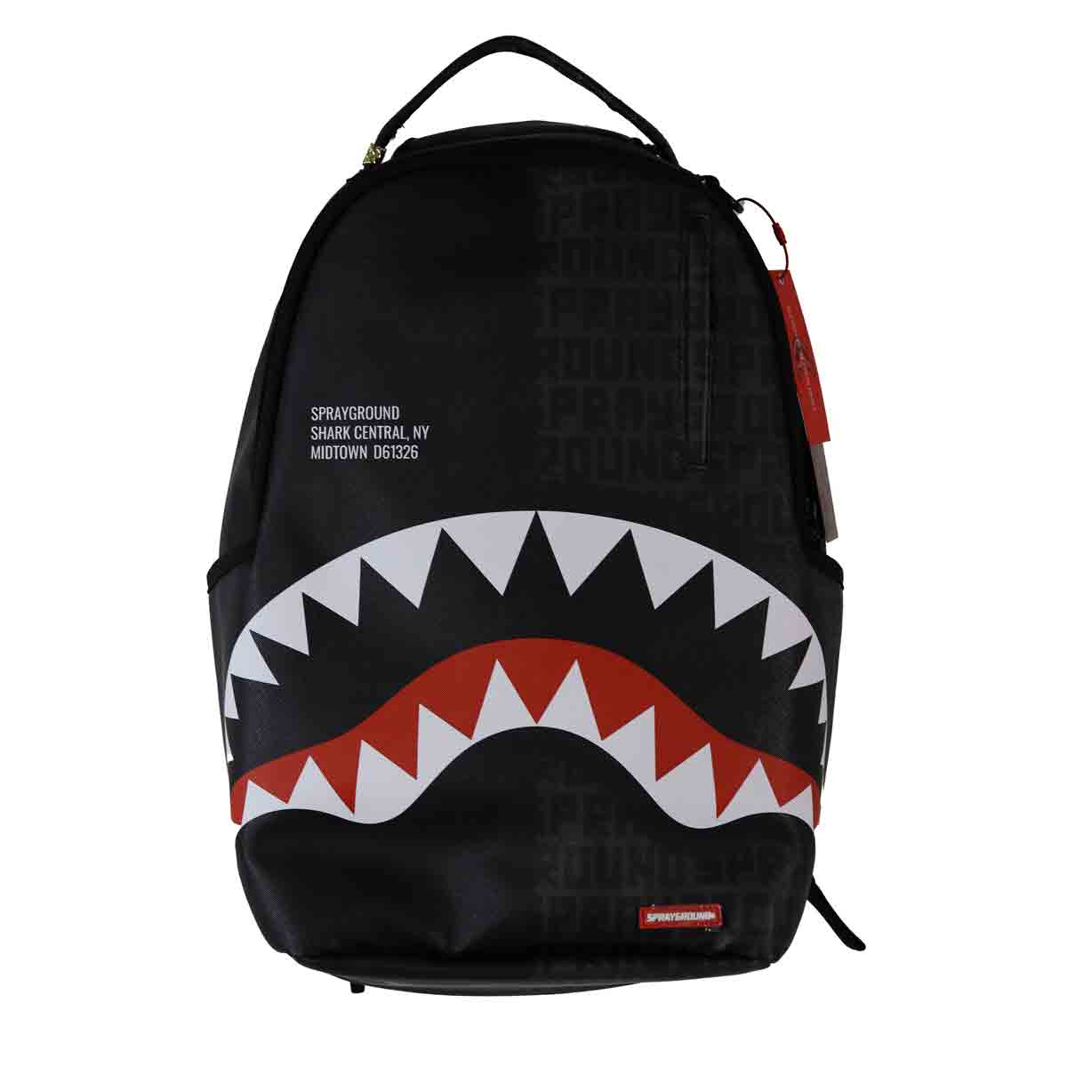 Zaino Shark nero di SPRAYGROUND in ecopelle con stampa logo a contrasto e shark classic con rosso e bianco. apertura con zip superiore. Misure 32x45x18cm.