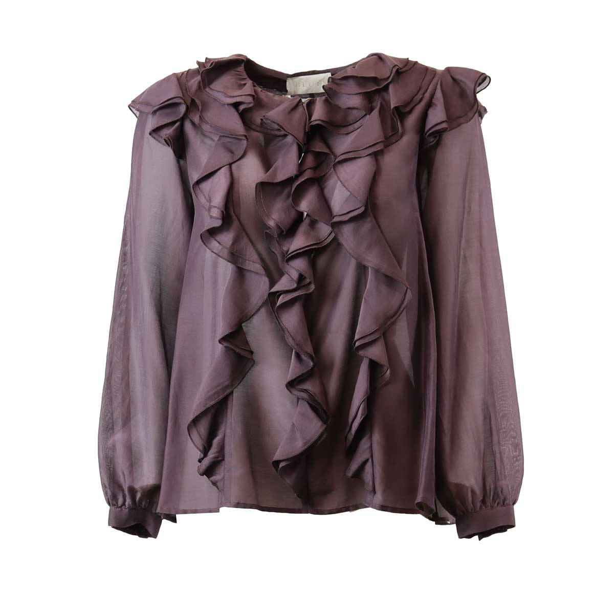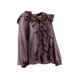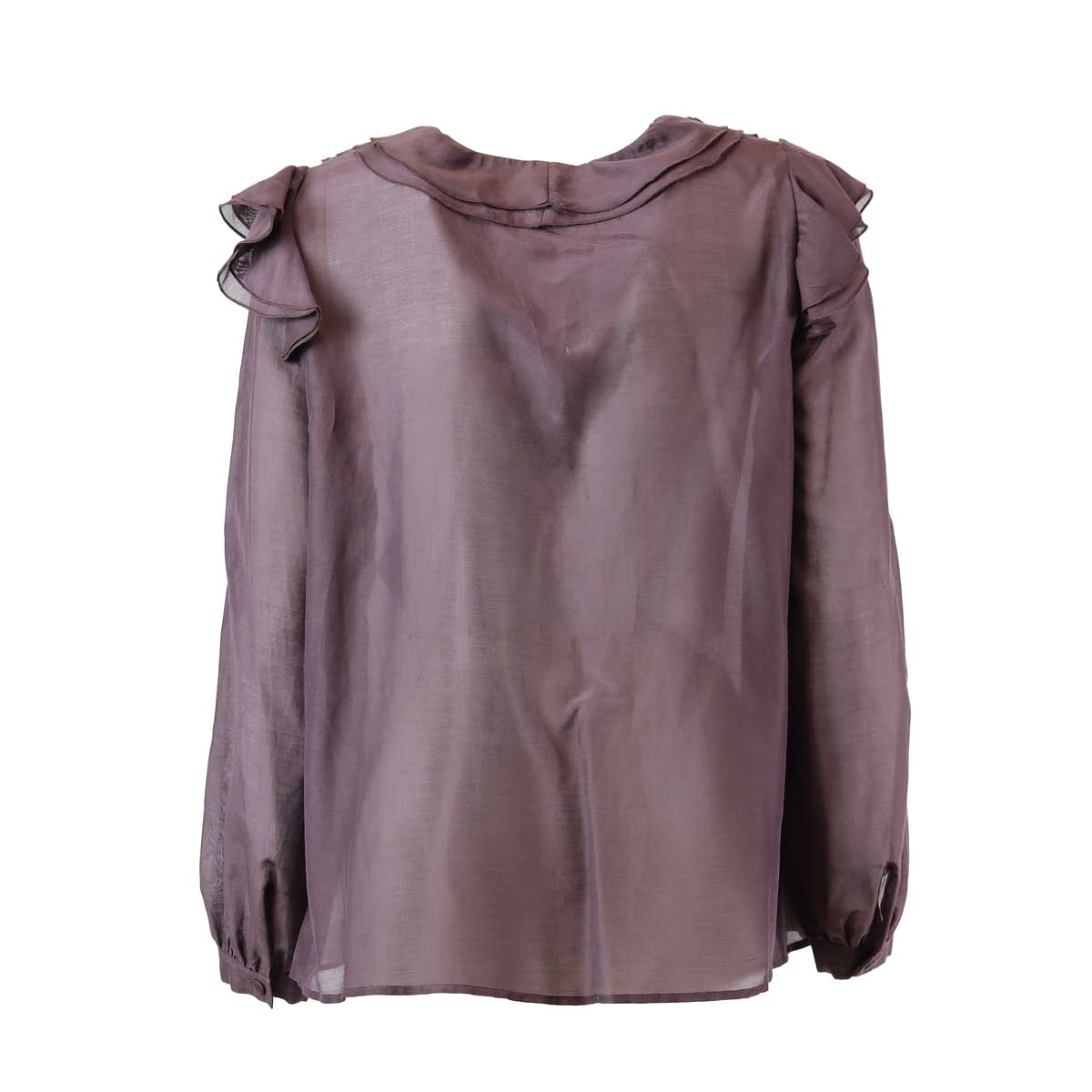 Camicia CLEOPATRA bordeaux di IBLUES in misto seta con rouches su collo e spalle, maniche lunghe con bottoni. Linea morbida, fit ampio.