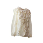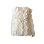 Camicia CLEOPATRA off white di IBLUES in misto seta con rouches su collo e spalle, maniche lunghe con bottoni. Linea morbida, fit ampio.