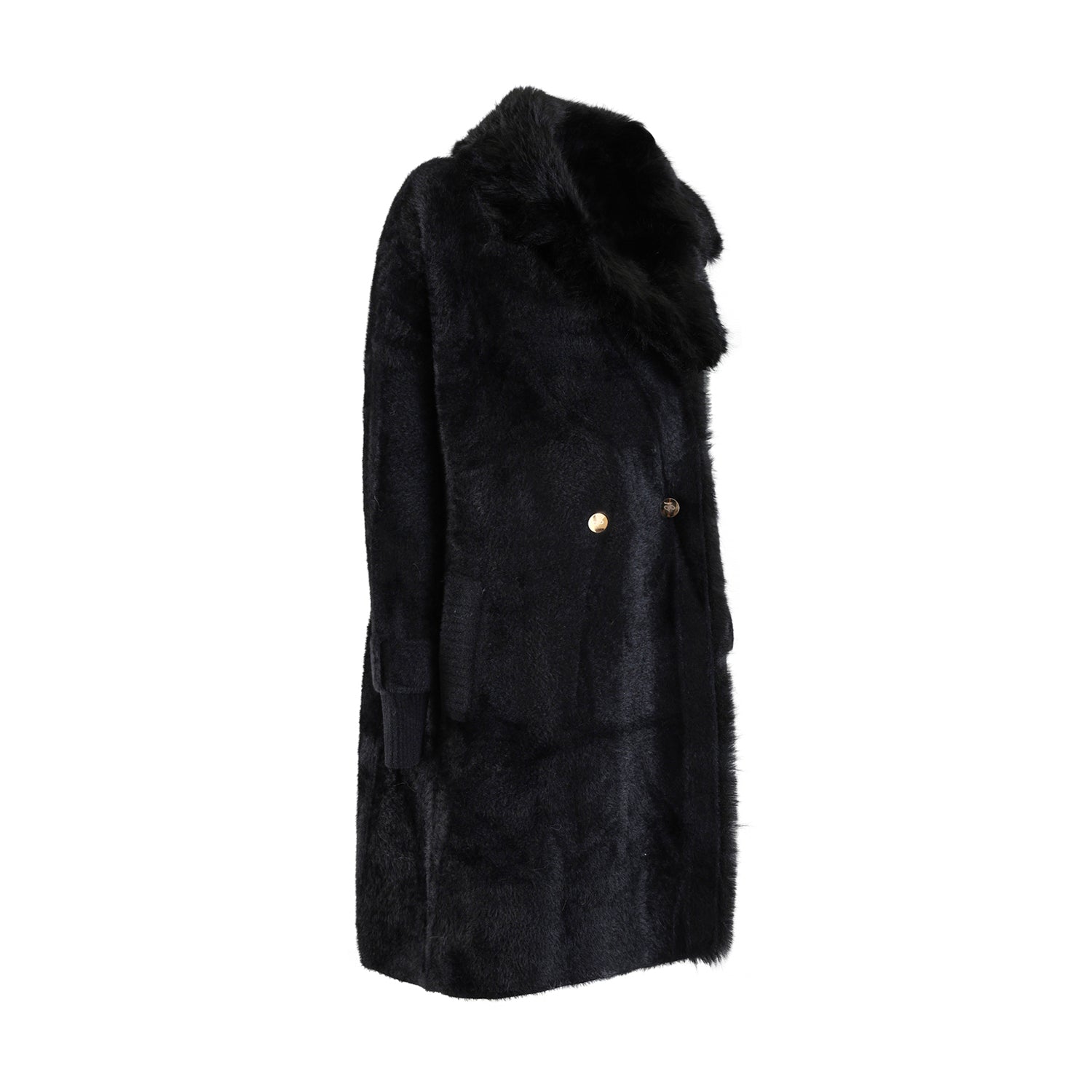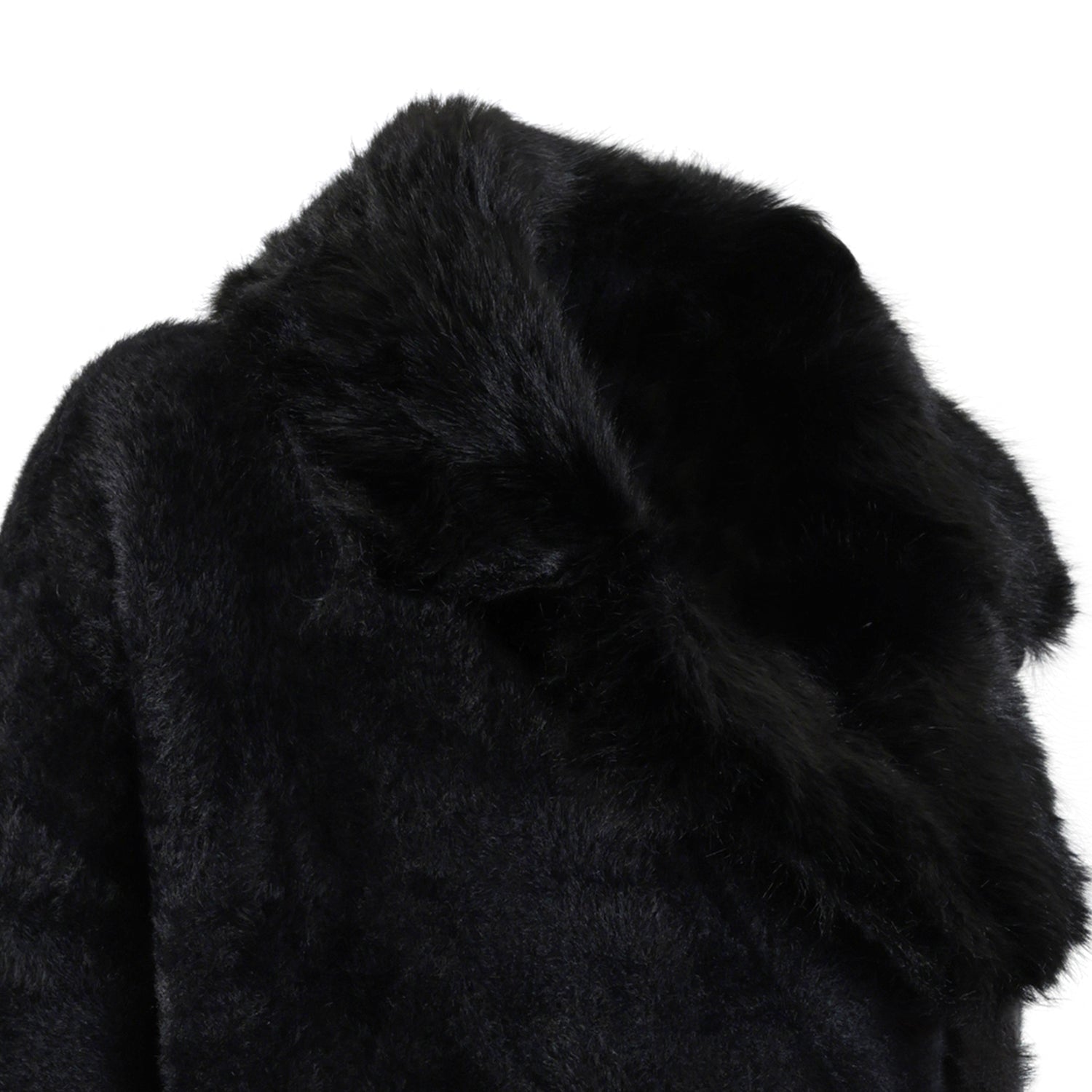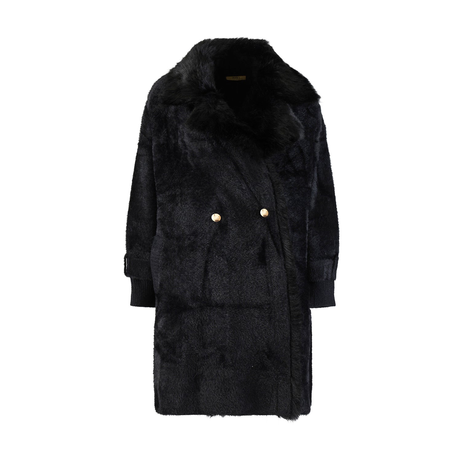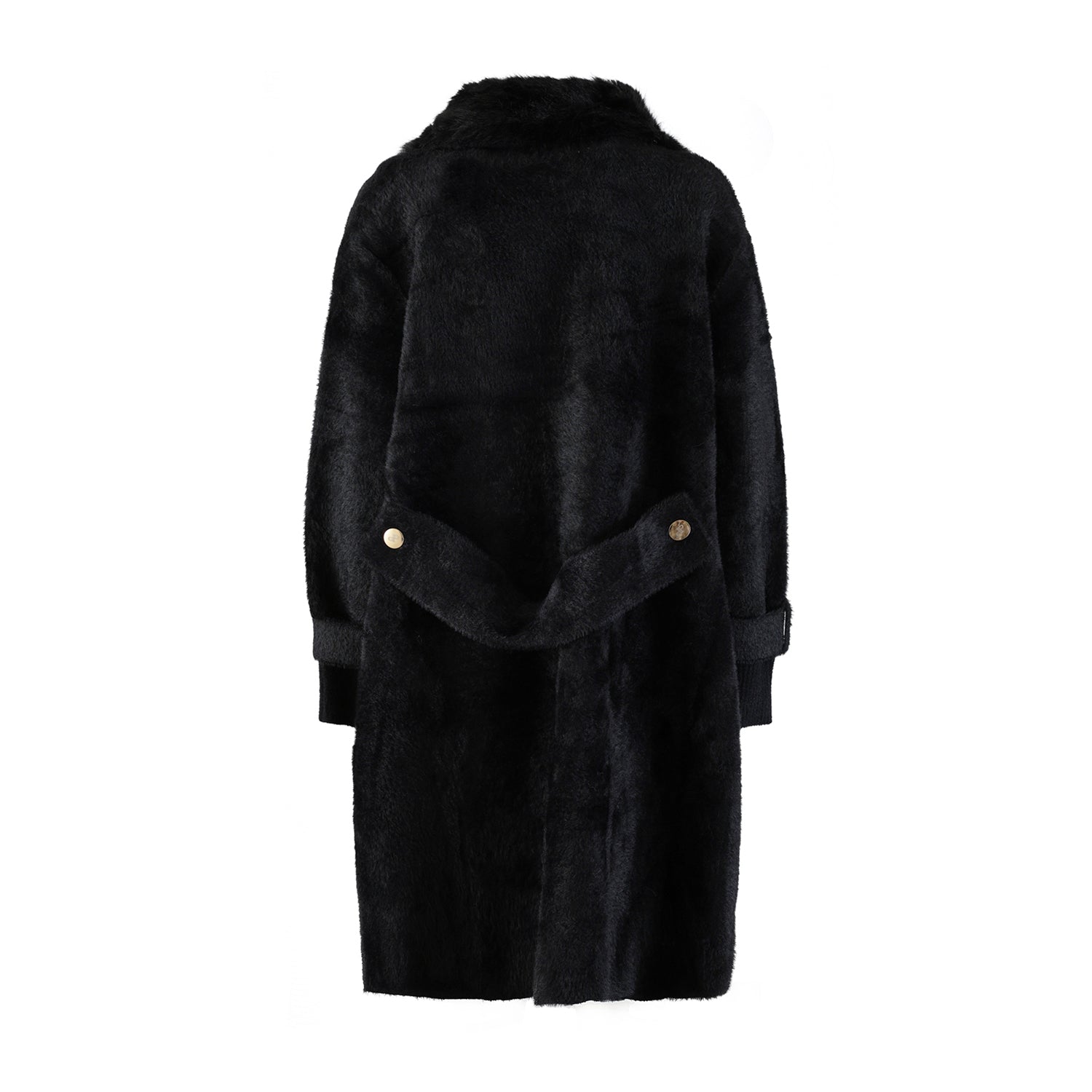 Cappotto nero di PHO FIRENZE in nylon con modello doppio petto, cintura posteriore, collo in ecopelliccia.
