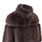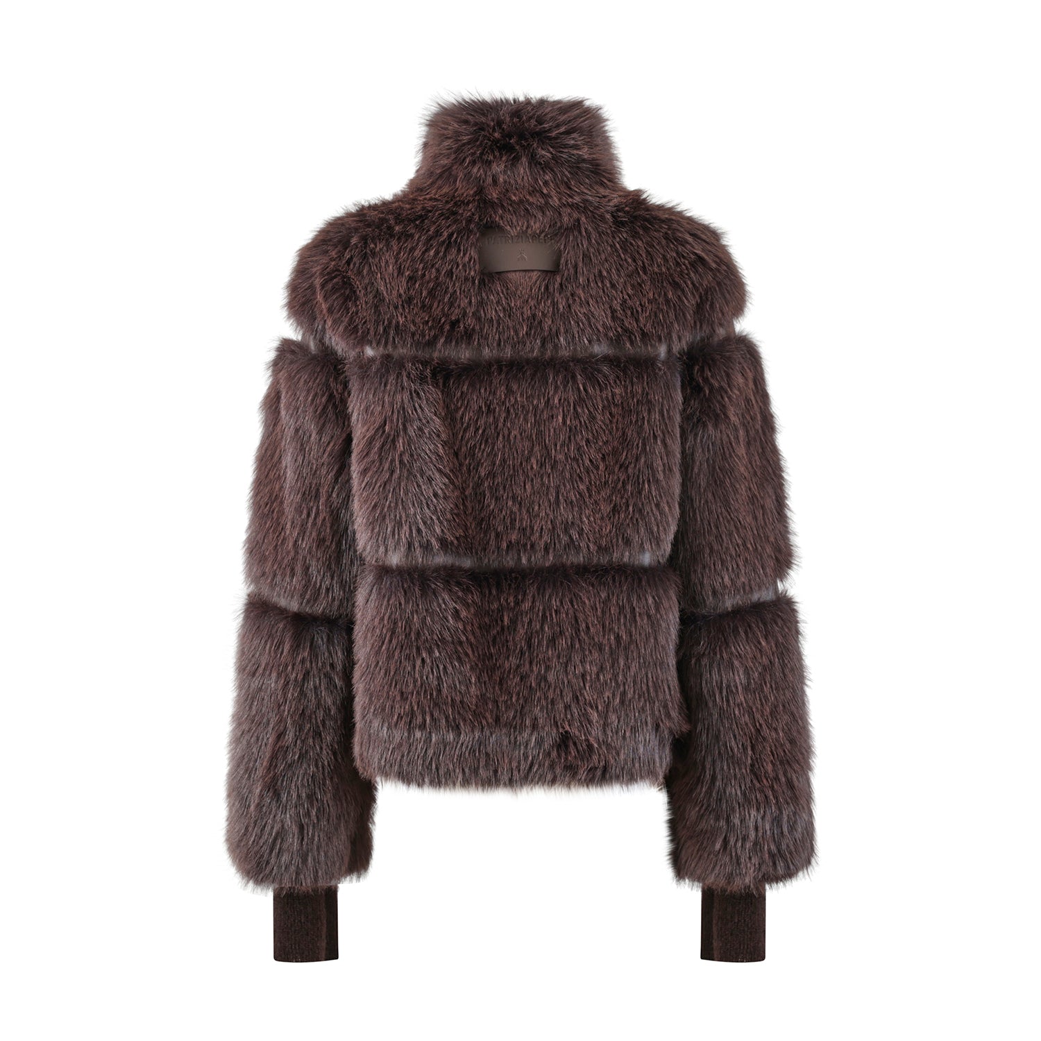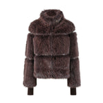 Giubbotto fluffy marrone di PATRIZIA PEPE in ecopelliccia con collo alto, polsini in maglia, maniche lunghe, chiusura con bottoni e zip. Fit regular.