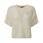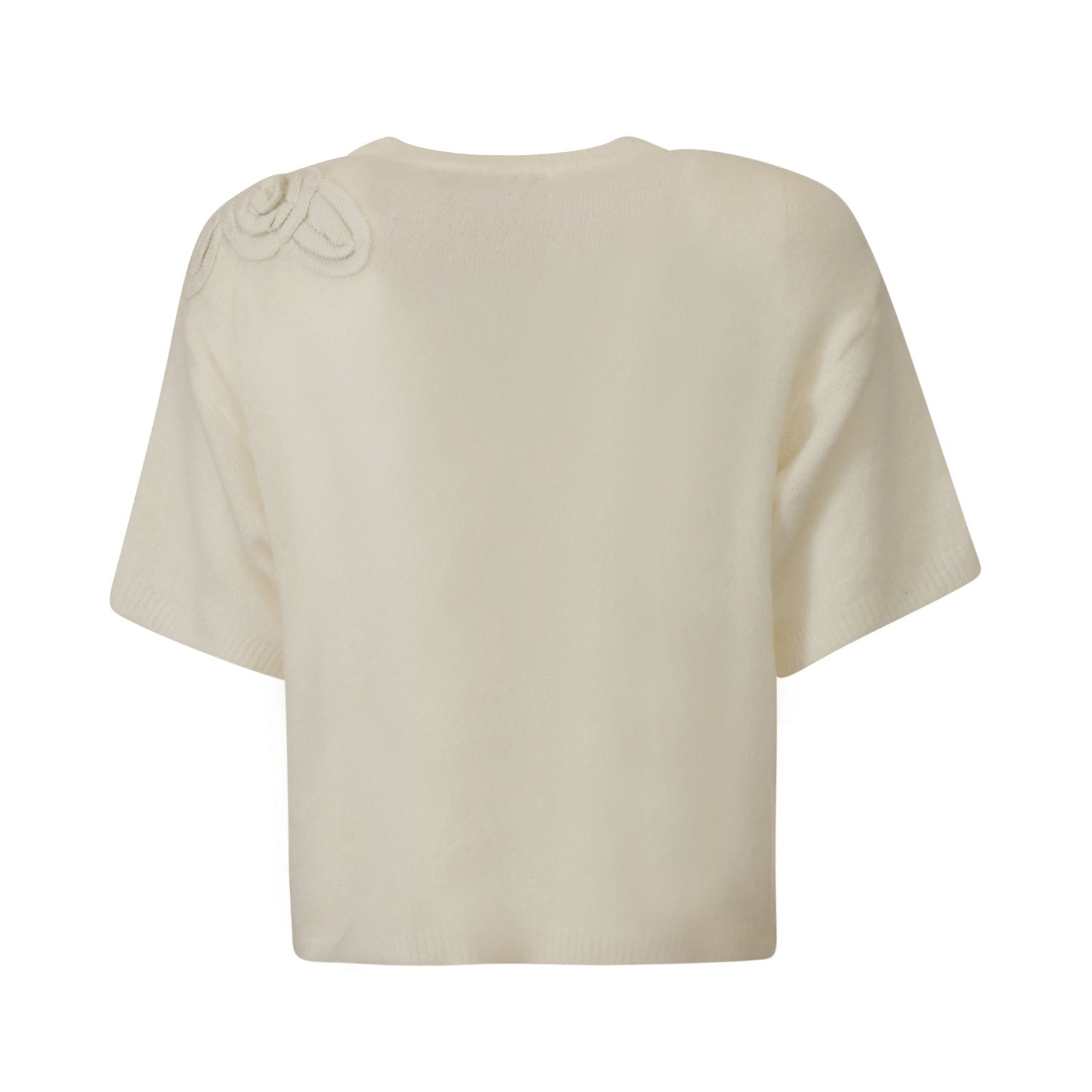 Maglia bianca di ANOTHER LABEL in misto lana con scollo tondo, mezza manica, fiore in maglia bianco.