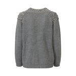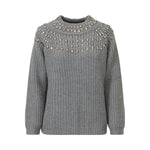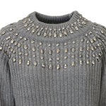 Maglia grigia di T by ME in misto lana con collo semi alto, lavorazione a intarsio, accessori sulla parte superiore.