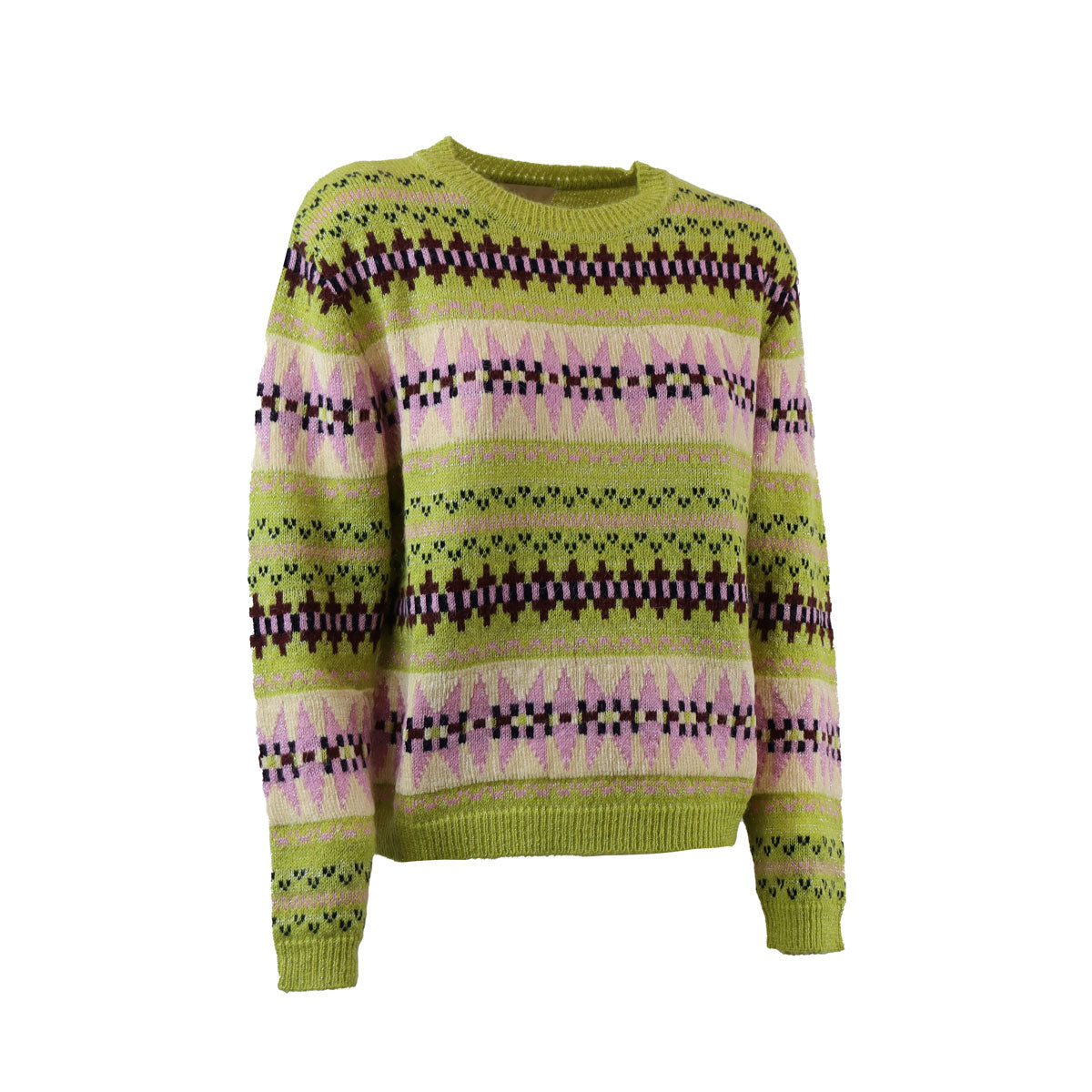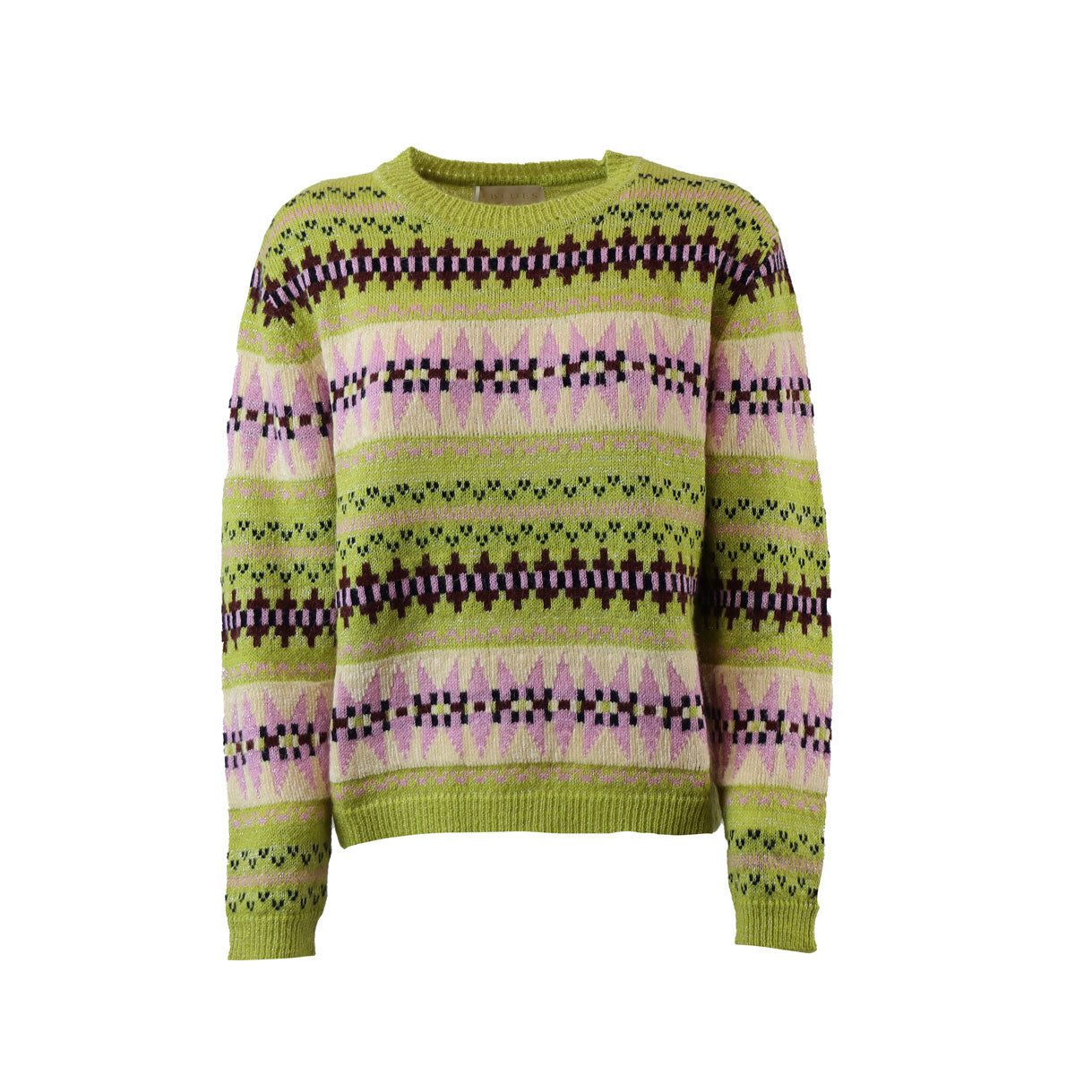 Maglia LUCIANA verde di IBLUES in misto lana con effetto lurex, scollo tondo, bordi a costine. Fit regolare.