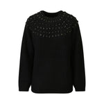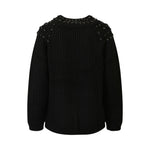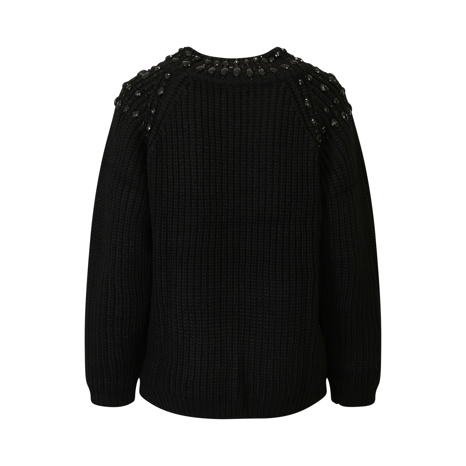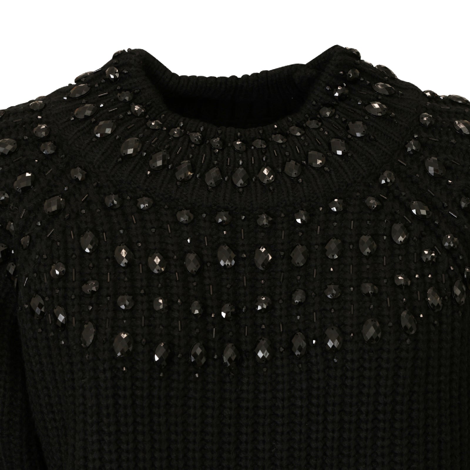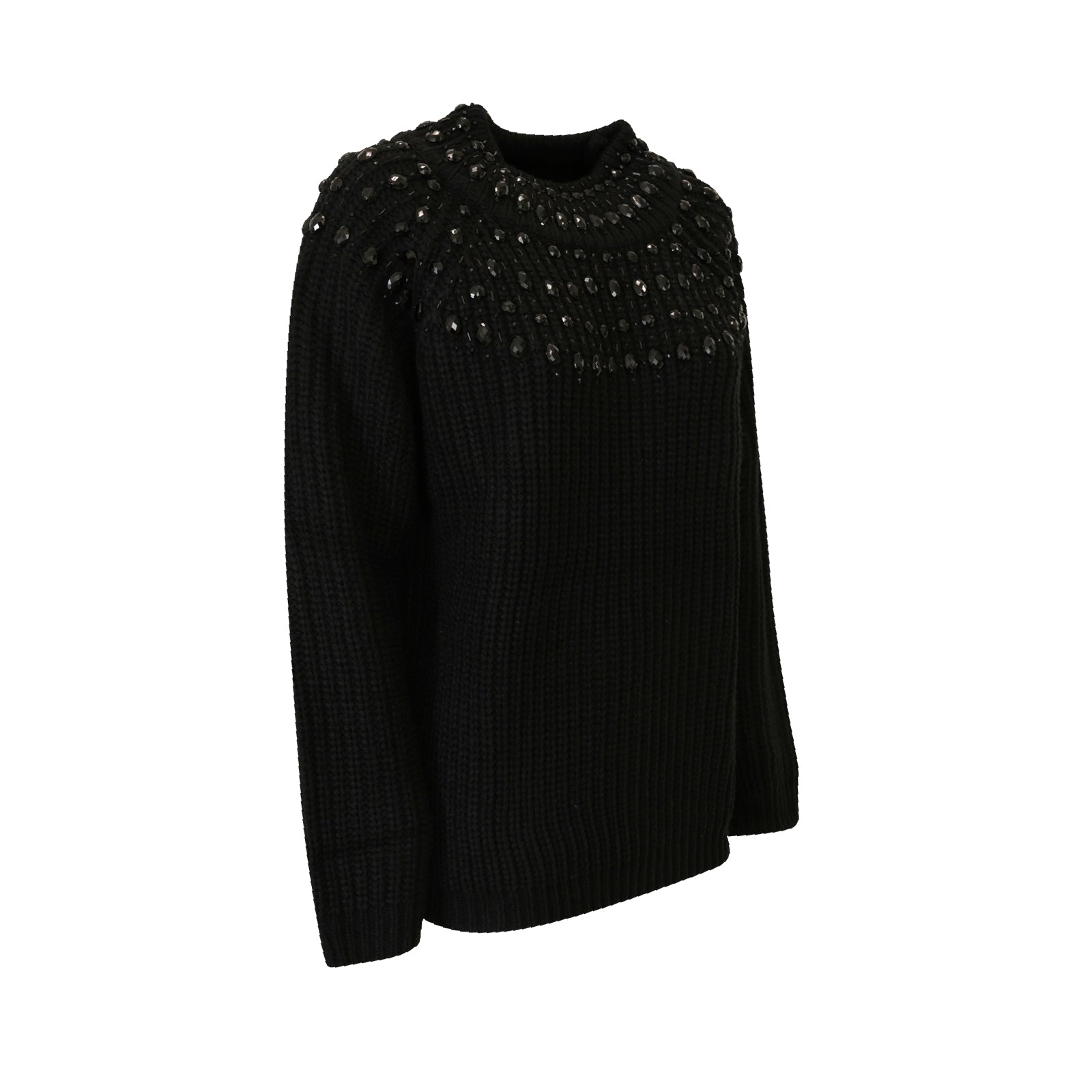 Maglia nera di T by ME in misto lana con collo semi alto, lavorazione a intarsio, accessori sulla parte superiore.