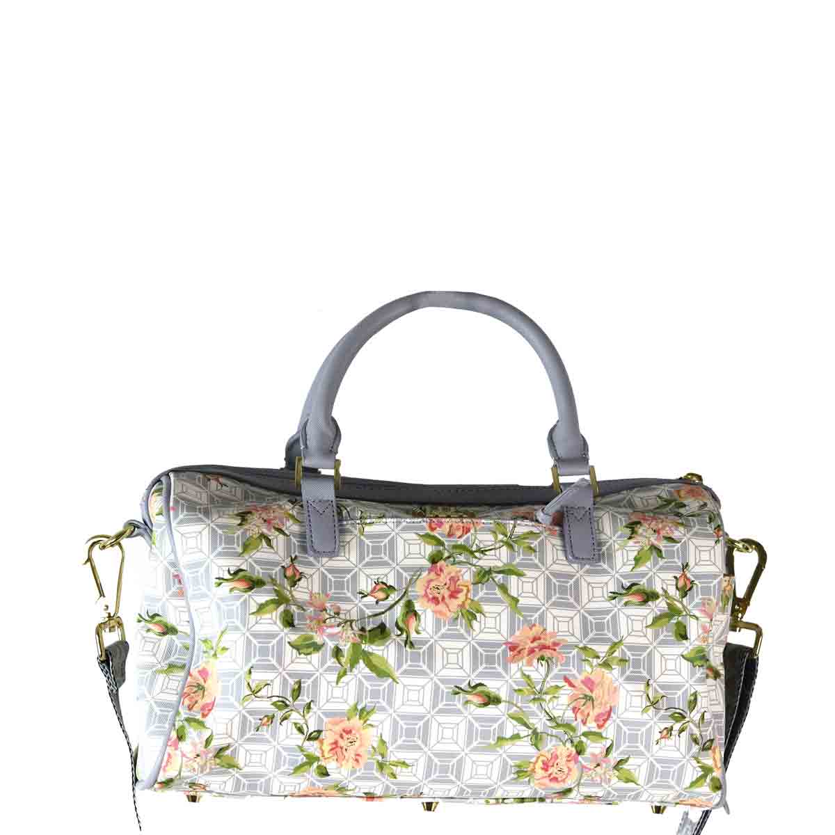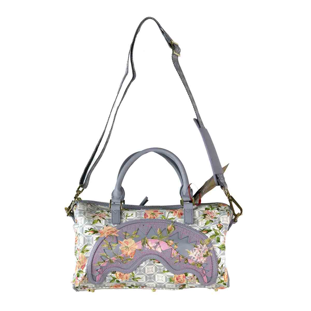 Bauletto Flower grigio di SPRAYGROUND in ecopelle con stampa floreale in cipria, chiusura con zip, tracolla interna in tessuto e doppio manico. Misure 35x20x18cm.