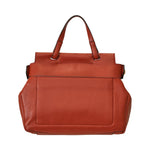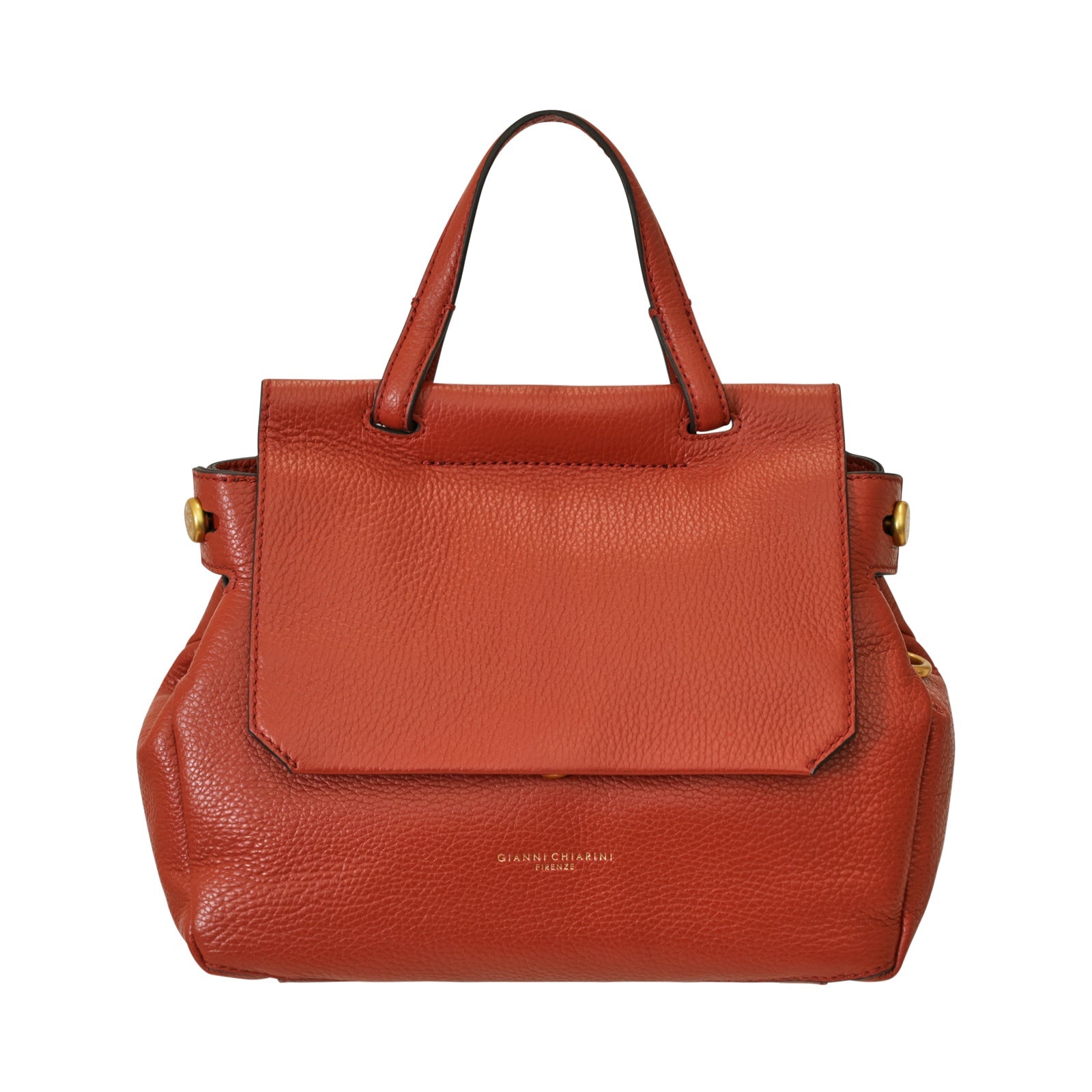 Borsa a mano mattone di GIANNI CHIARINI in pelle con effetto martellato, chiusura con patta, manico singolo, logo a fuoco in color oro, bottoni laterali in metallo oro. Misure 27x21x11 cm.