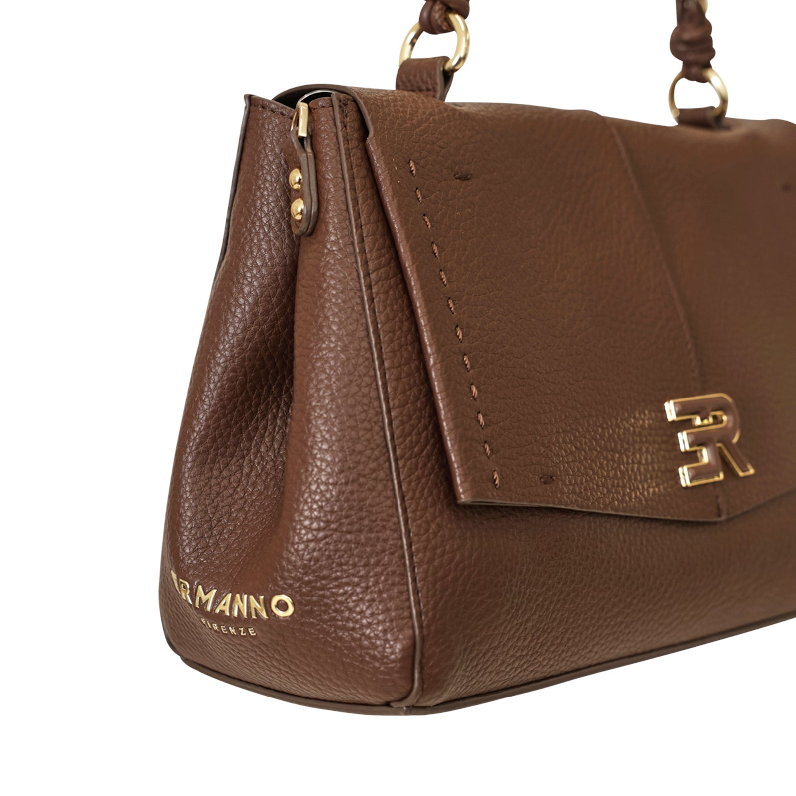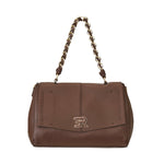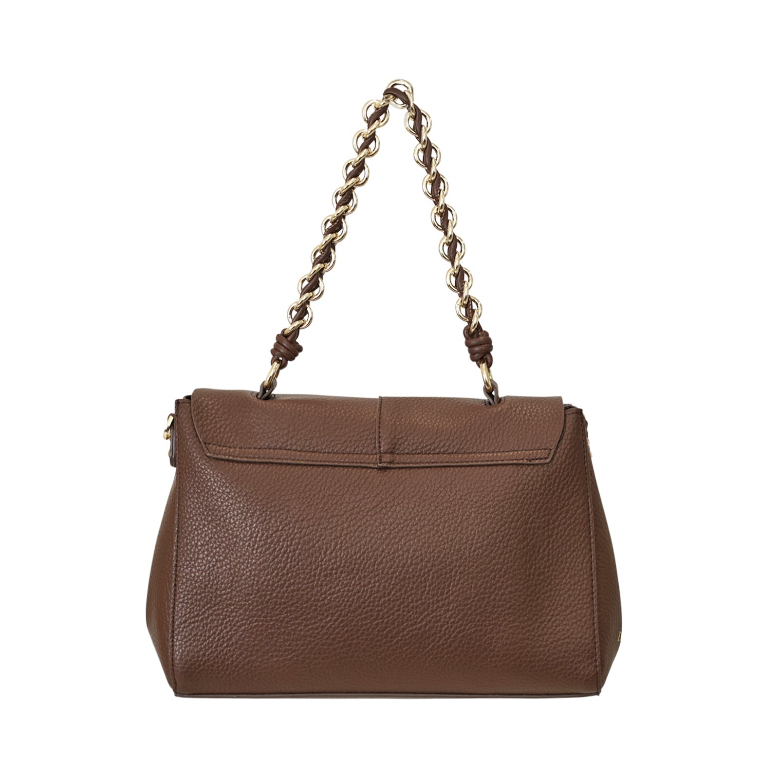 Borsa a mano media BEA marrone di ERMANNO SCERVINO in ecopelle con effetto bottalato, logo coi profili in metallo oro, manico con catena, chiusura con zip e patta. Misure 30x22x13 cm.