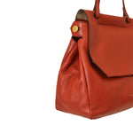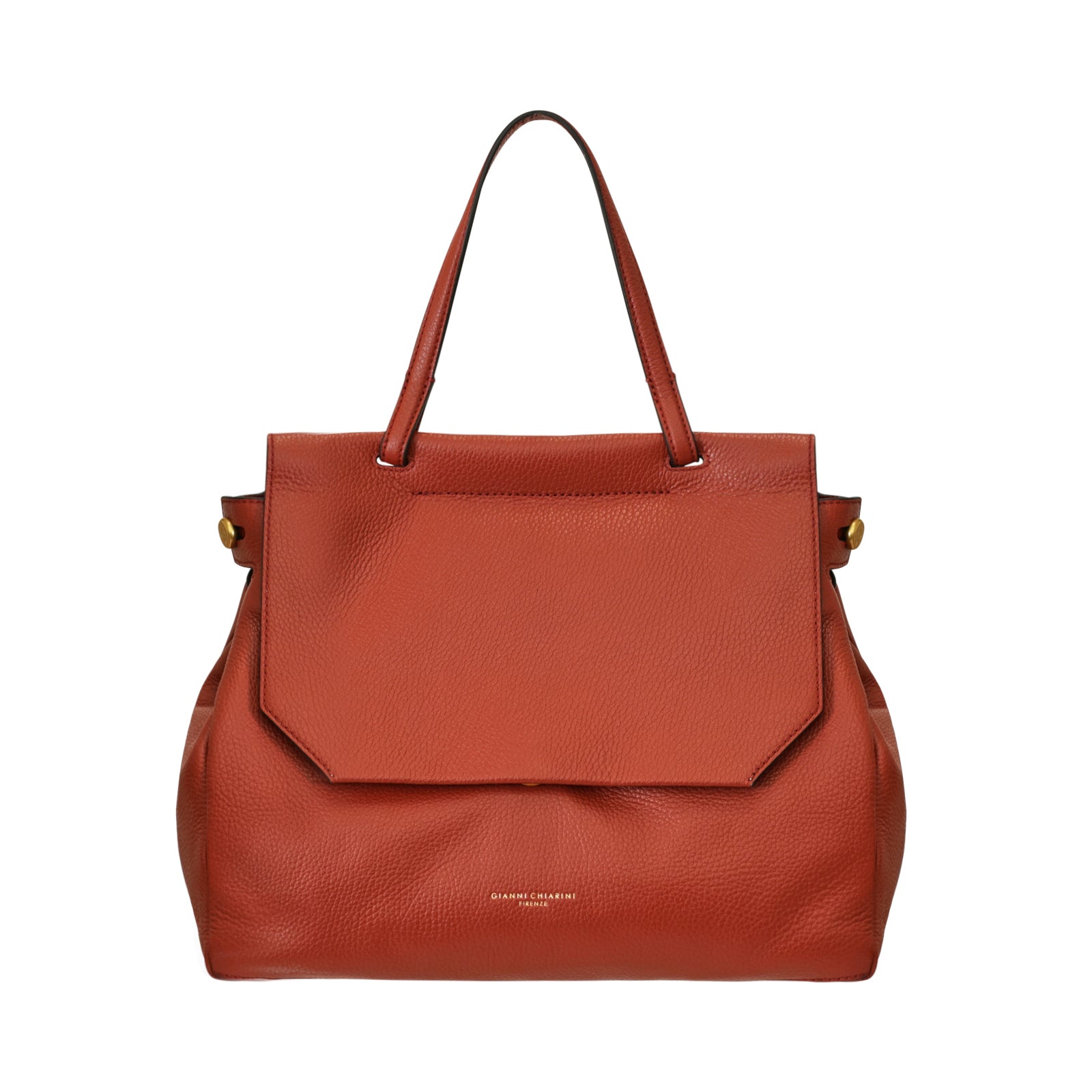 Borsa a mano media mattone di GIANNI CHIARINI in pelle con effetto martellato, chiusura con patta, manico singolo, logo a fuoco in color oro, bottoni laterali in metallo oro. Misure 36x27x15 cm.