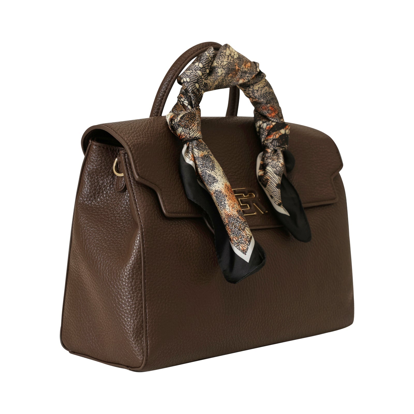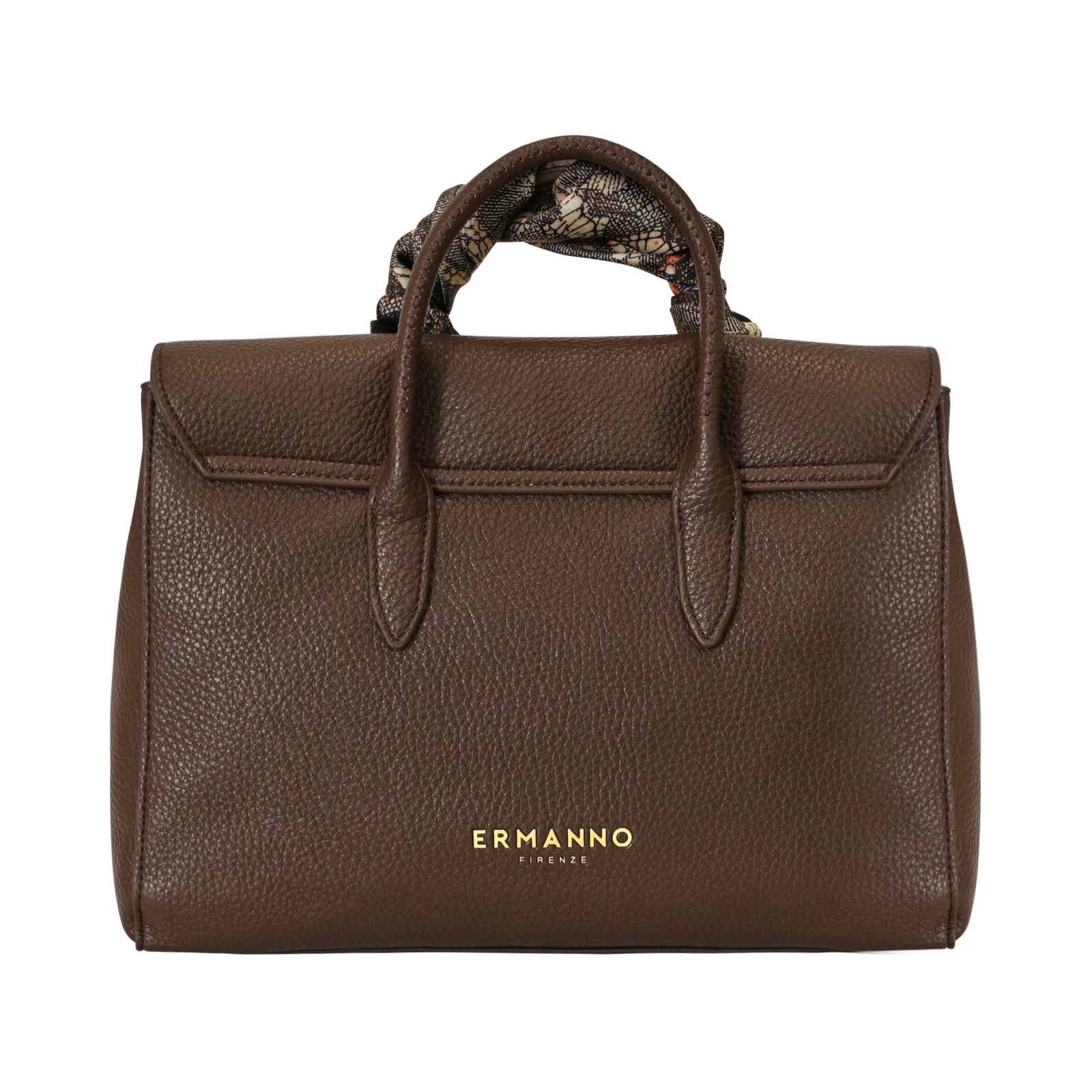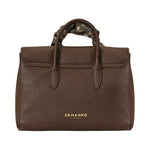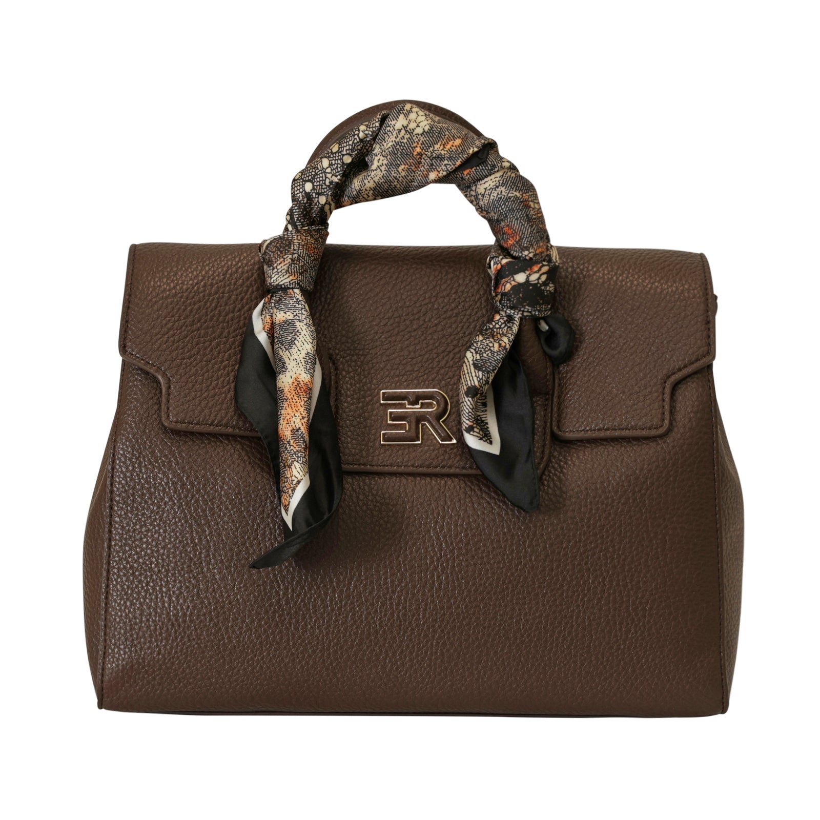 Borsa a mano VIOLET marrone di ERMANNO SCERVINO in ecopelle con effetto bottalato con manico singolo con foulard, chiusura con zip e patta e logo coi profili in metallo oro. Misure 32x23x14 cm.