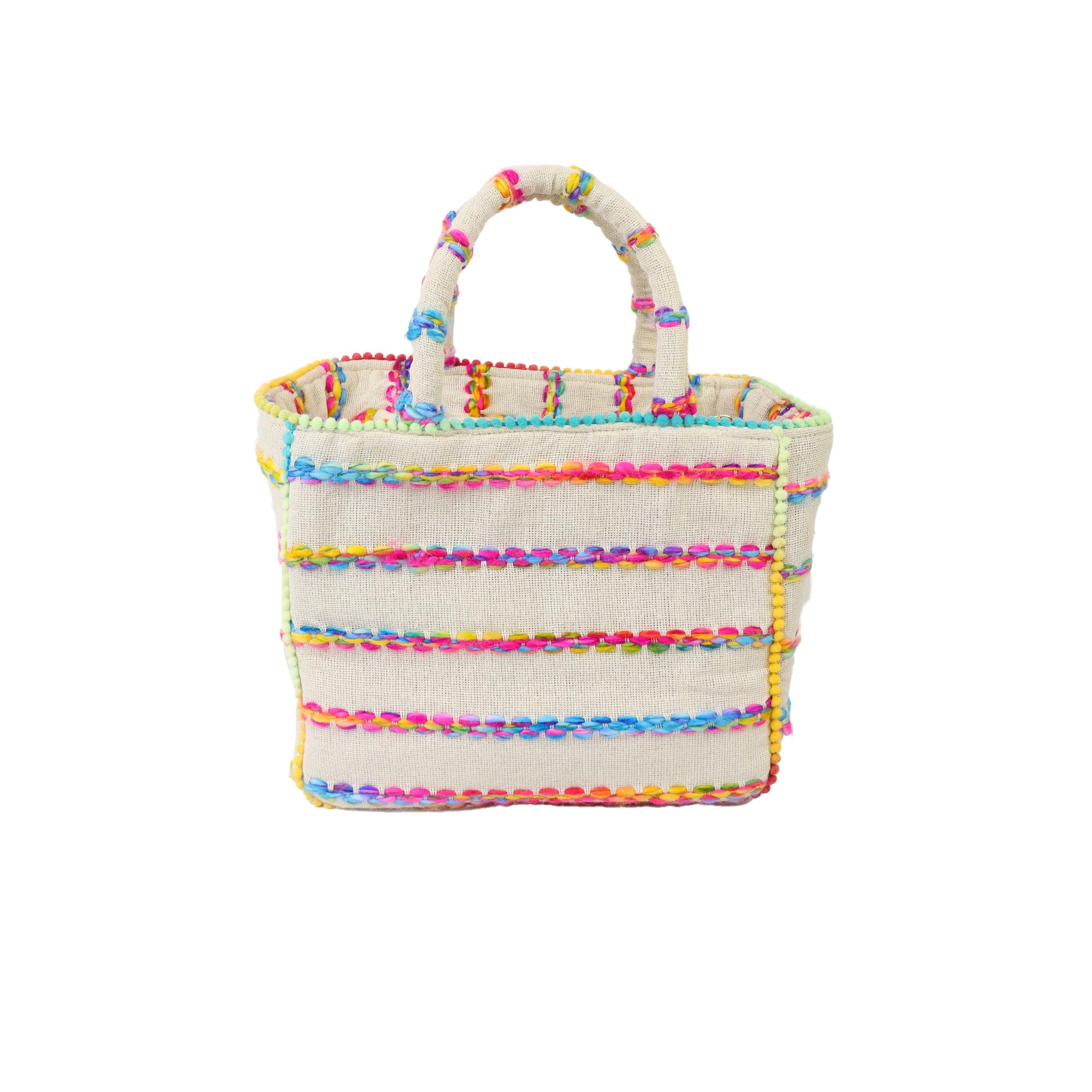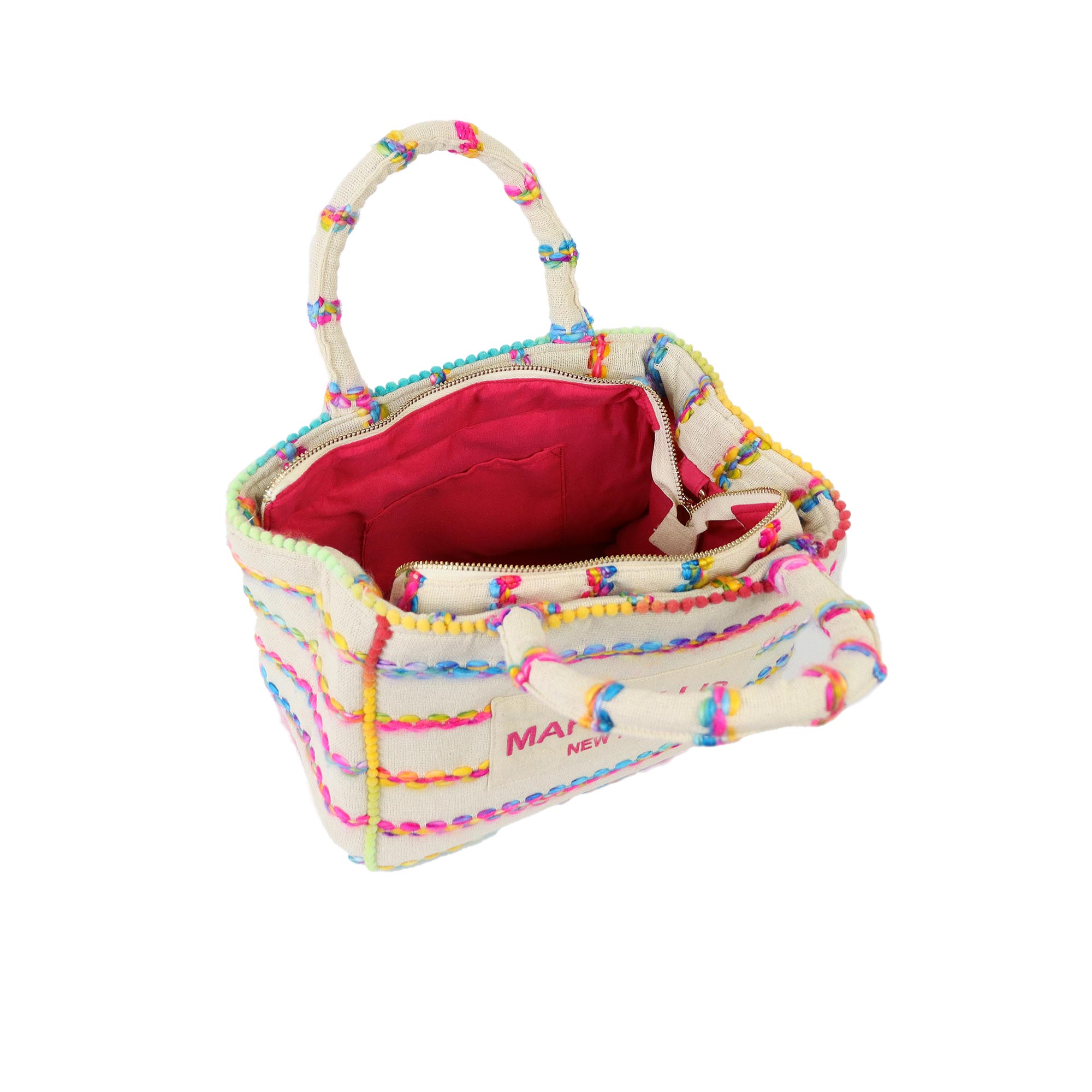 Borsa mare piccola beige BUBY S INDY di MARC ELLIS in canvas con cuciture e dettagli lungo i bordi multicolor. la borsa è dotata di una tracolla in tessuto regolabile e chiusura con cerniera. All'interno si compone di un unico scomparto avente una tasca aperta. Misure 31x24x15
