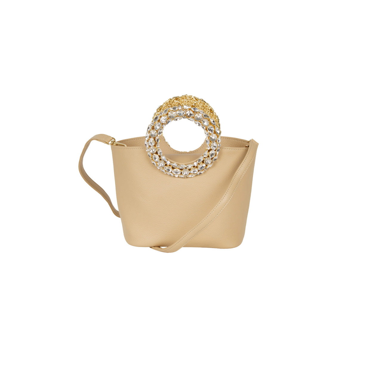 Borsa CIRCLE beige di SEBILLO in pelle bottalata con manico circolare in cristalli e tracolla interna. Misure 29x17x9cm.