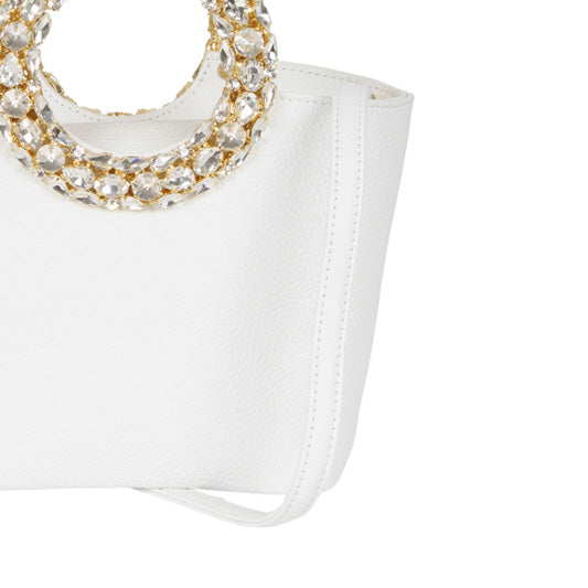 Borsa CIRCLE bianca di SEBILLO in pelle bottalata con manico circolare in cristalli e tracolla interna. Misure 29x17x9cm.