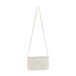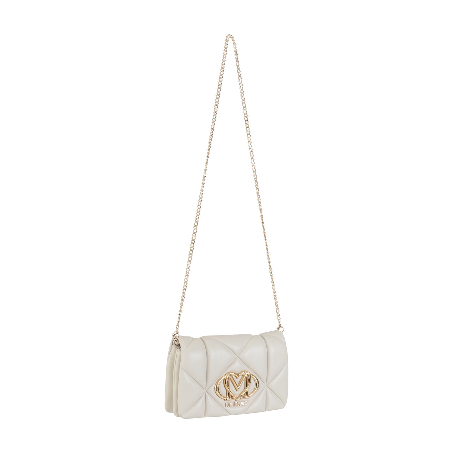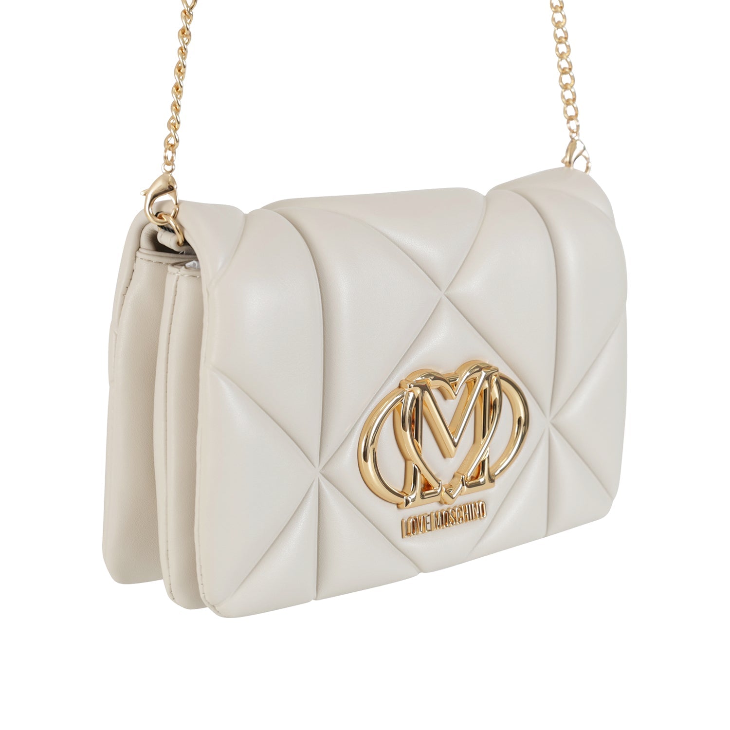 Borsetta a tracollina off white di LOVE MOSCHINO in ecopelle con effetto nappa trapuntato, chiusura con patta, logo in metallo oro, catena in metallo oro. Misure 24x15x5 cm.