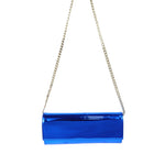 Clutch bluette di ALDO CASTAGNA in pelle con effetto specchiato, patta e tracolla interna con catena in metallo oro. Misure 24x10x4cm.