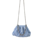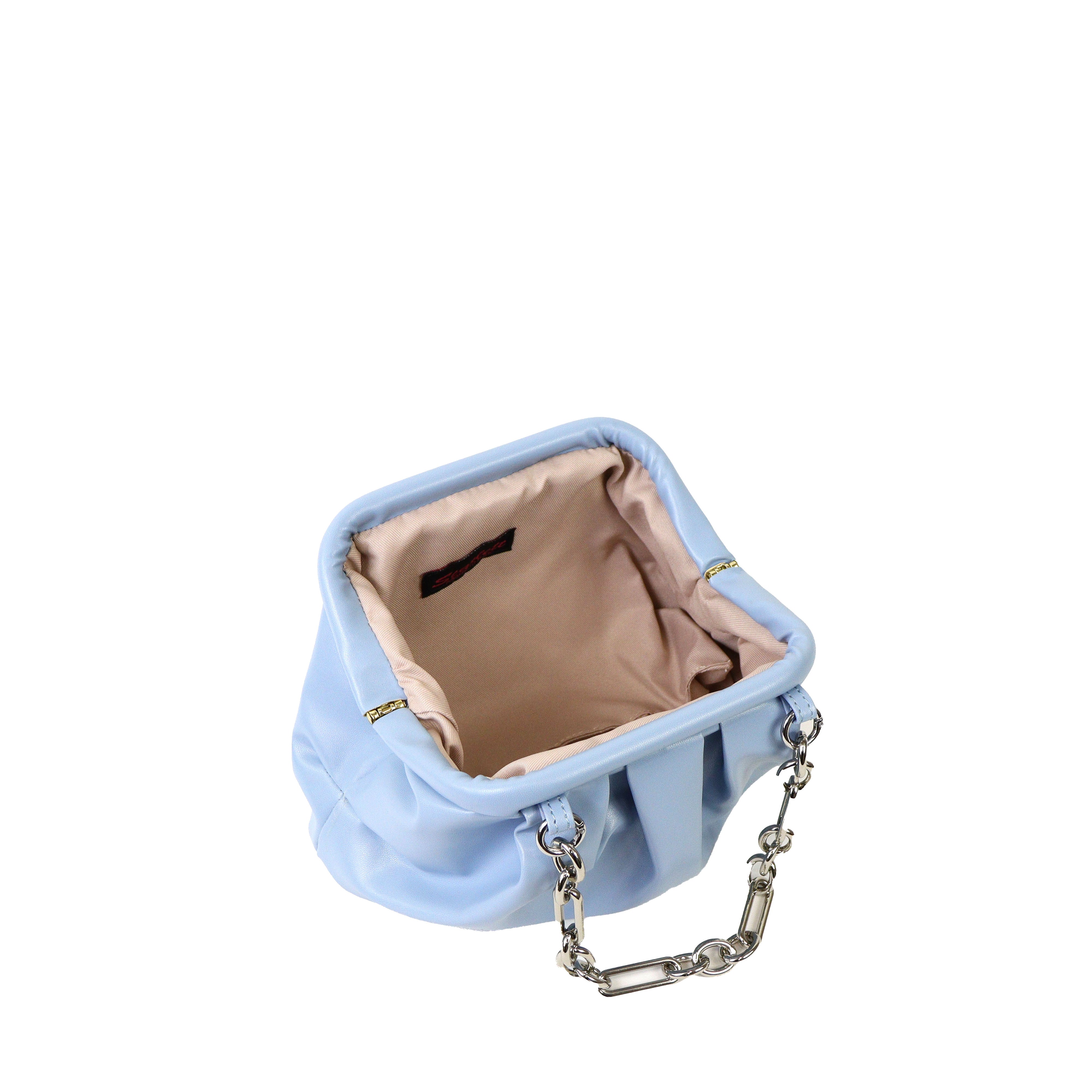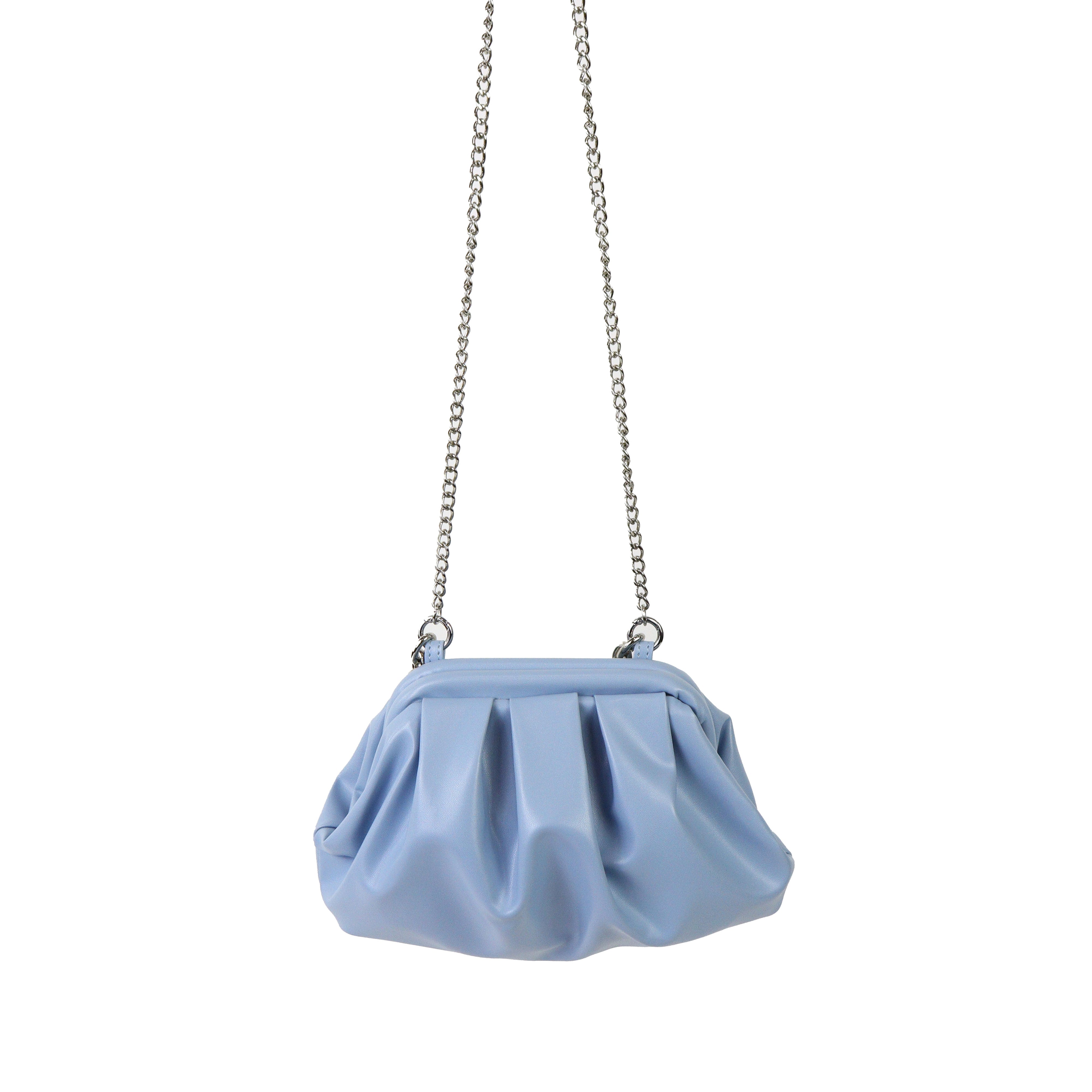 Borsetta c/arriccio azzurra in ecopelle di SCARLETT con manico a catena color argento e dotata di tracollina a catena color argento e chiusura a scatto. Misure 24x18x4 cm