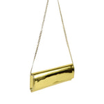 Clutch oro di ALDO CASTAGNA in pelle con effetto specchiato, patta e tracolla interna con catena in metallo oro. Misure 24x10x4cm.