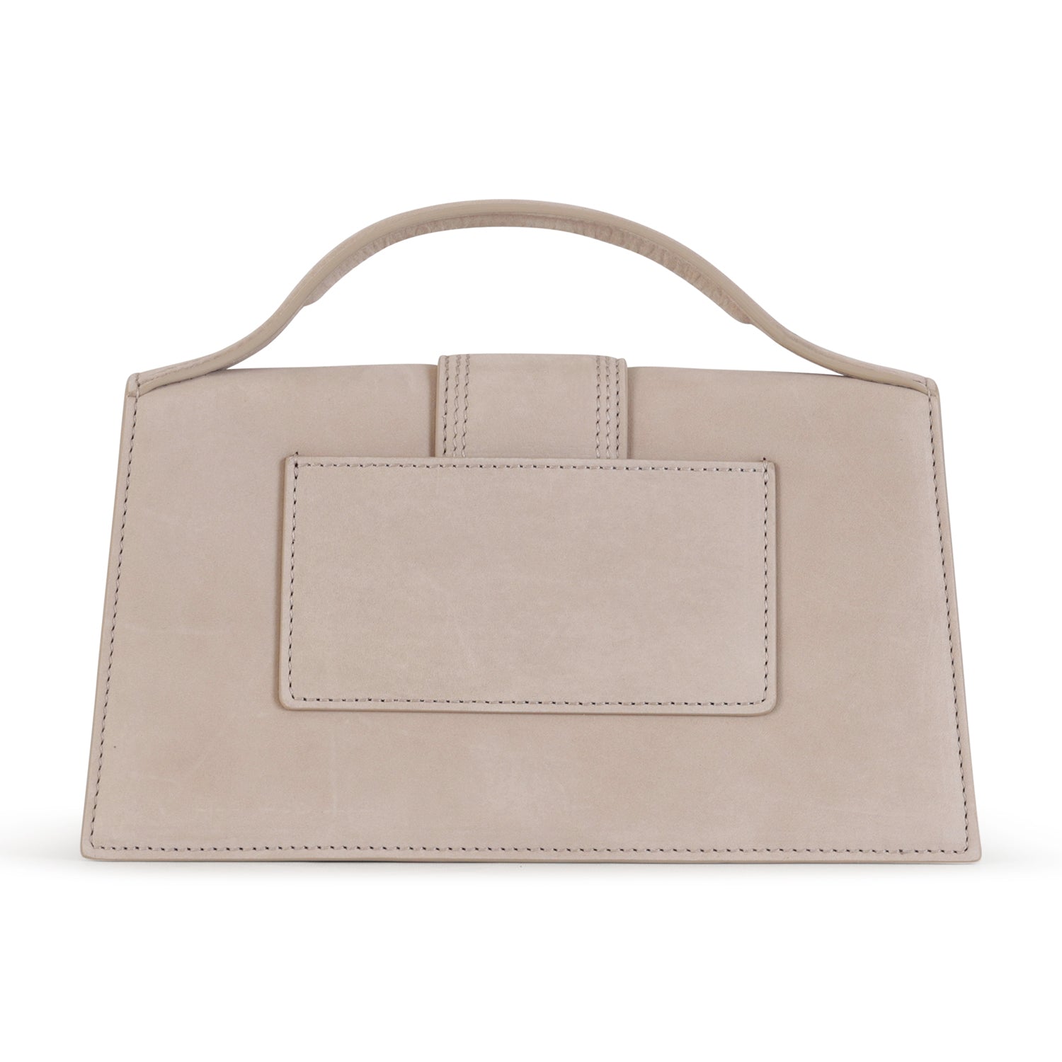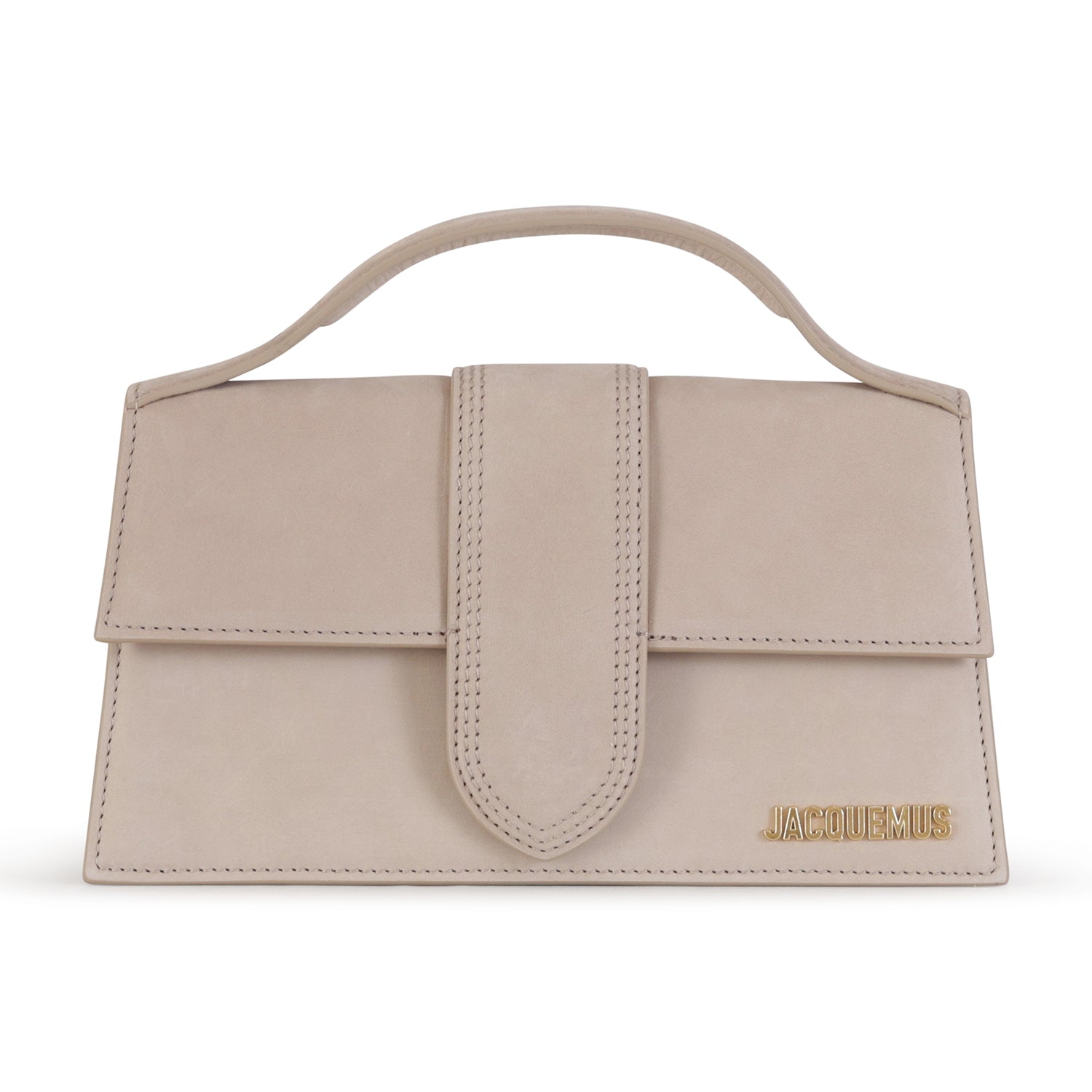 Le Grand Bambino beige di JACQUEMUS in camoscio con tracolla interna in camoscio in tinta, chiusura con patta, manico singolo e logo in metallo oro. Misura 24x13x8 cm.