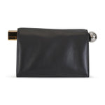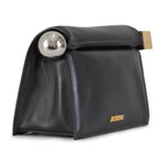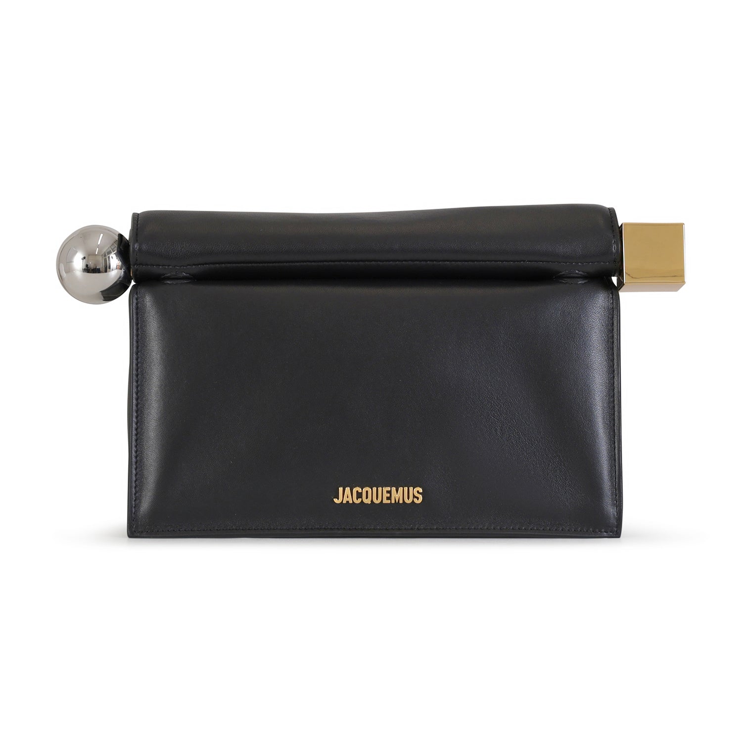 Le Pochette Rond nera di JACQUEMUS in pelle con chiusura con patta con clip, accessorio in metallo acciaio e oro, logo in metallo oro. Misura 27x18x12 cm.