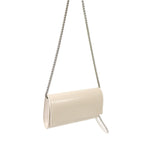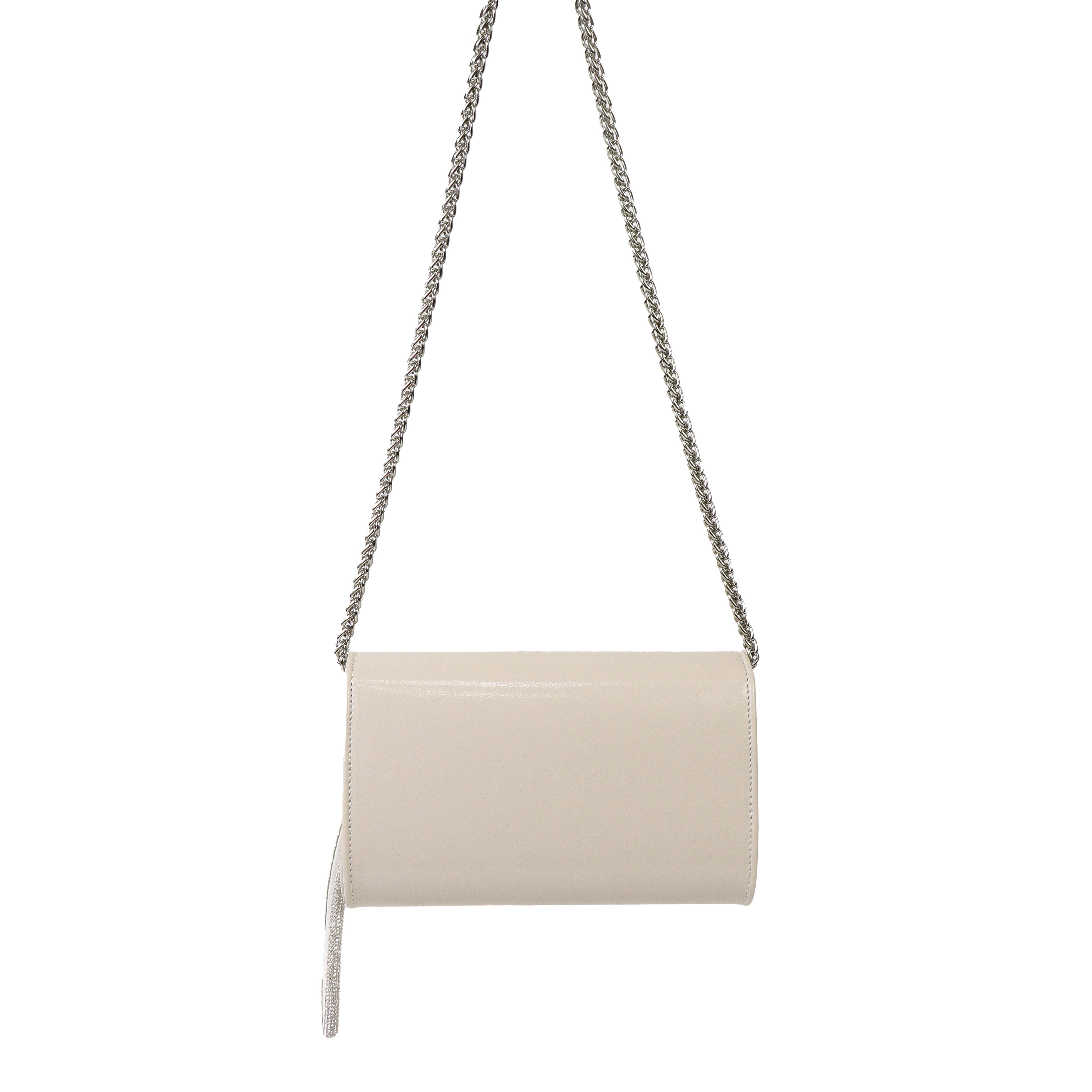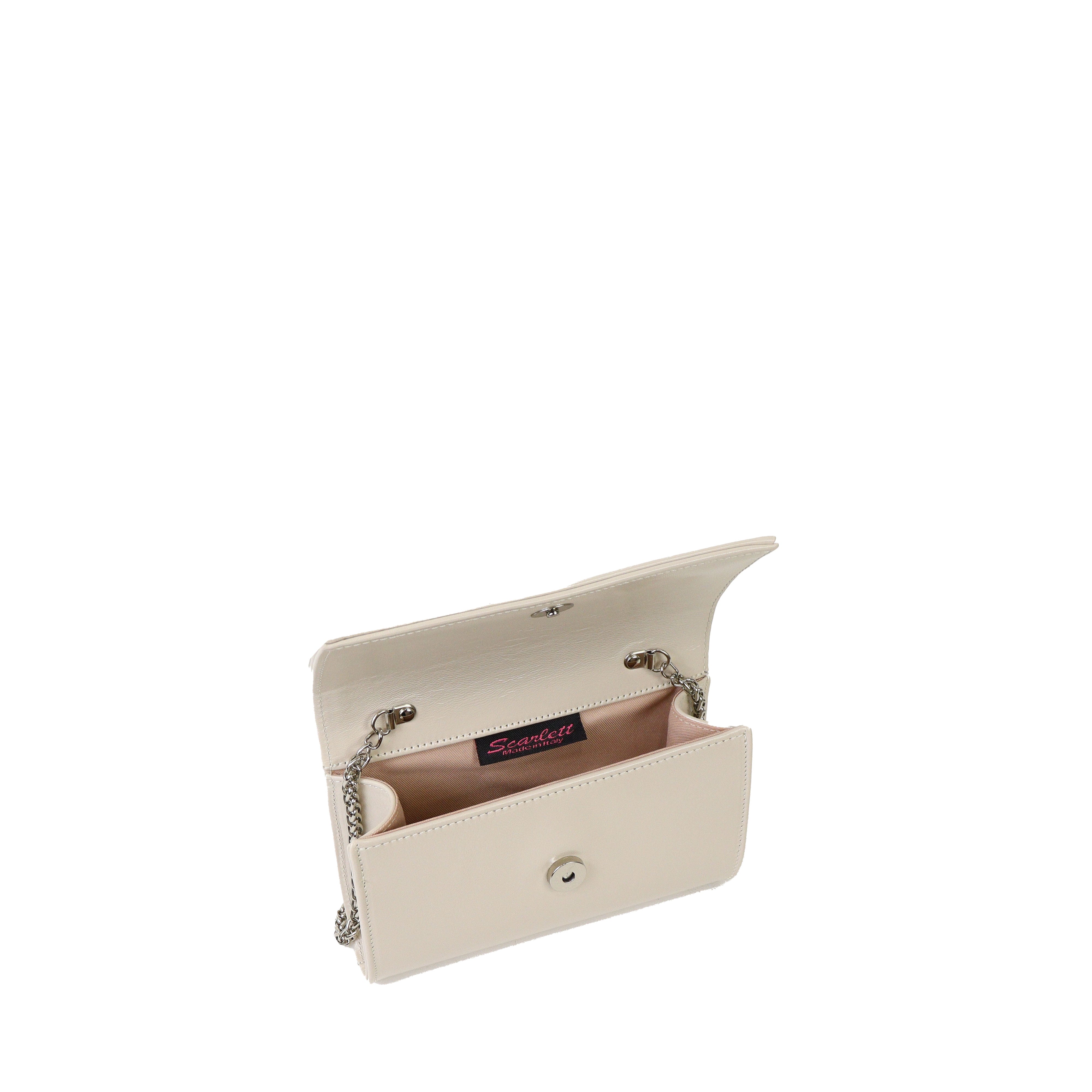 Pochette ghiaccio in vernice di SCARLETT con patta, tracollina a catena color argento, manico con gancio removibile con strass color argento e chiusura con clip. Misure 19x11x5 cm