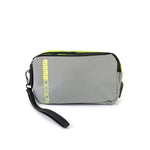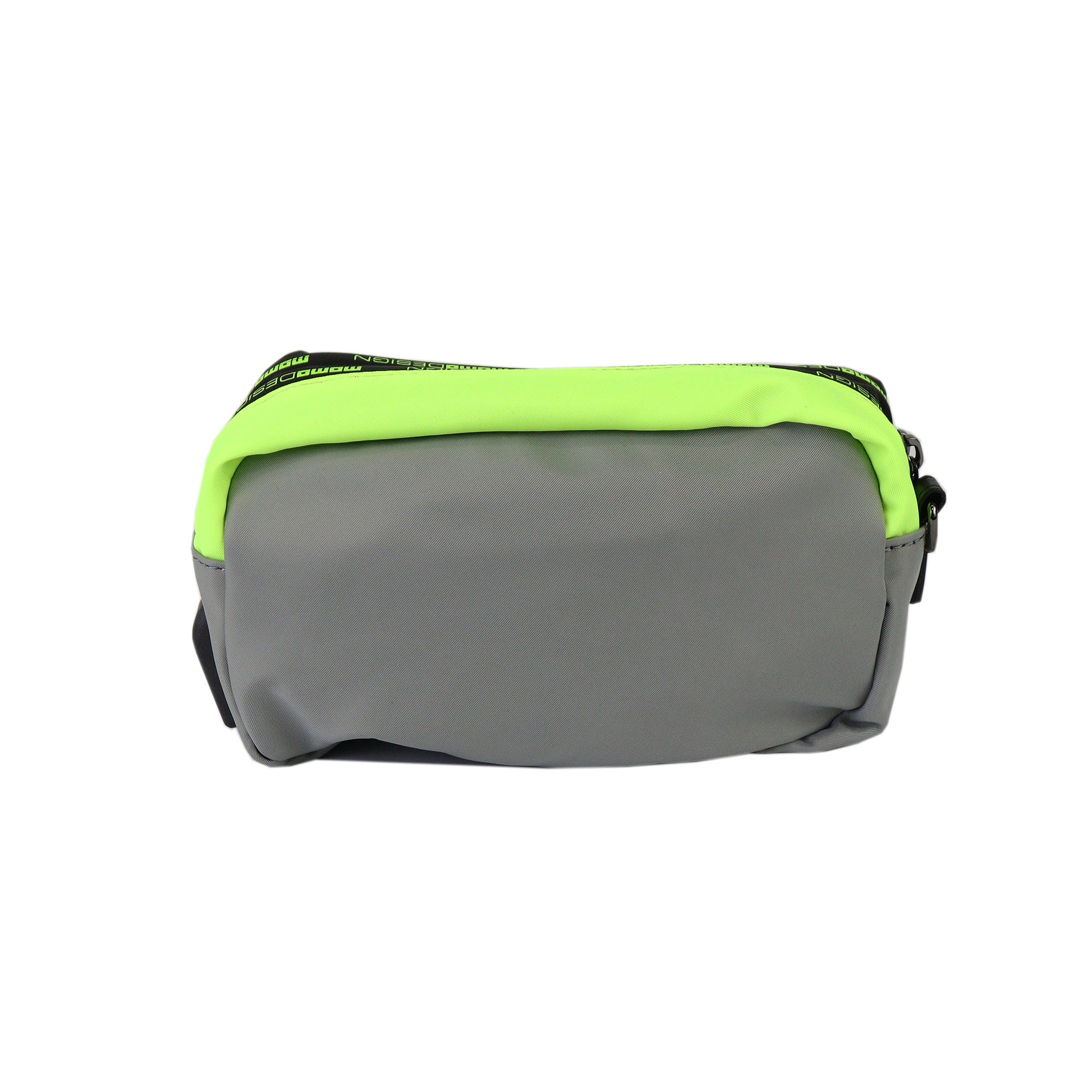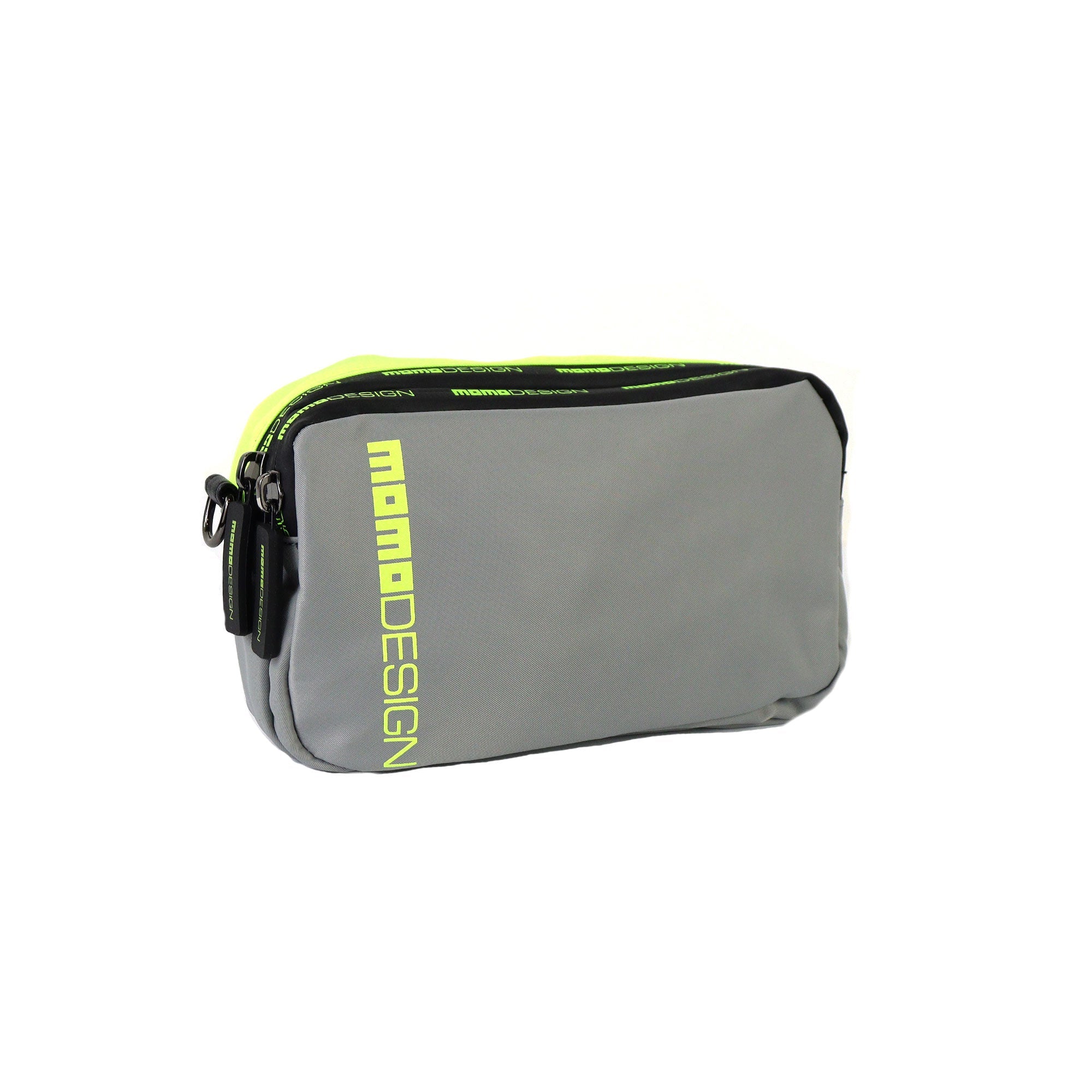 Pochette grigia , giallo fluo e nera di MOMODESIGN in tessuto. La pochette si compone di due scomparti con zip, uno dei quali dotato di taschino interno aperto, di un manico removibile in pelle nero e logo su tessuto giallo fluo. Misure 20x13x6 cm
