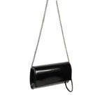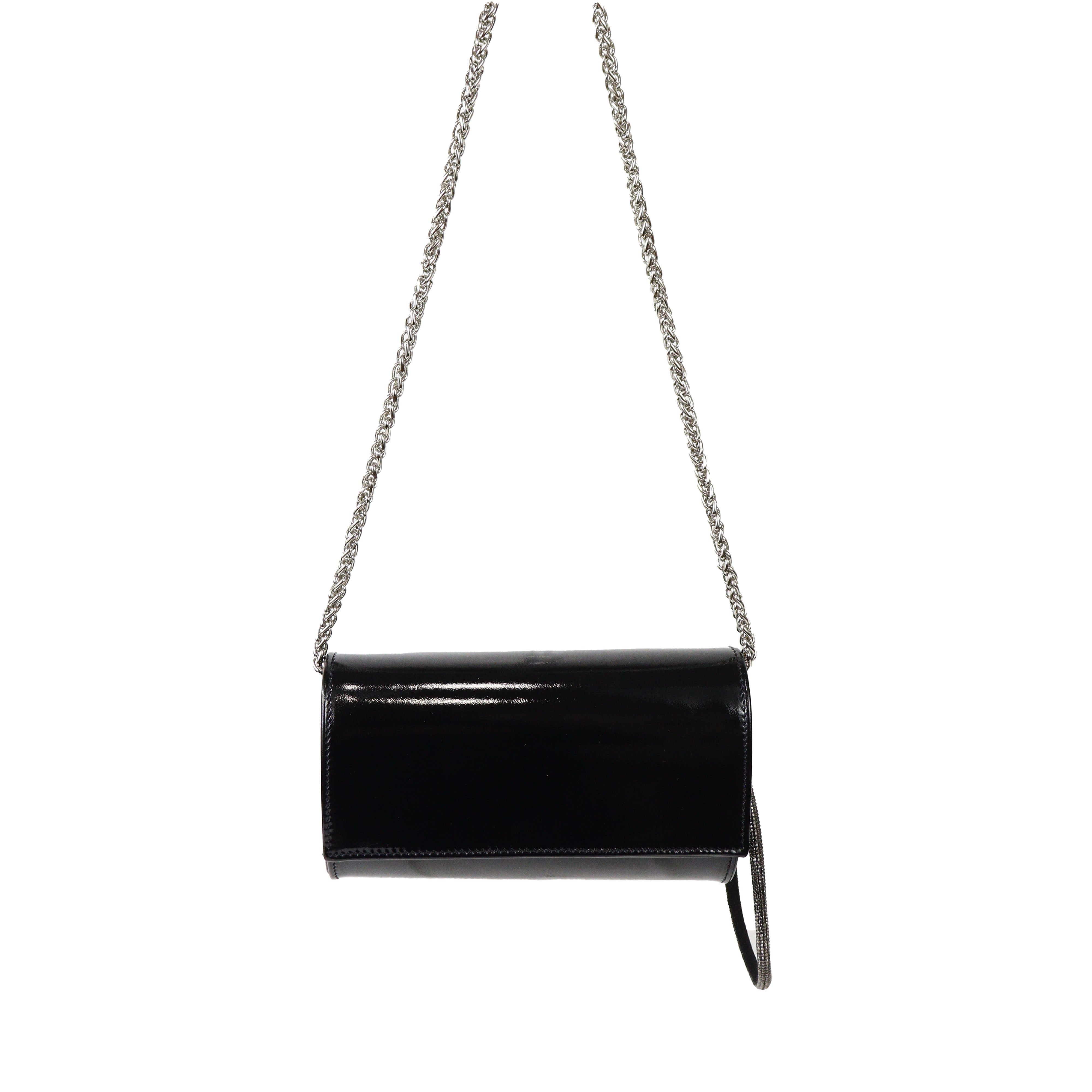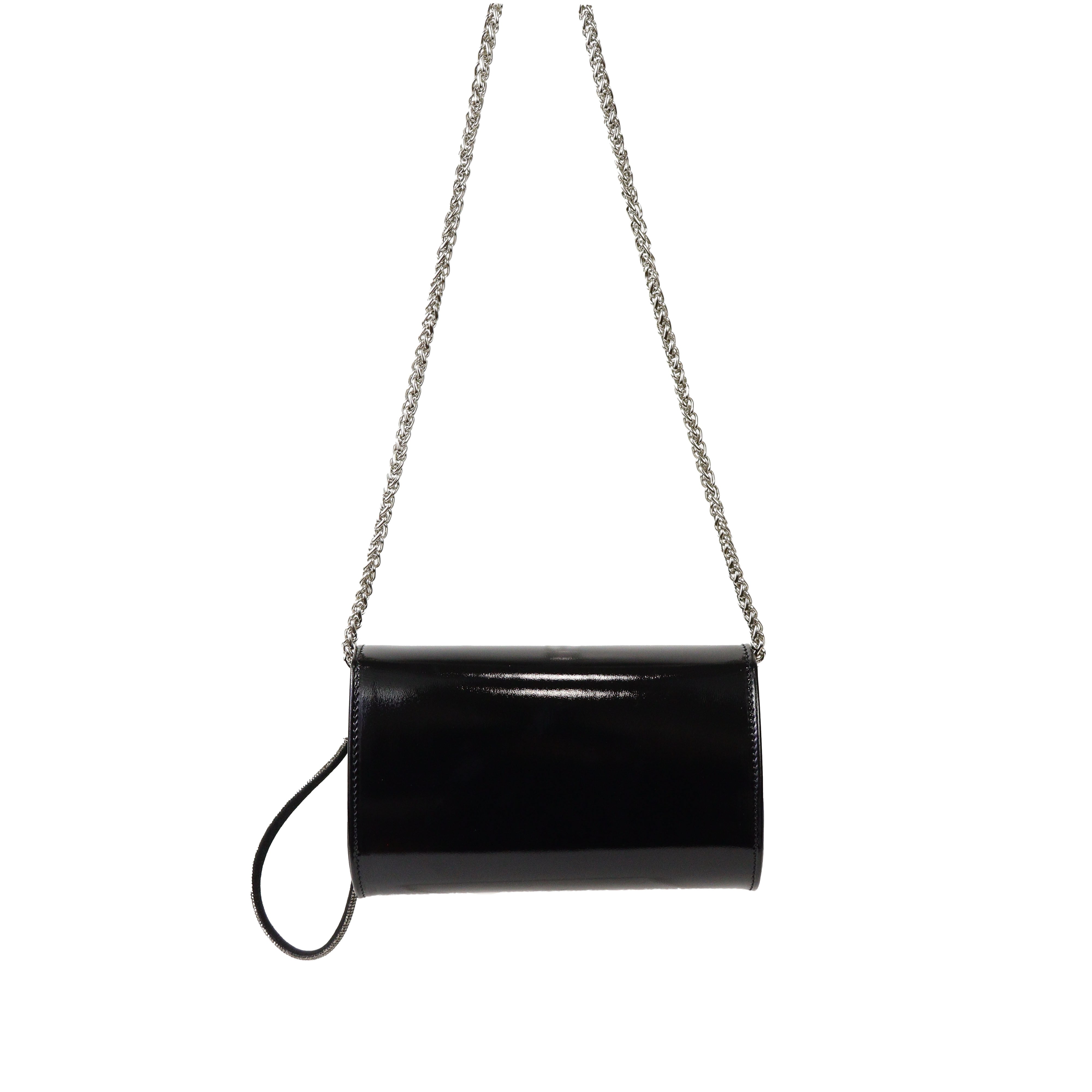 Pochette nera in vernice di SCARLETT con patta, tracollina a catena color argento, manico con gancio removibile con strass color nero e chiusura con clip. Misure 19x11x5 cm
