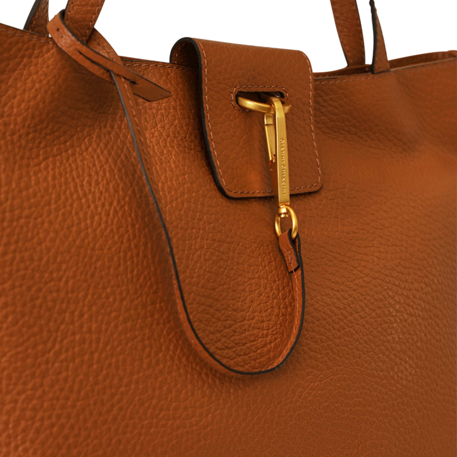 Shopping cuoio di GIANNI CHIARINI in pelle con effetto martellato, chiusura con mini patta, doppio manico, logo a fuoco in color oro, accessori in metallo oro. Misure 42x31x18 cm.