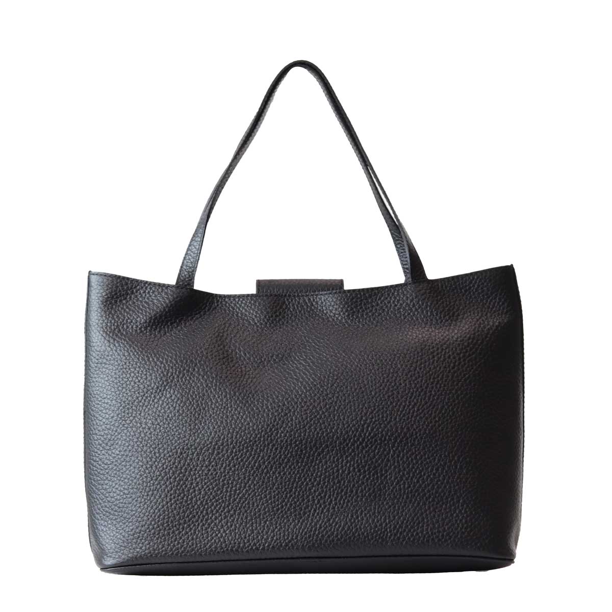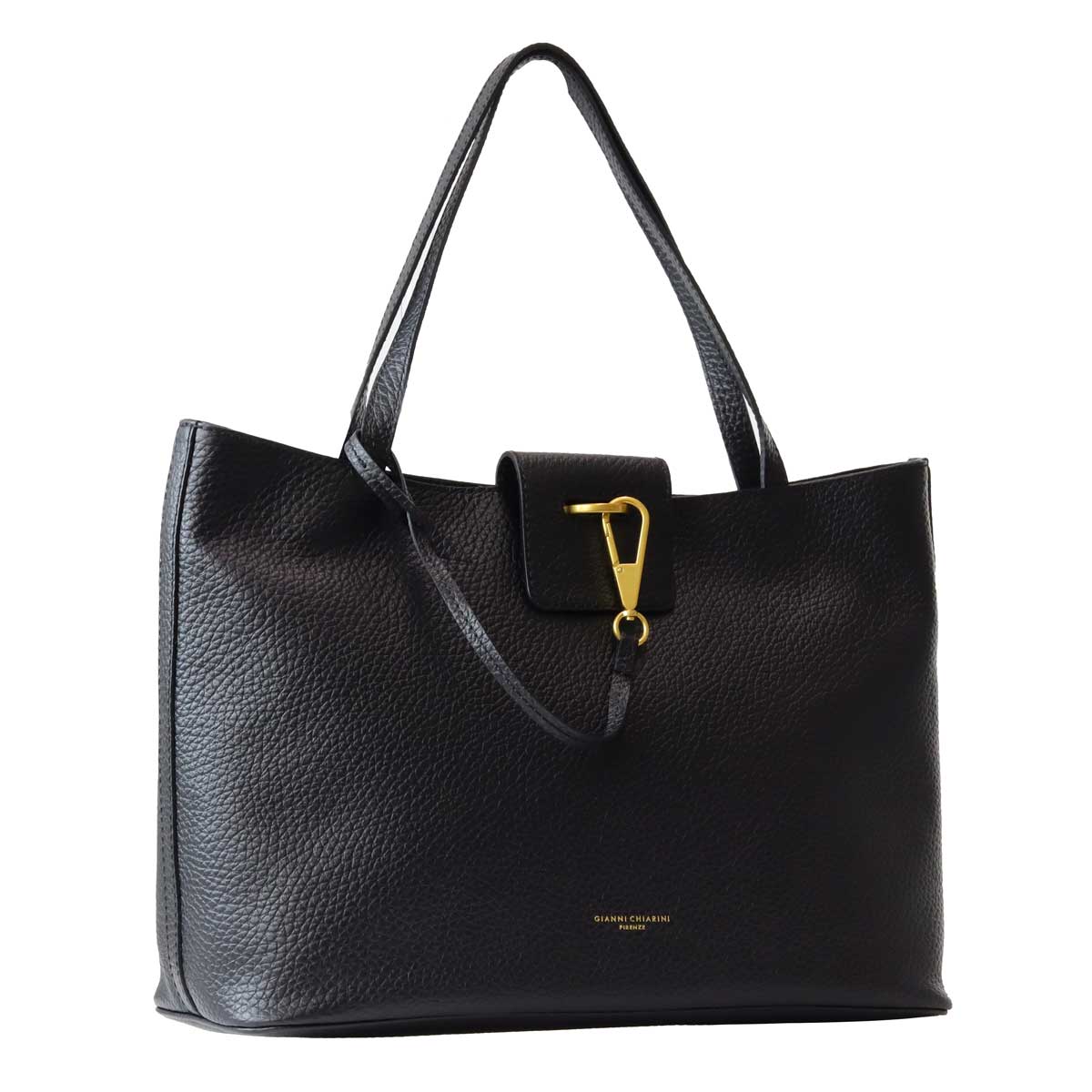 Shopping nera di GIANNI CHARINI in pelle con effetto martellato, chiusura con mini patta, doppio manico, logo a fuoco in color oro, accessori in metallo oro. Misure 42x31x18 cm.