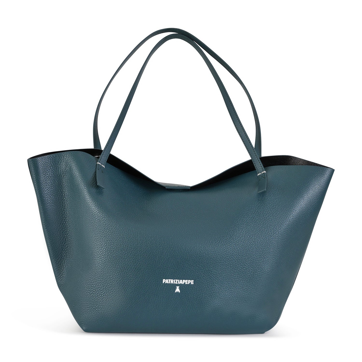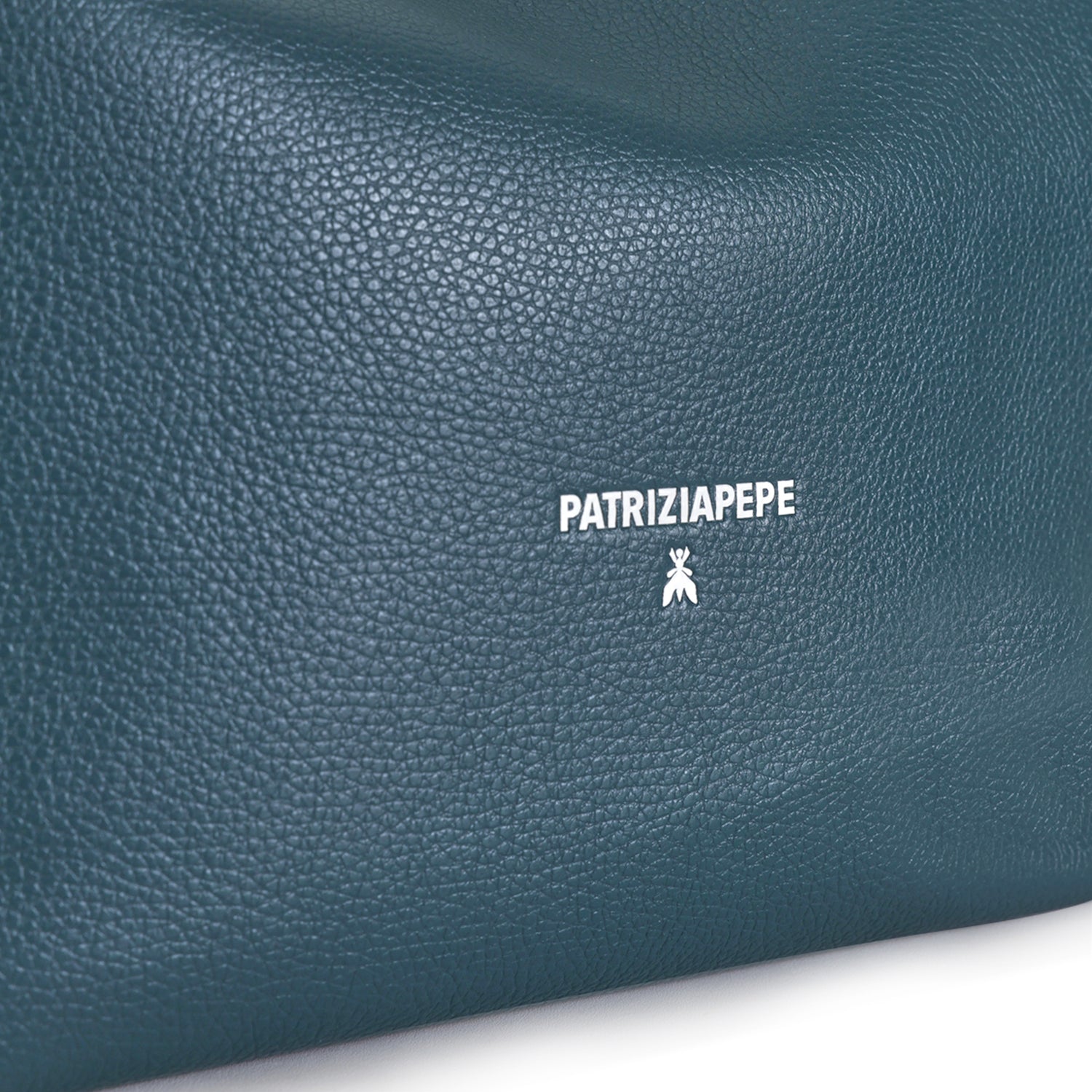 Shopping verde di PATRIZIA PEPE in pelle con effetto martellato, chiusura con bottone, doppio manico, logo e pochette interna Misure 57x31x15 cm.