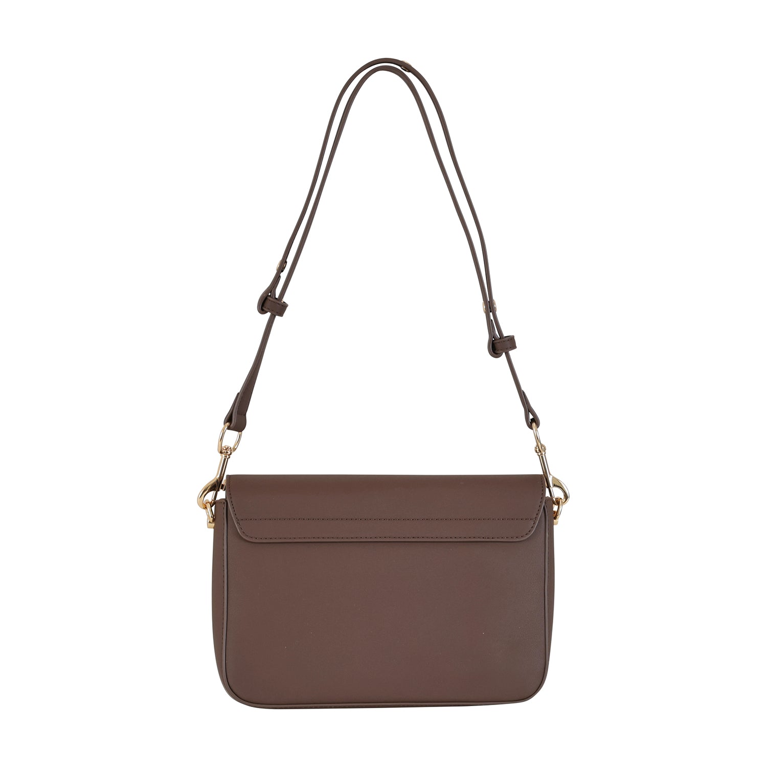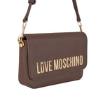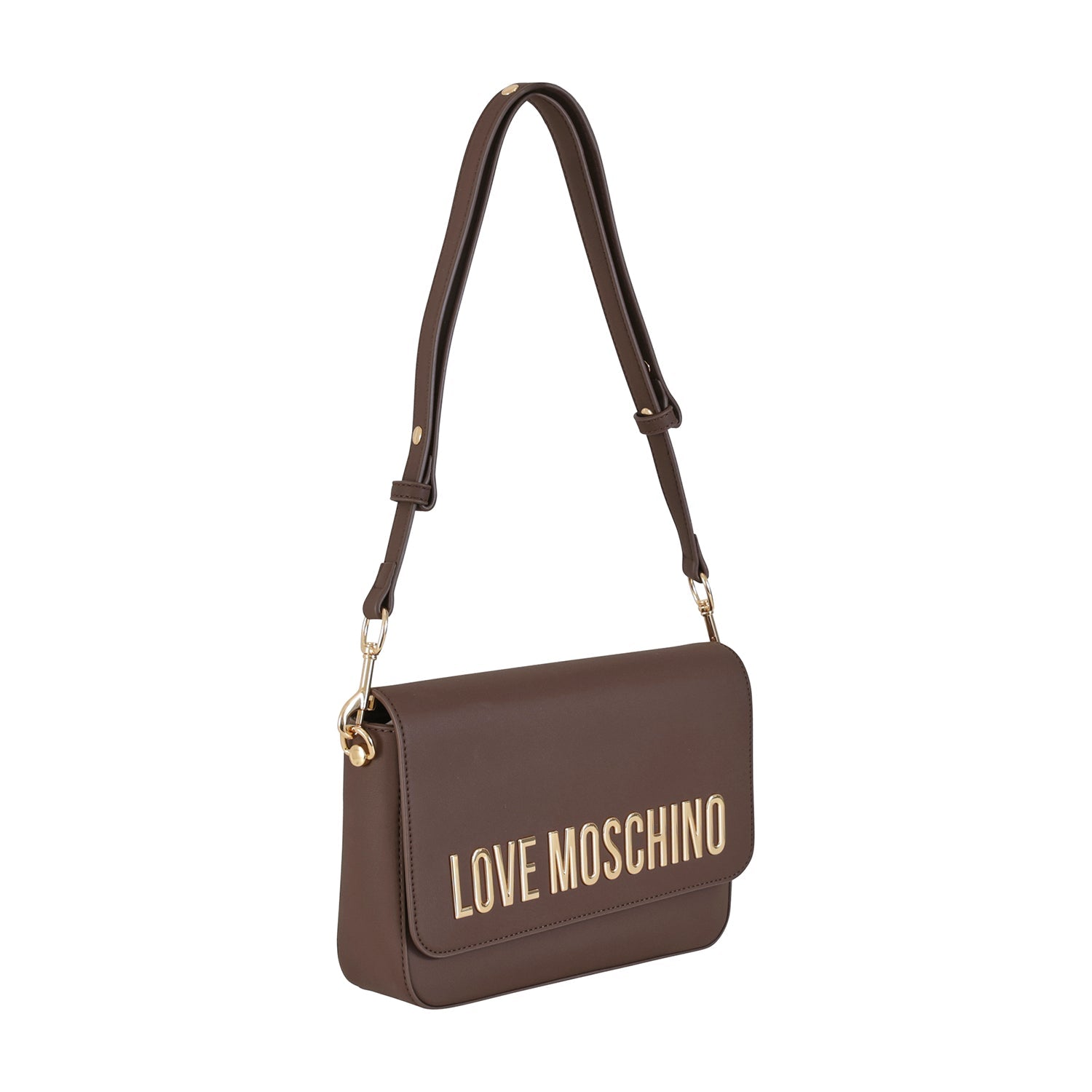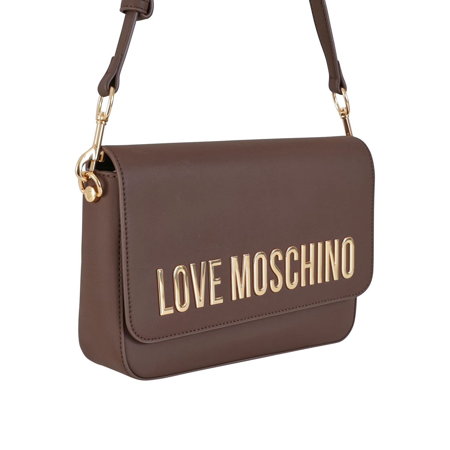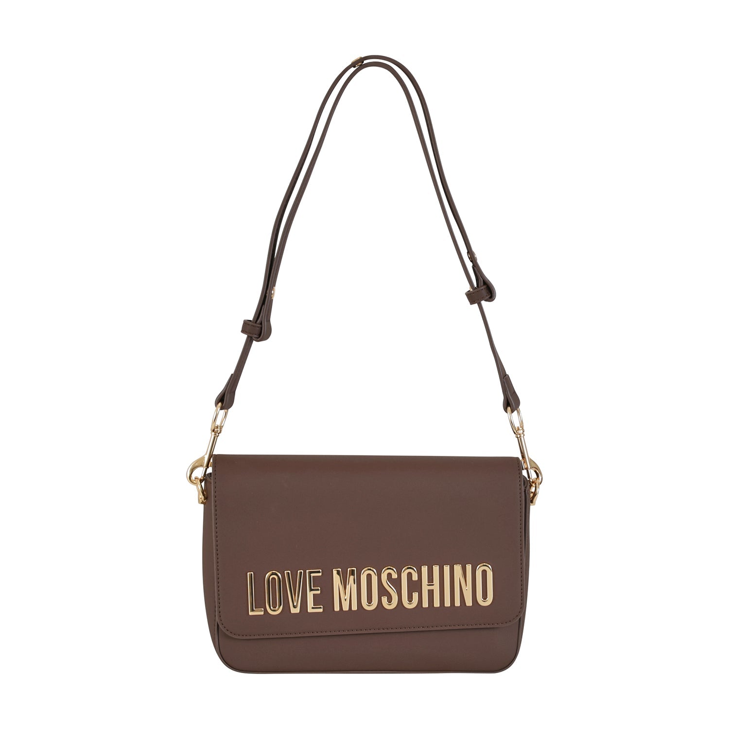Tracolla marrone di LOVE MOSCHINO in ecopelle con chiusura con patta, logo lettering in metallo oro. Misure 24x16x8 cm.