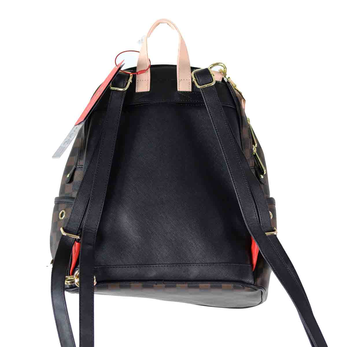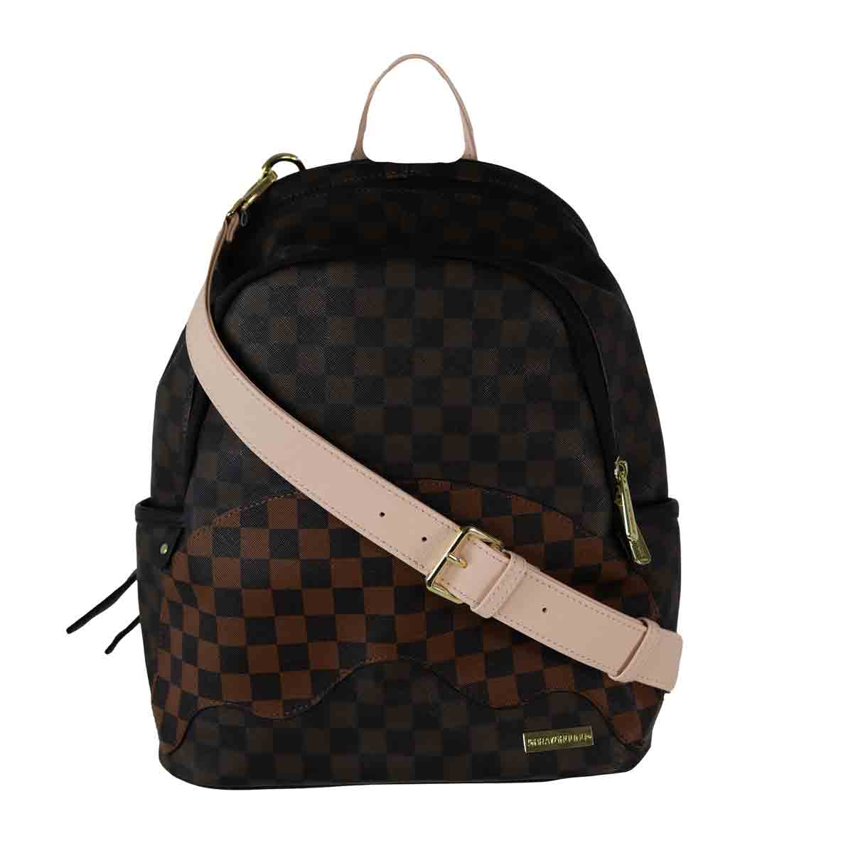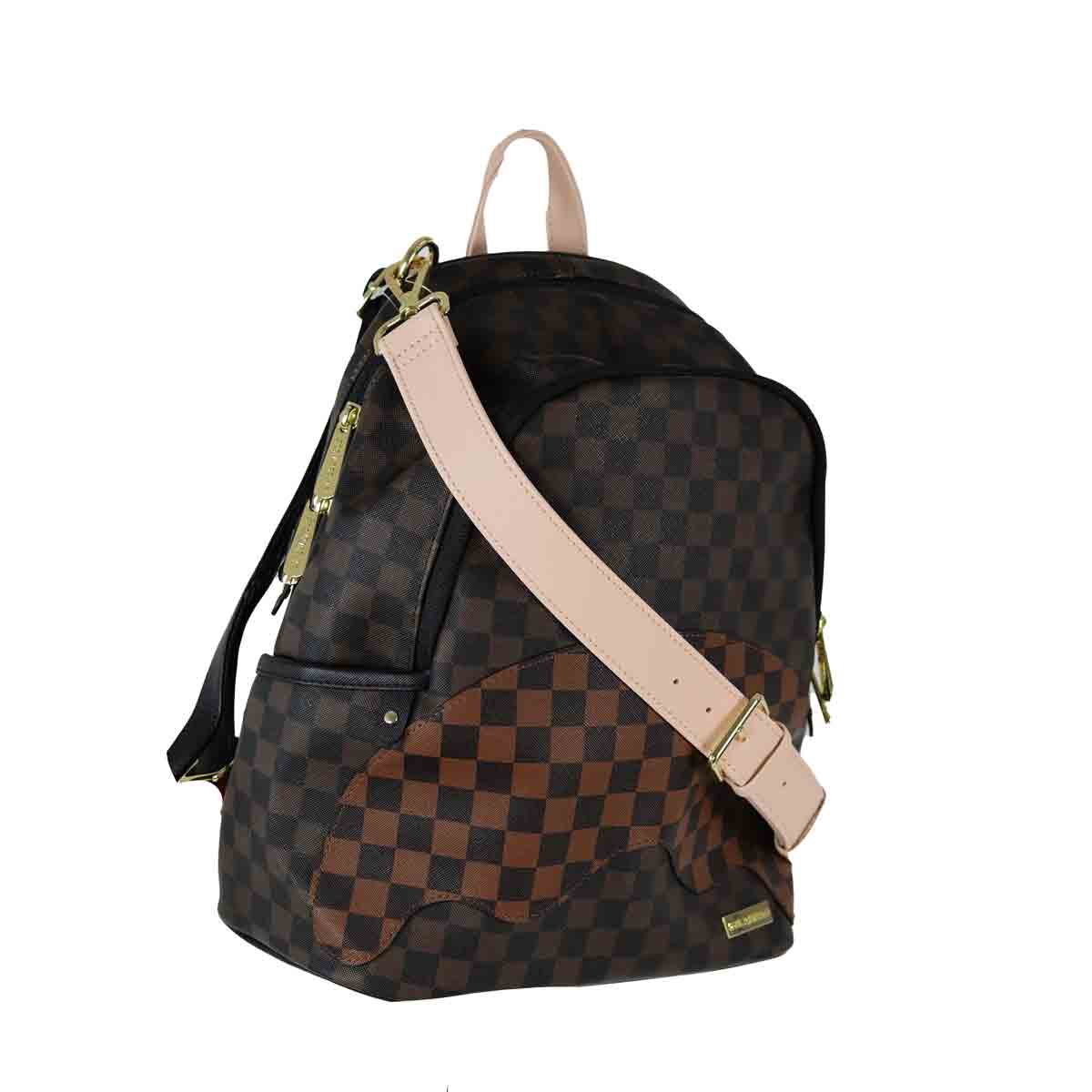 Zaino marrone di SPRAYGROUND in ecopelle con doppio scomparto e fibbia in beige. Misure 32x45x18cm.