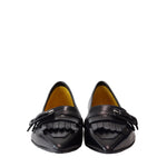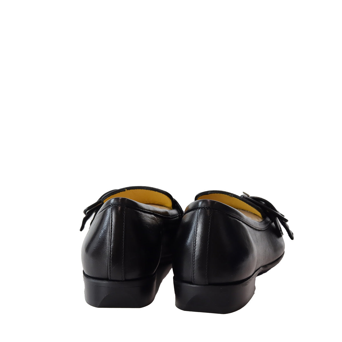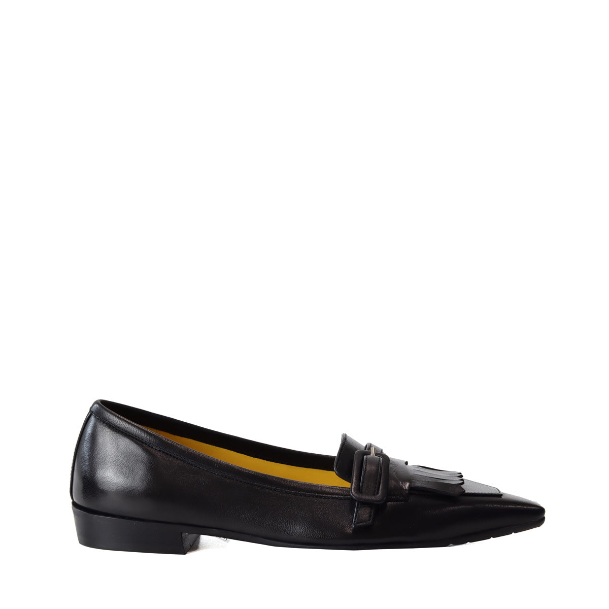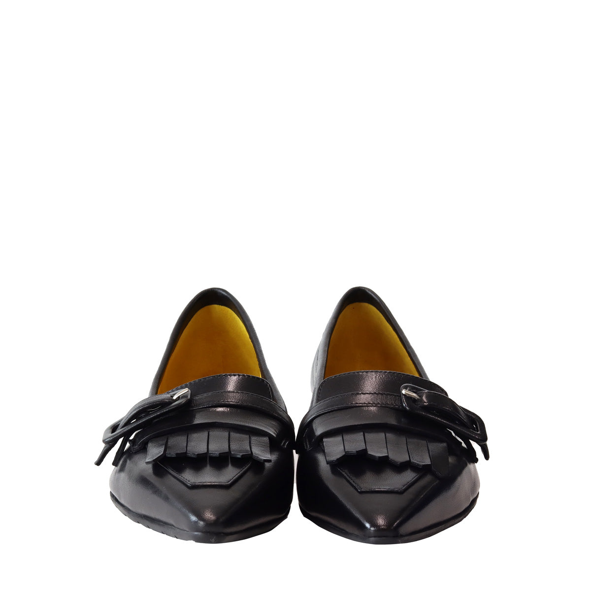 Ballerina MILENA nera di MARA BINI in pelle seta con frangia e fibbia in tinta, forma appuntita e fondo in gomma con tacco 15mm in cuoio.