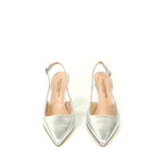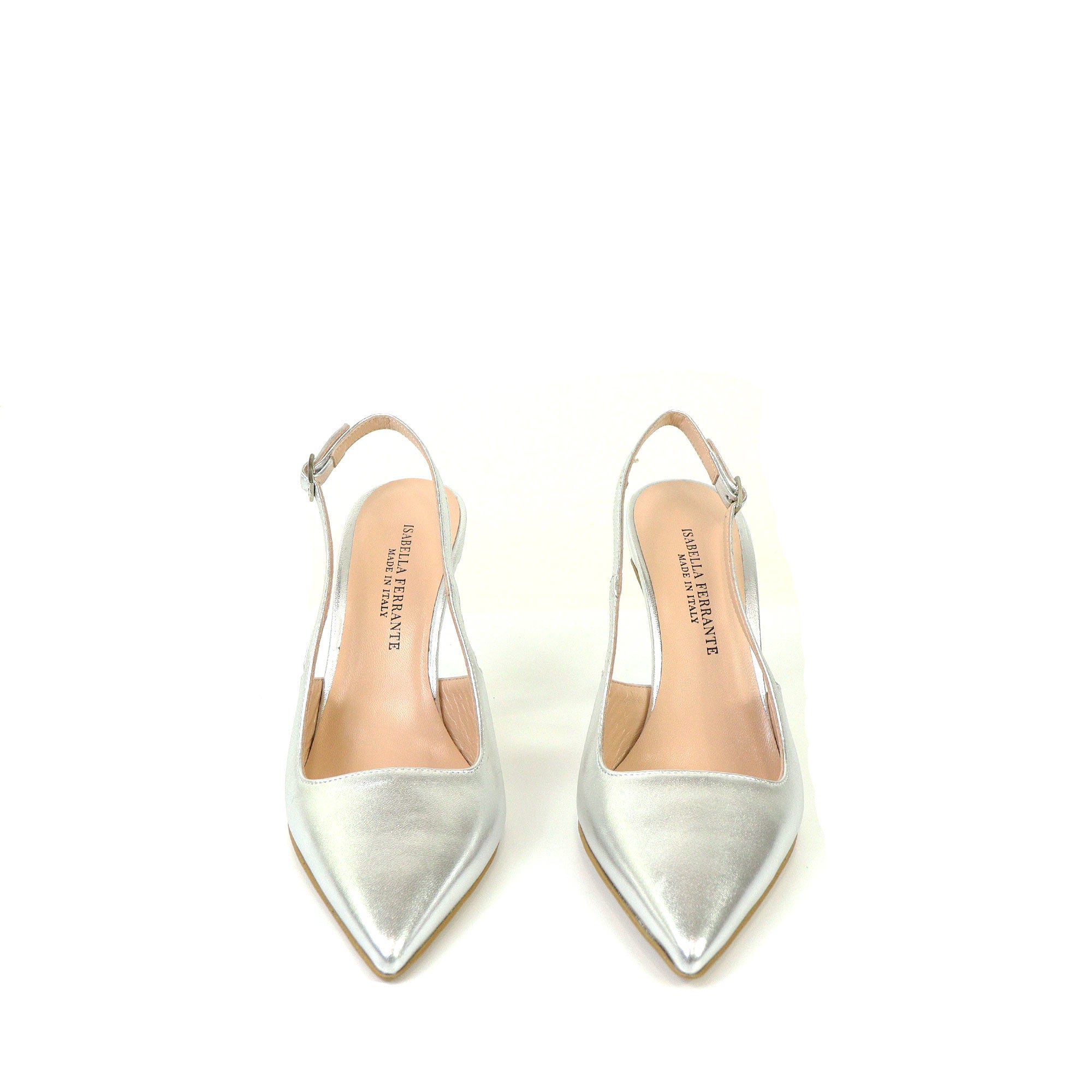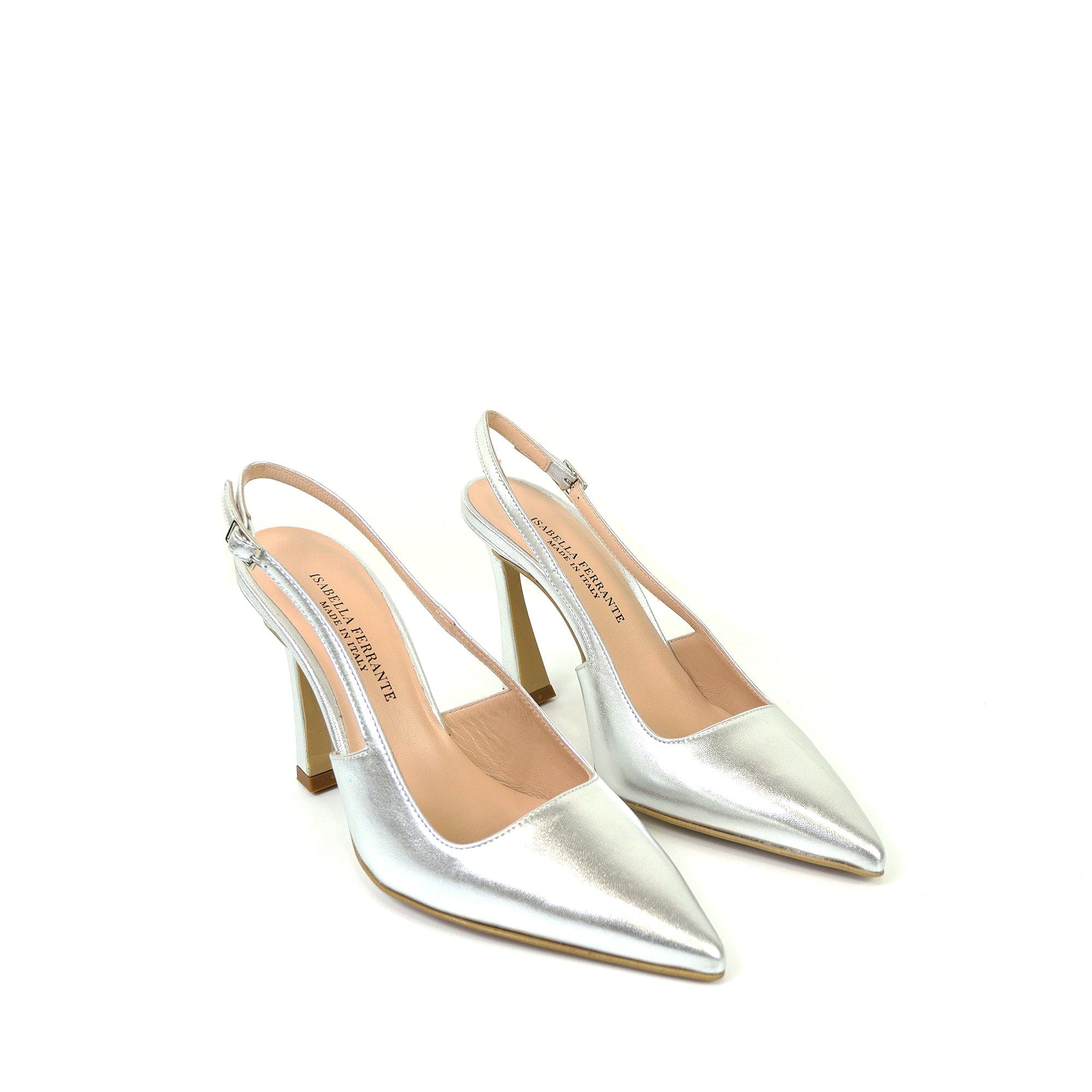 Slingback argento di ISABELLA FERRANTI in pelle laminata. Il design raffinato e versatile è caratterizzato da una punta affusolata elegante, cinturino regolabile e tacco di 110 mm.