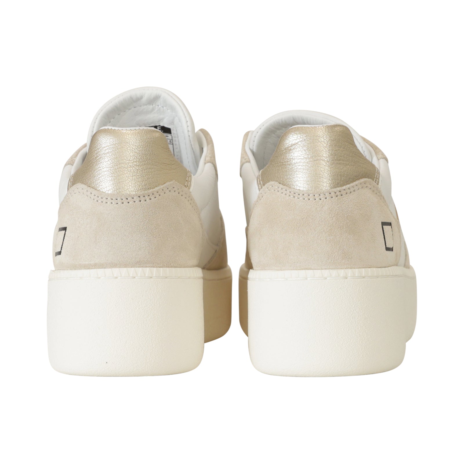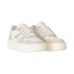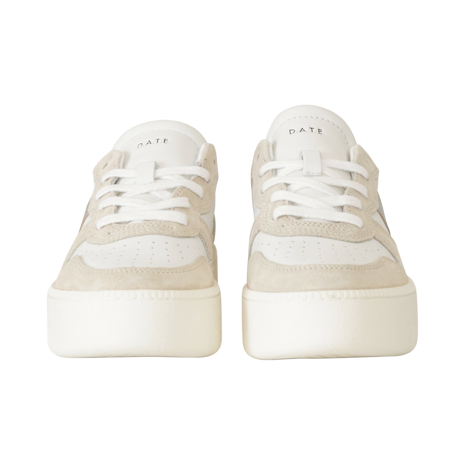 Sneakers COURT PLATFORM bianca di DATE in pelle con bordi in camoscio beige, tallone in pelle platino, profili in pelle laminata argento. Punta microforata. Fondo in gomma platform alto 30mm.