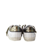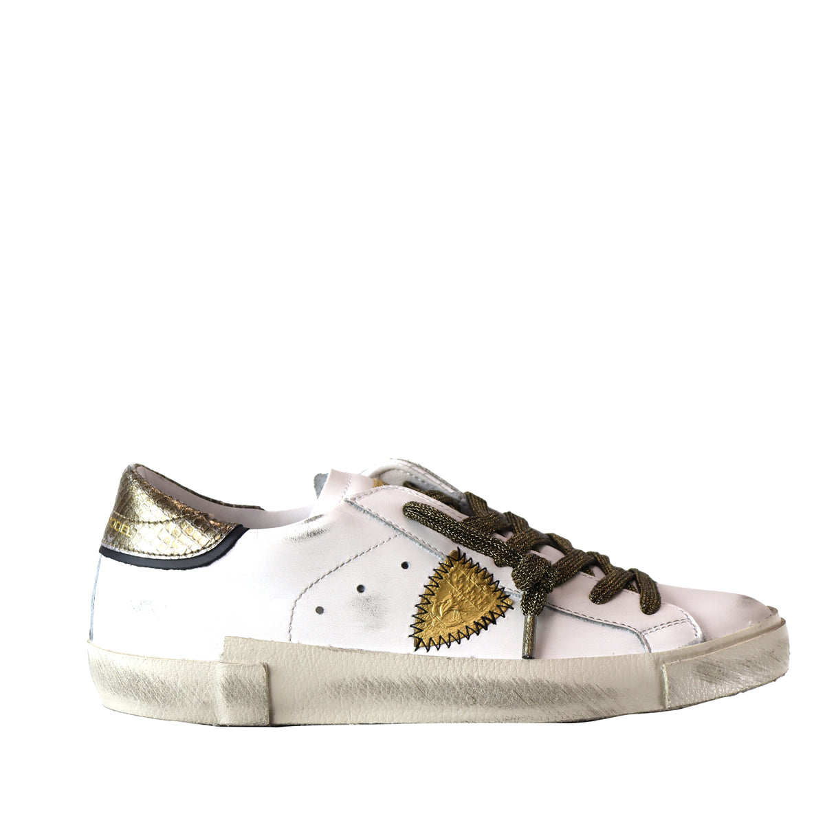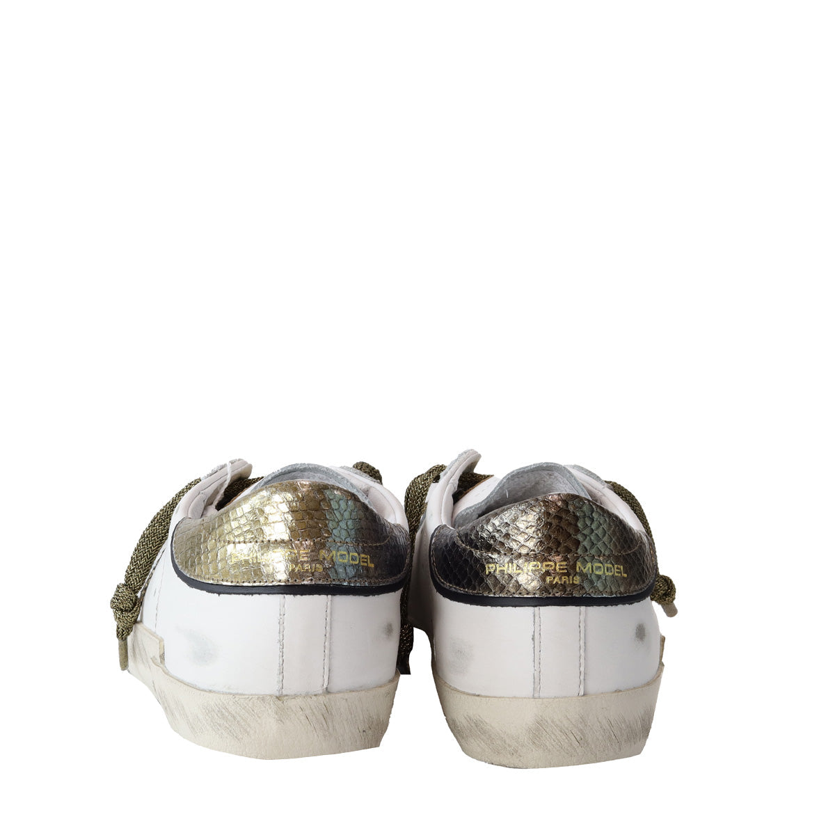 Sneakers PARIS bianca di PHILIPPE MODEL in pelle con scudetto logo in oro e tallone in pelle pitonata bronzo. Fondo in gomma in bianco con effetto used.