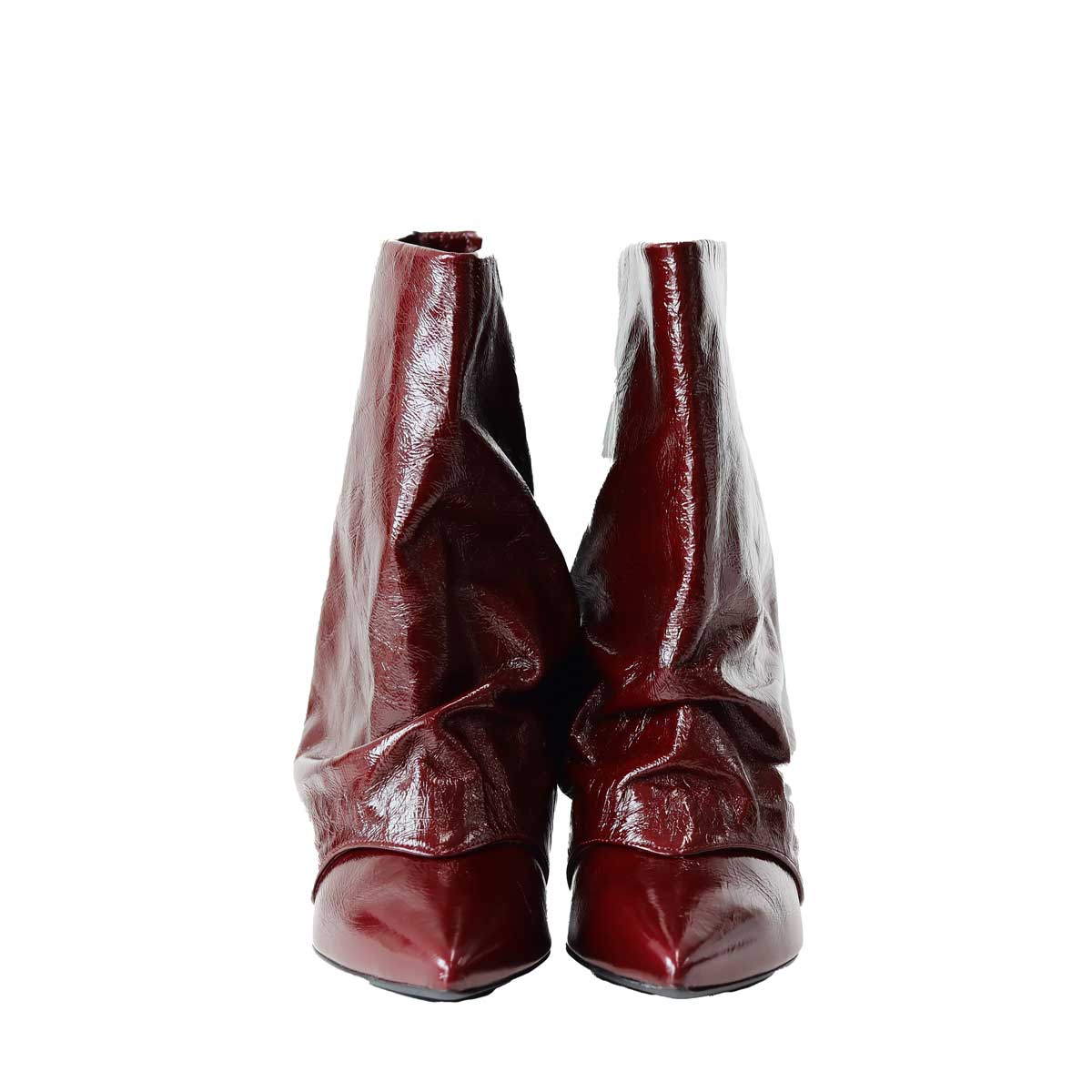 Stivaletto ALIANA bordeaux di ALCHIMIA in vernice con effetto crash e risvolto sul gambale. Tacco 50mm con fondo in gomma.