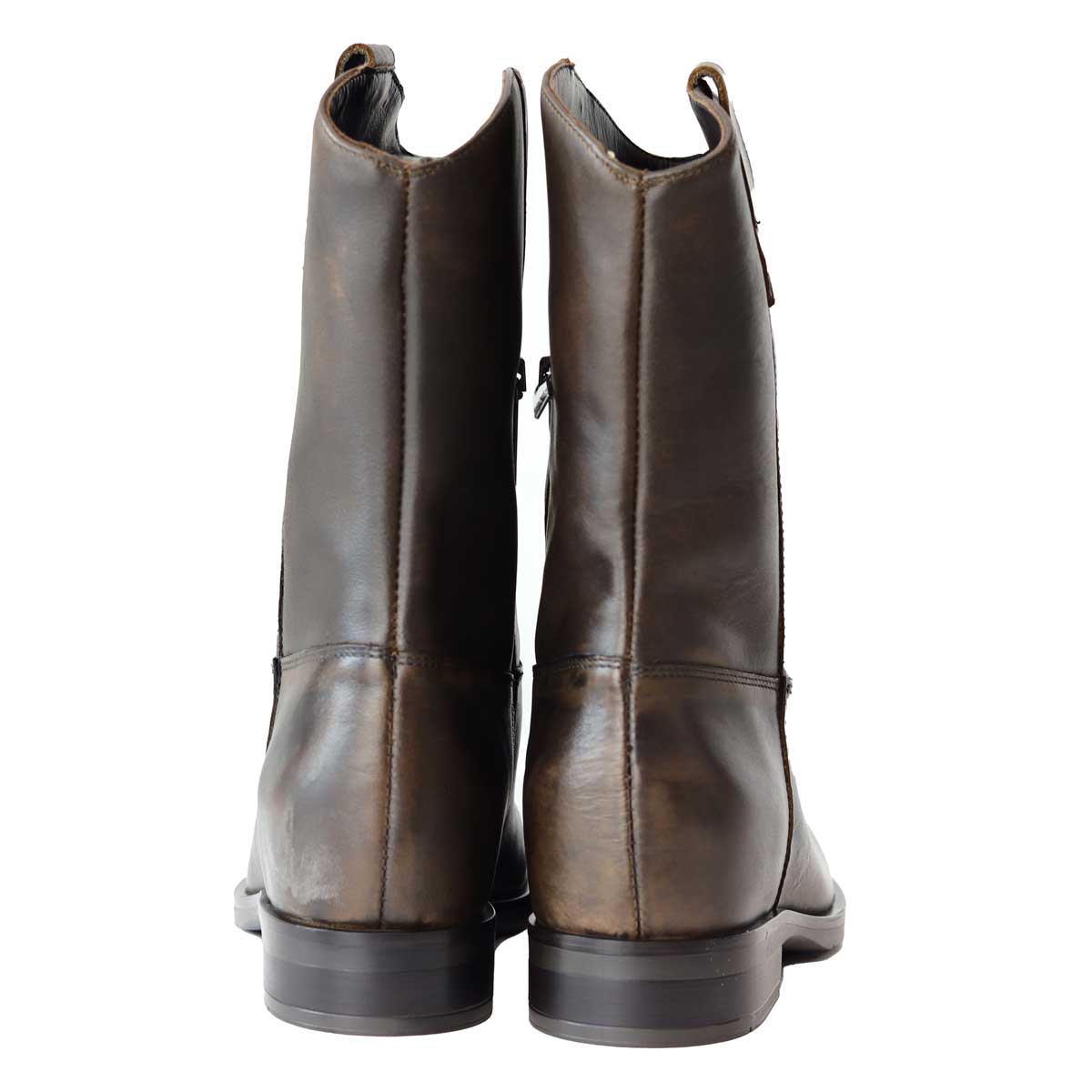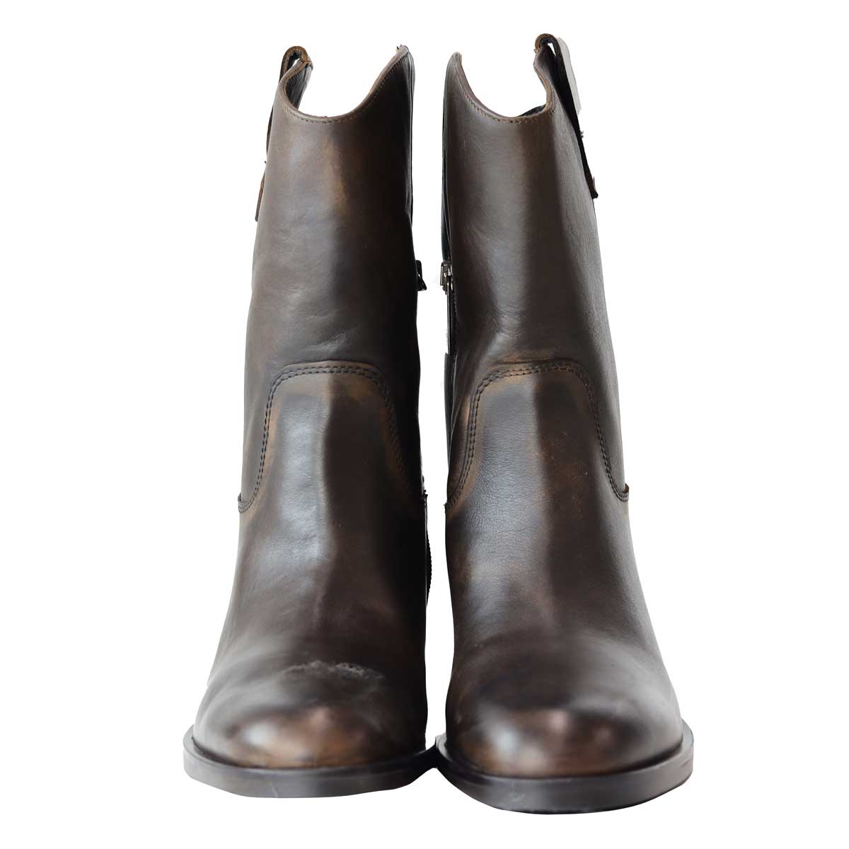 Stivaletto KIM LOW marrone di CARMENS in pelle con effetto anticato, punta arrotondata, tomaia stile texano e zip interna. Tacco 20mm e zeppa interna 30mm.
