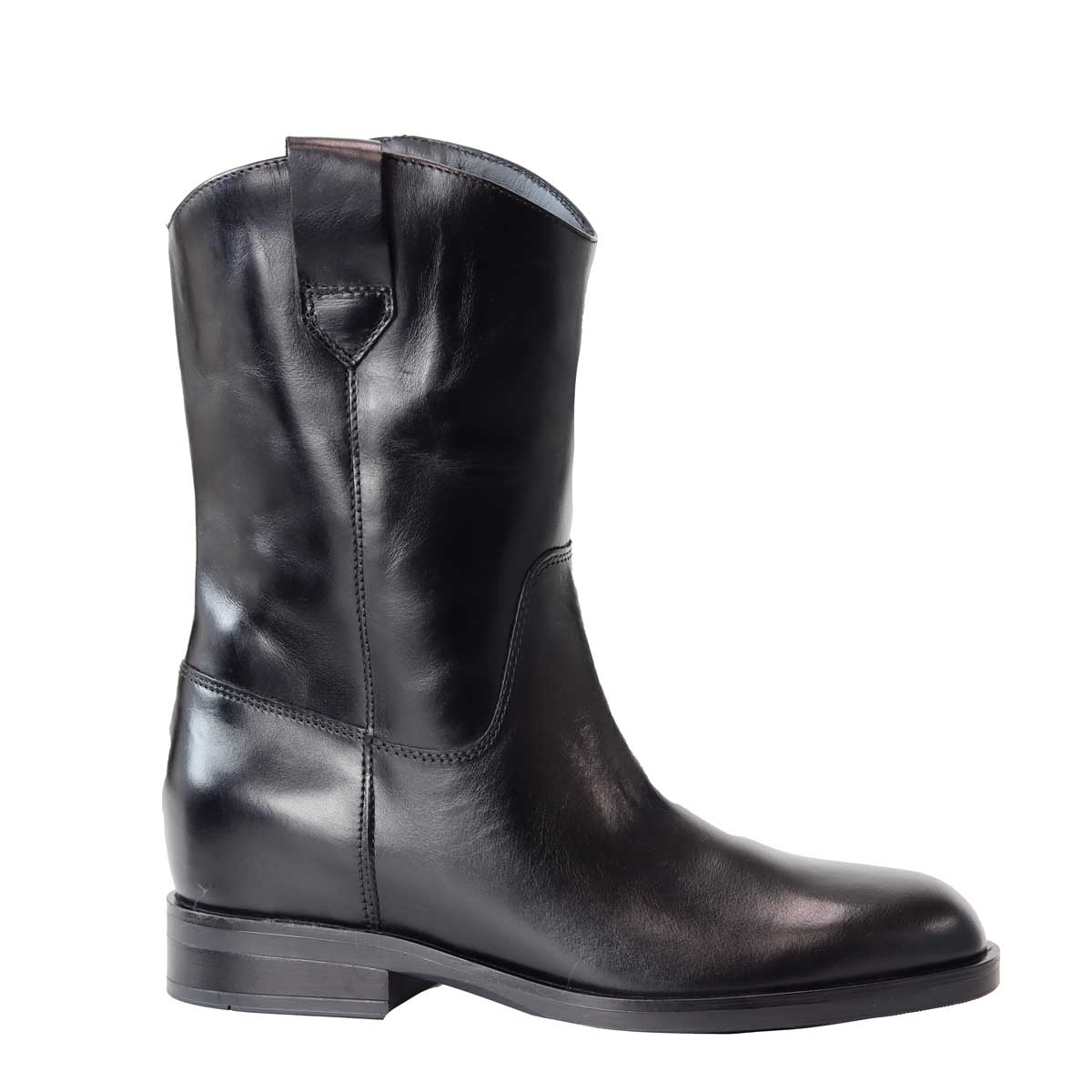 Stivaletto KIM LOW nero di CARMENS in pelle con punta arrotondata, tomaia stile texano e zip interna. Tacco 20mm e zeppa interna 30mm.