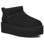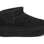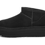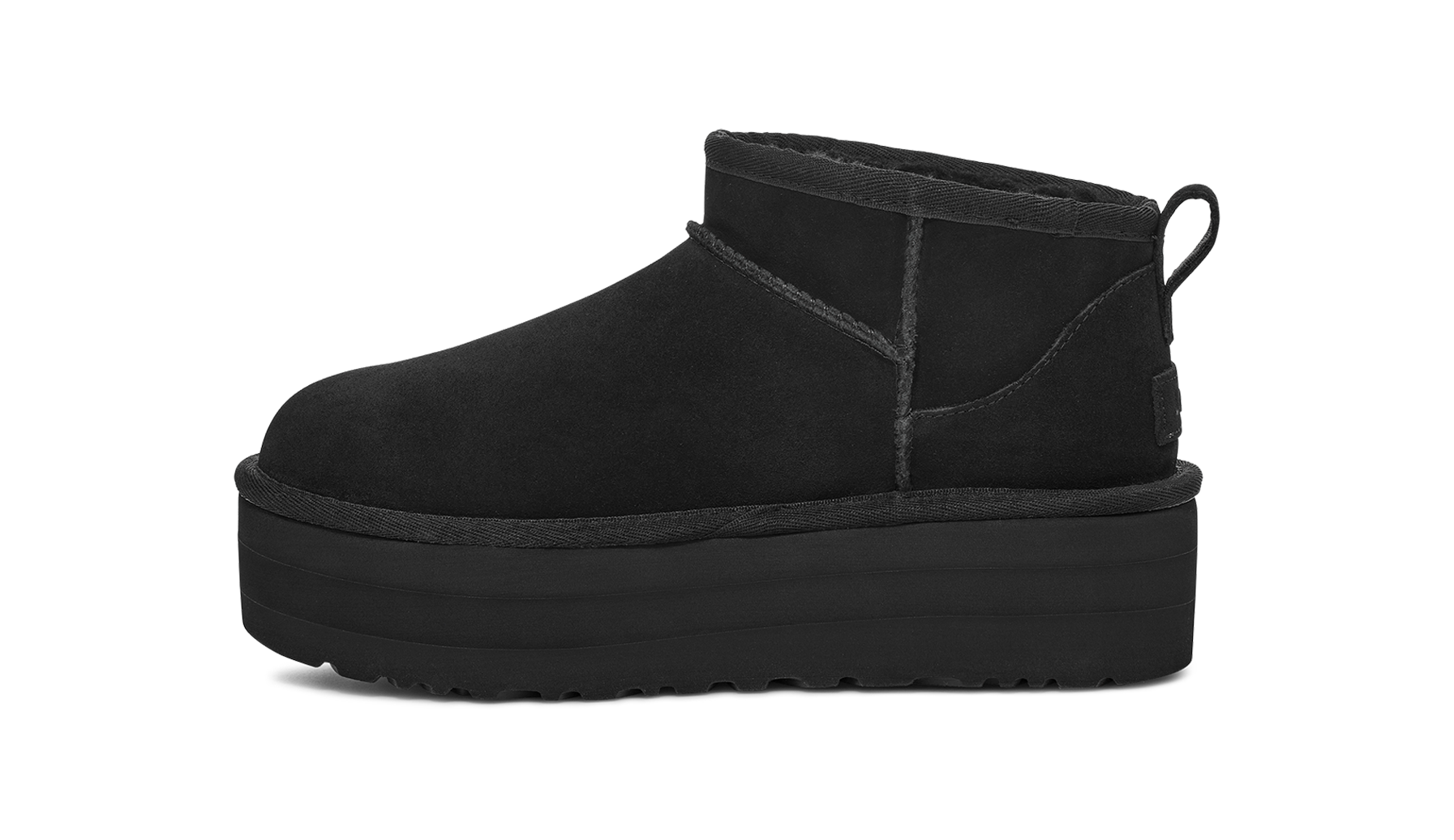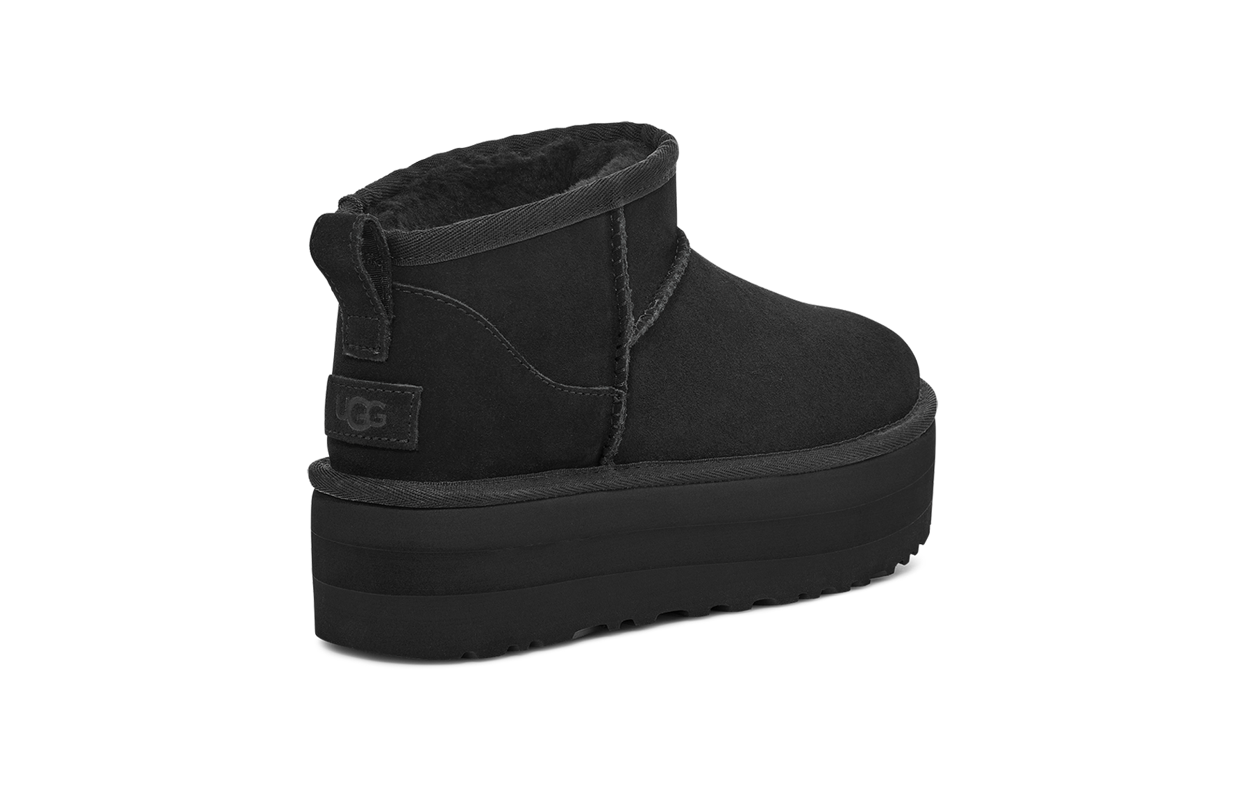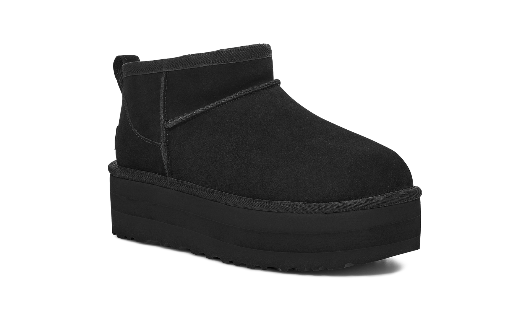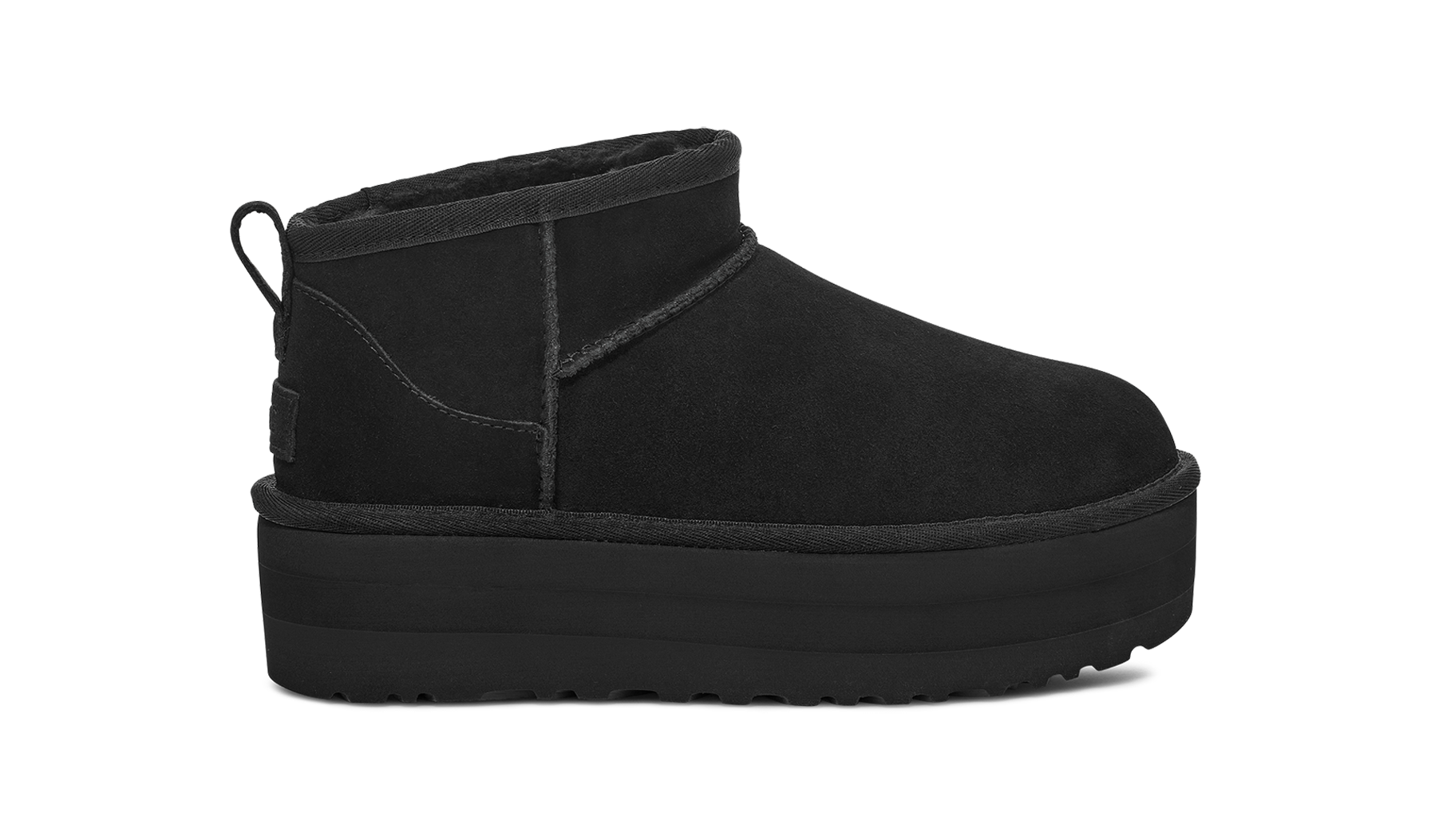 ULTRA MINI PLATFORM nero di UGG in camoscio con interno in montone, cuciture in tinta e fondo platform 40mm.