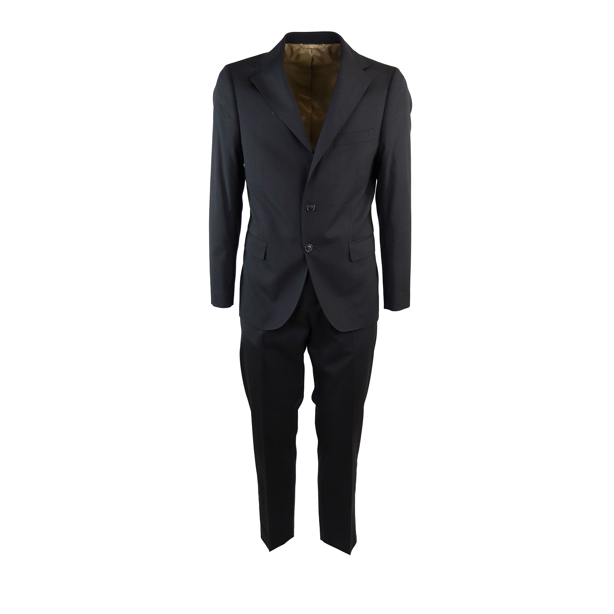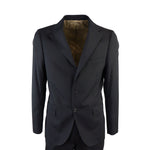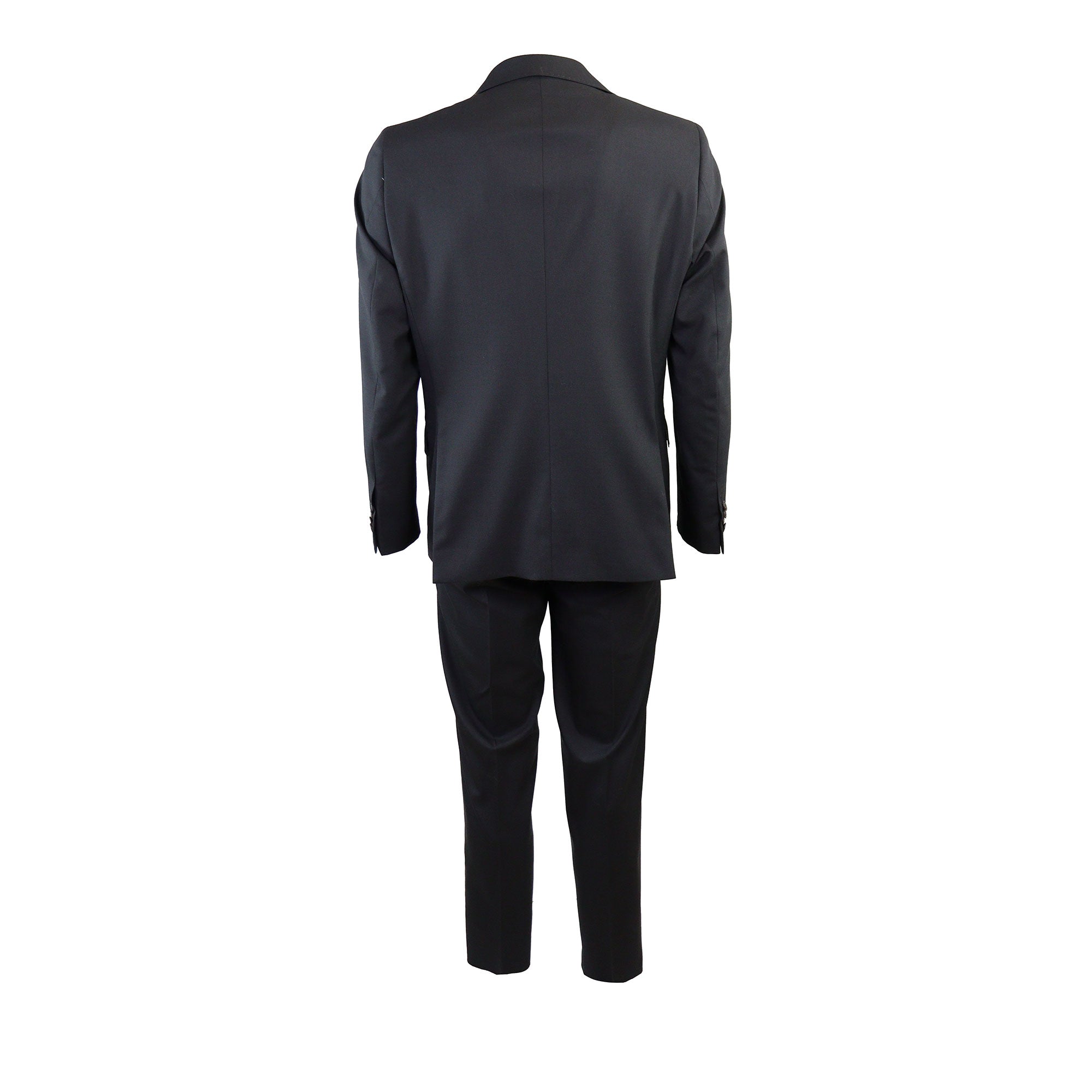 Abito nero di OUTFIT in frescolana con effetto a righe. Giacca a due bottoni, tasche a filetto con pattina e rever classico.