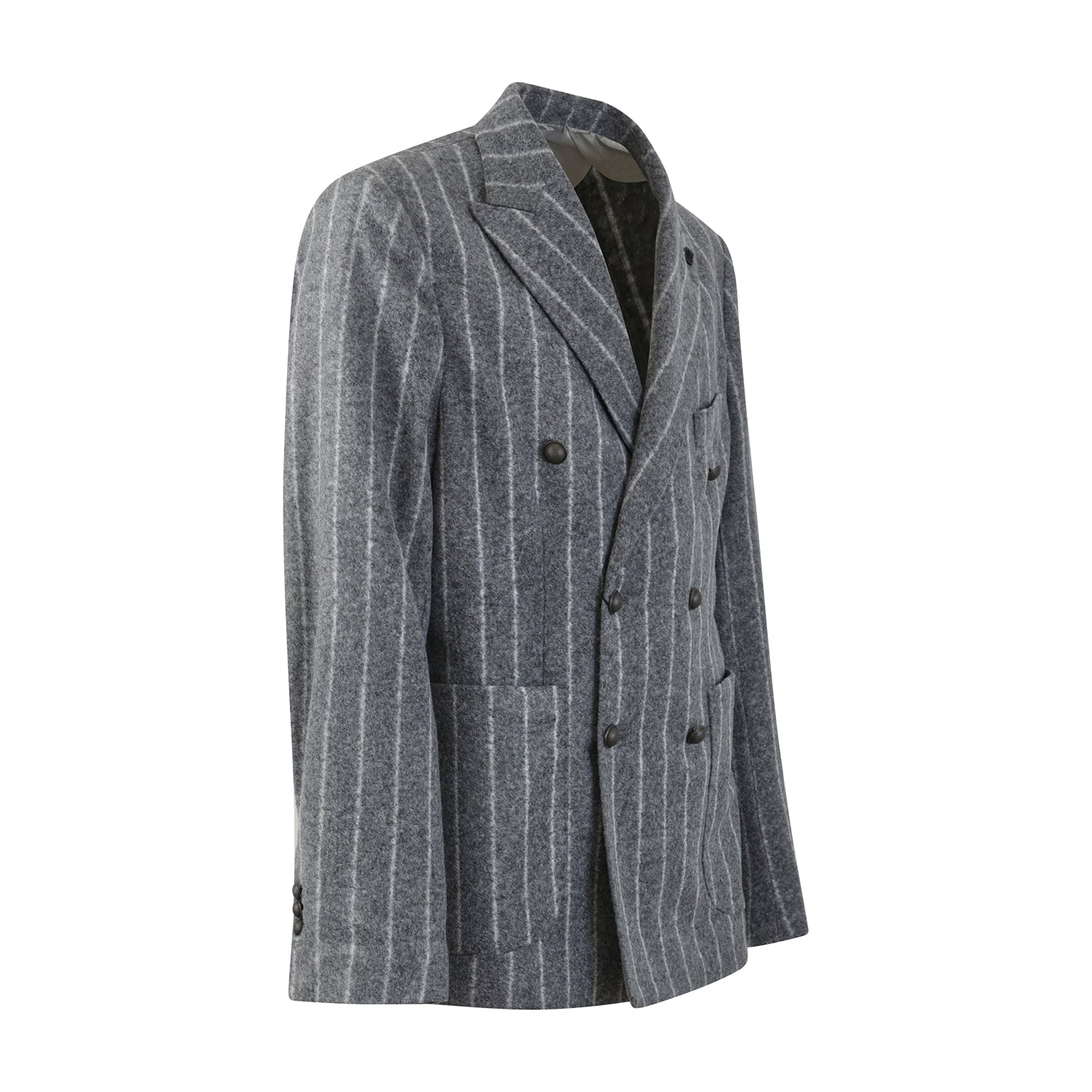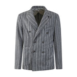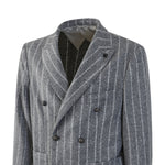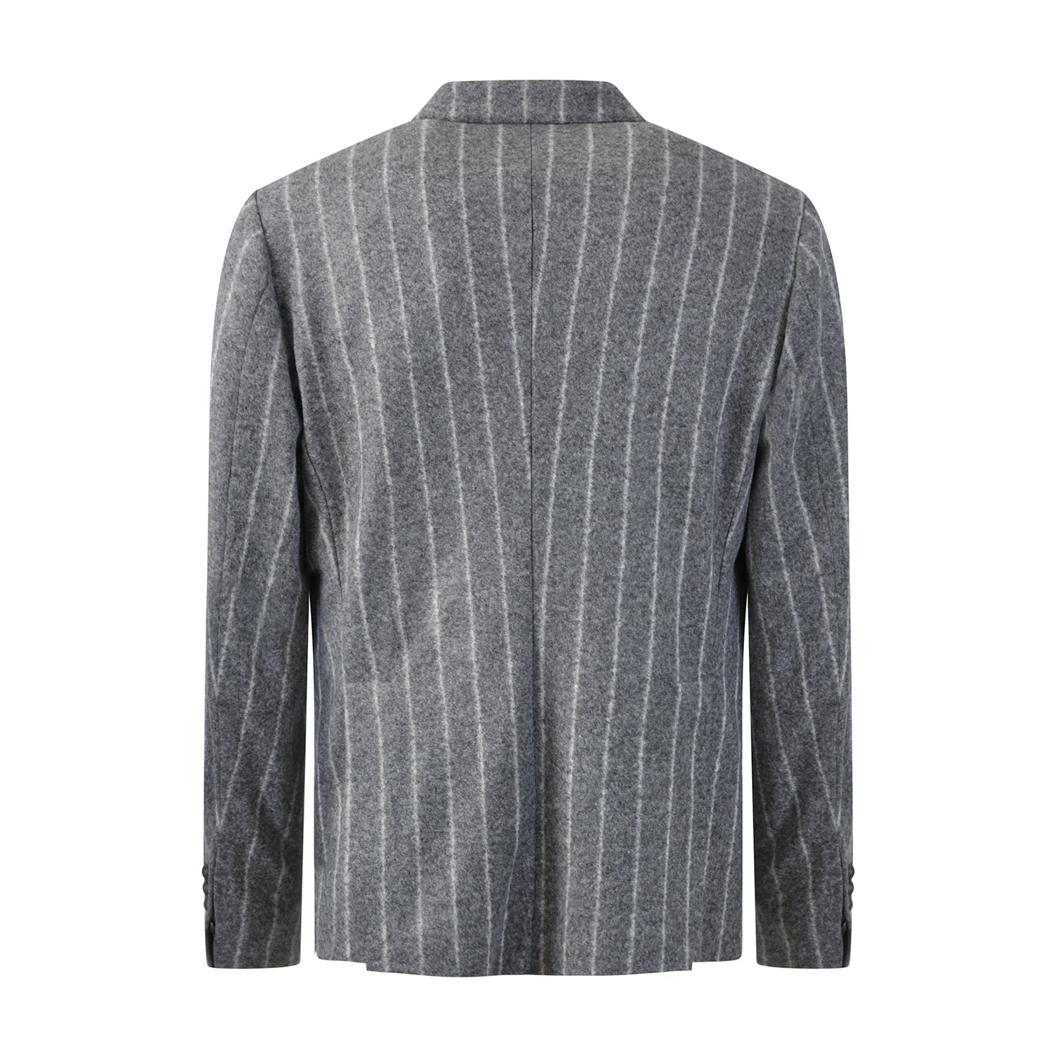 Giacca ILGOBBO grigia di OUTFIT in misto lana con effetto righe in bianco, modello doppio petto con bottoni in metallo, rever a lancia, tasche applicate, spacchi posteriori.