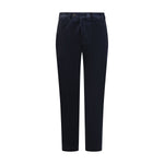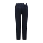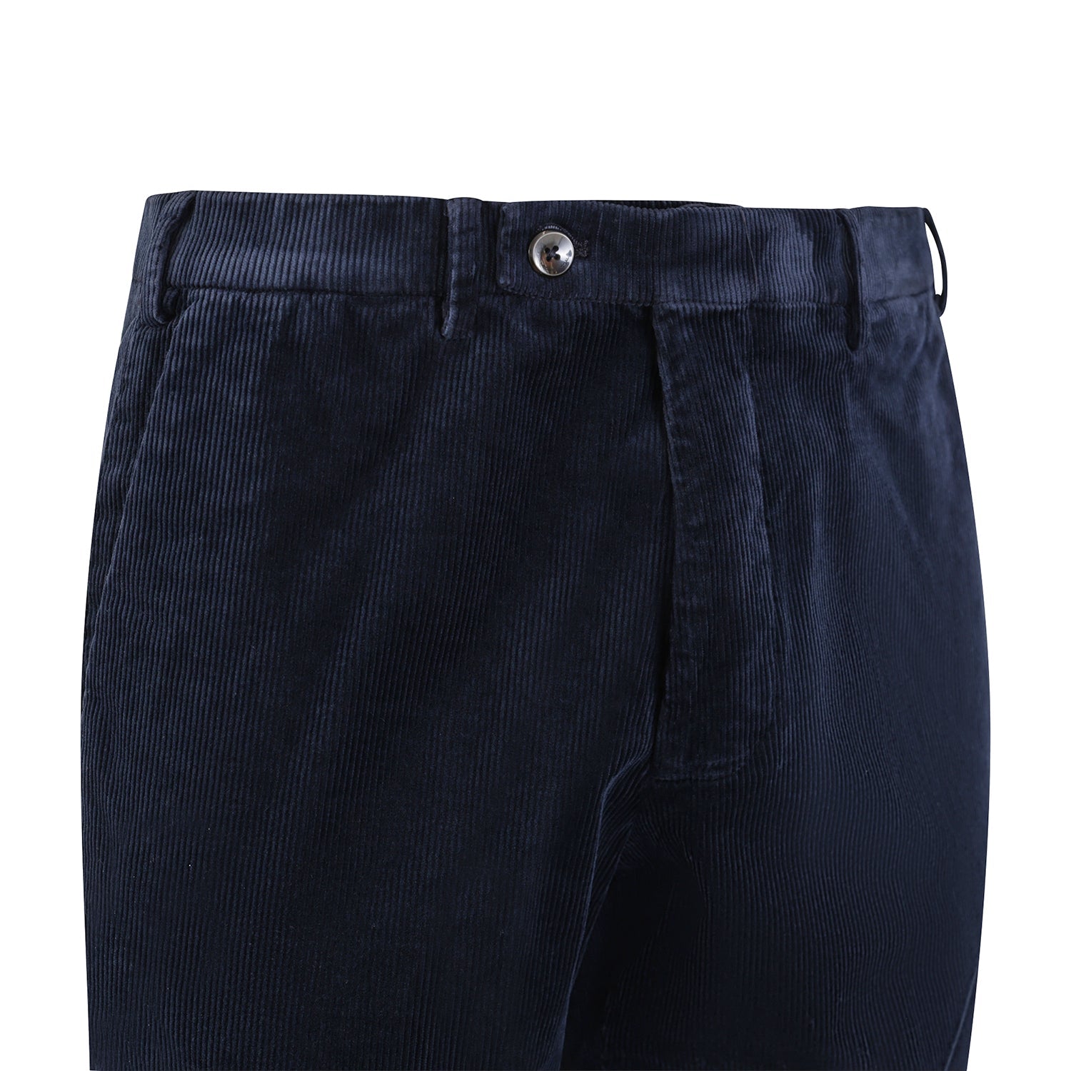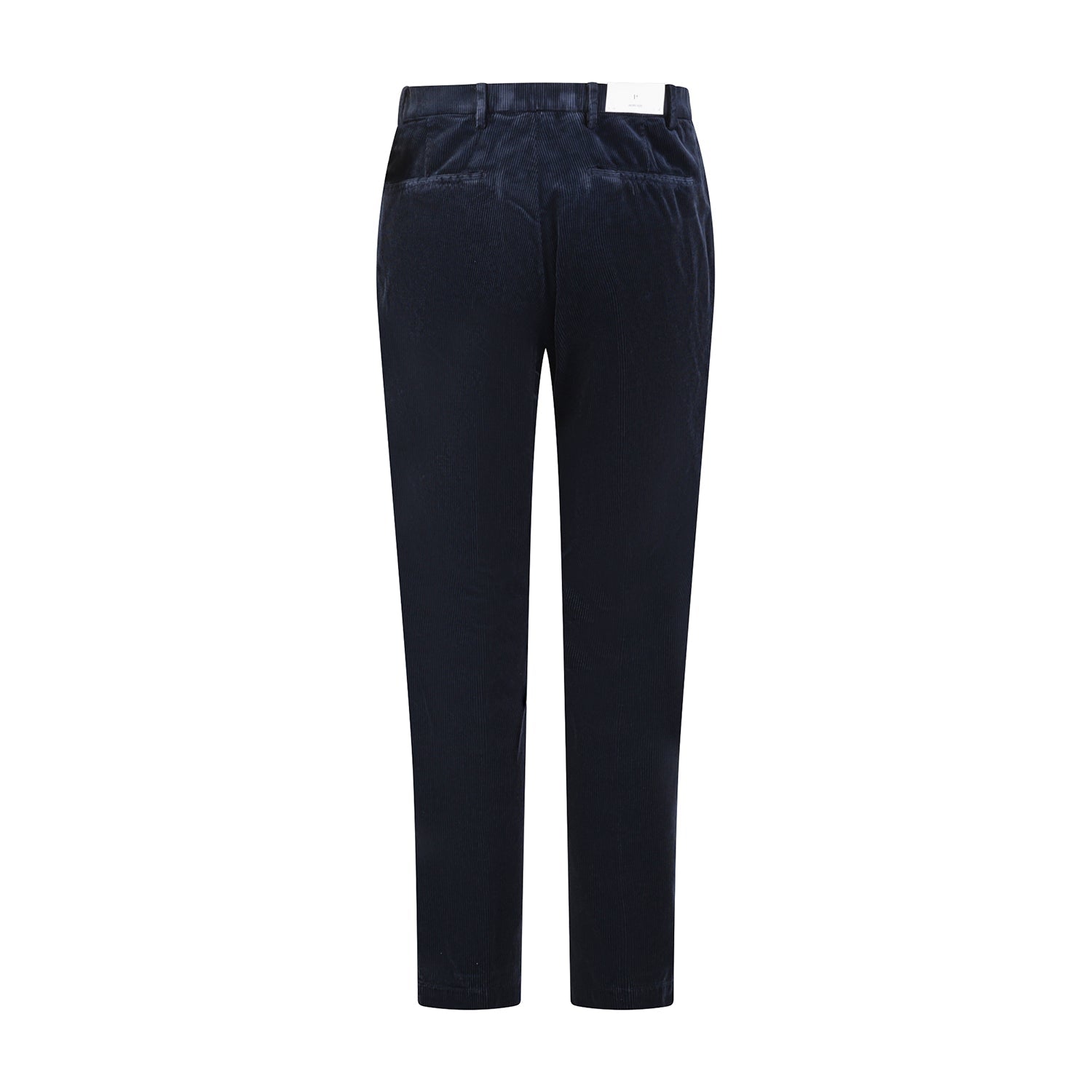 Pantalone BRAD 1+ blu di MICHAEL COAL in cotone con effetto velluto a coste, ventre piatto, tasche america laterali, tasche a filetto posteriori, chiusura con bottone leggermente spostato e zip. Pantalone con brevetto ONE MORE SIZE con coulisse elasticizzata in vita per maggiore confort nella vestibilita'.