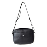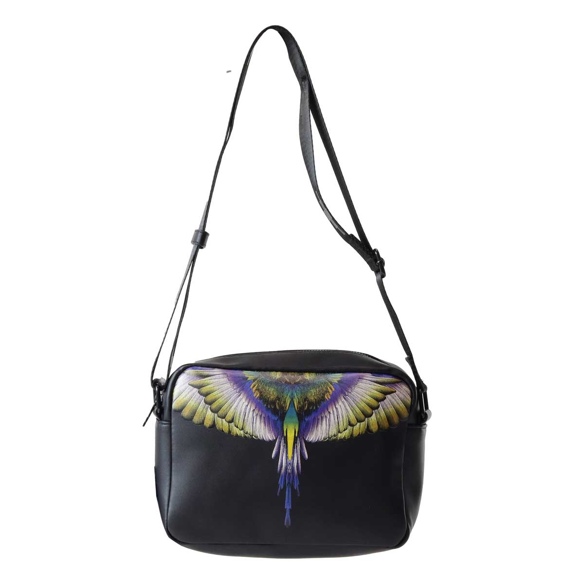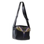 Tracolla nera di COUNTY OF MILAN MARCELO BURLON in ecopelle con chiusura con zip, tracolla in tessuto, scomparto aggiuntivo e stampa ali multicolor con gradazione blu. Misure 22x16x8 cm.
