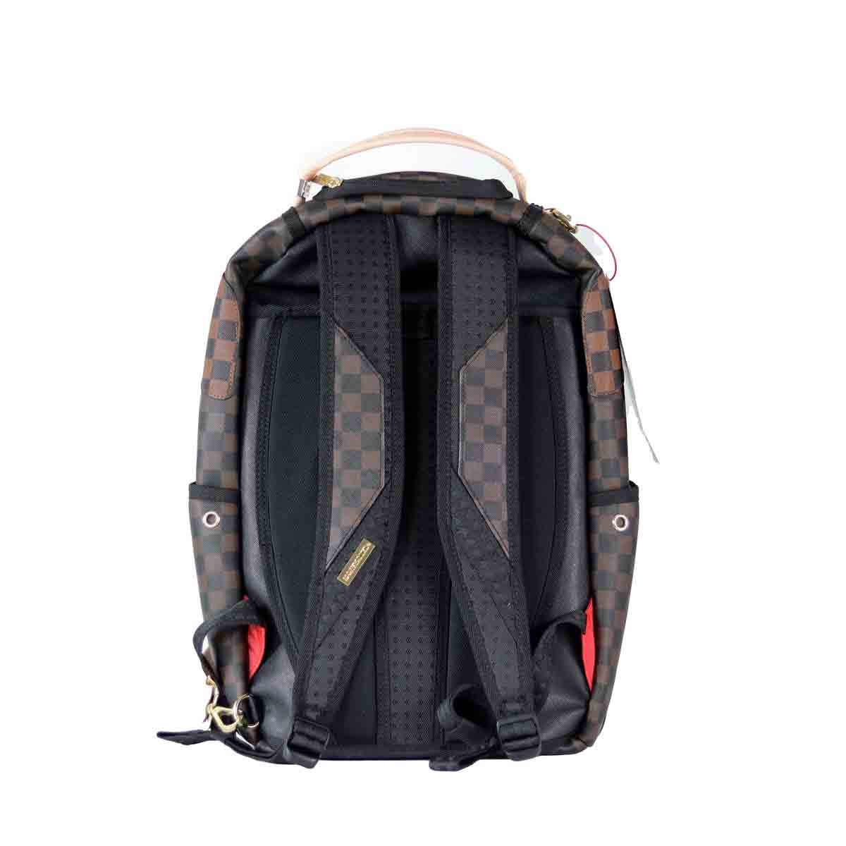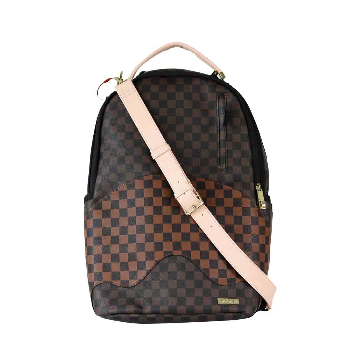 Zaino Fibbia marrone di SPRAYGROUND in ecopelle con fondo check marrone e nero e tracolla con fibbia beige, apertura con zip superiore. Misure 32x45x18cm.