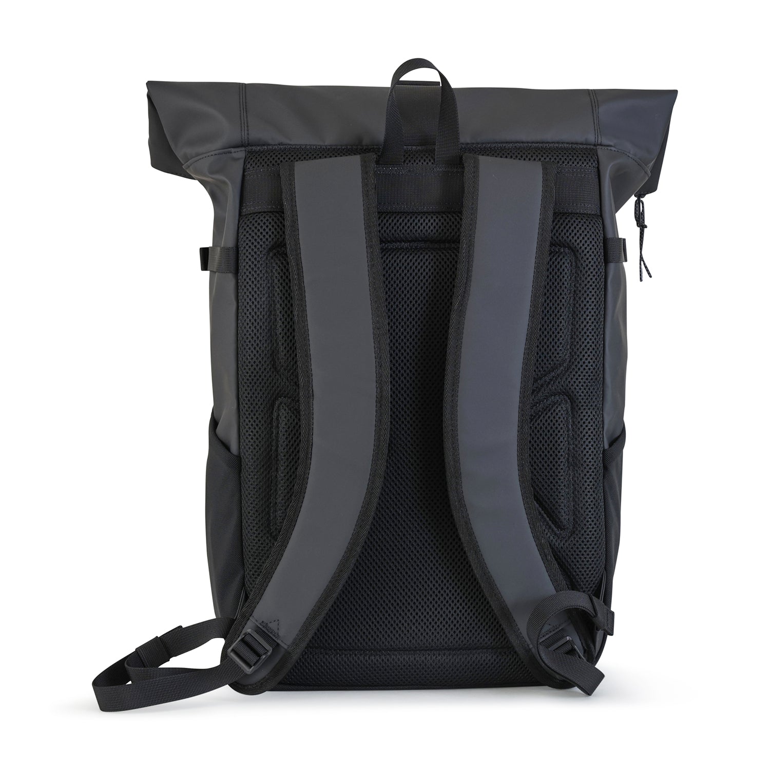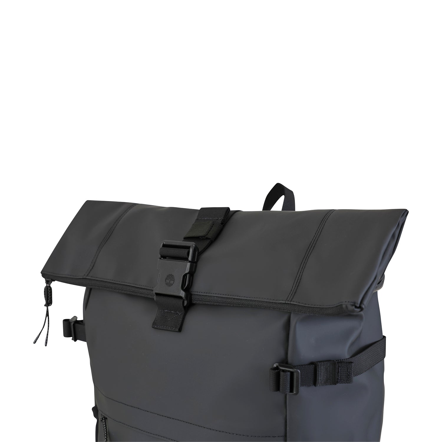 Zaino nero di TIMBERLAND in pelle gommata con chiusura roller con zip e gancio, profili in tessuto, logo in metallo.