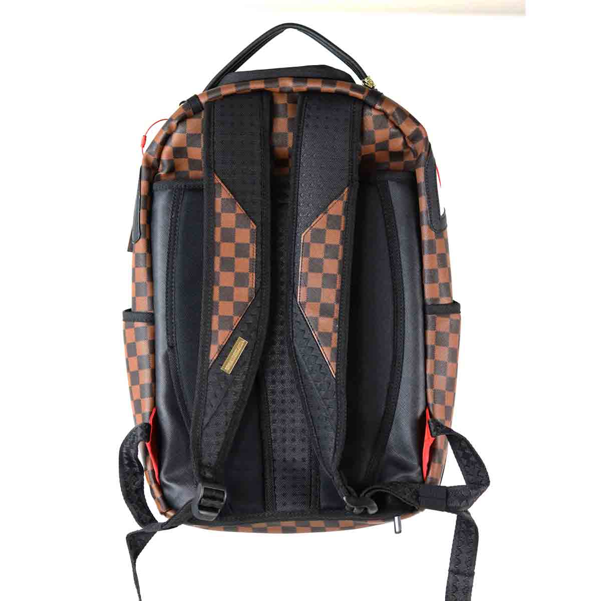 Zaino Shark Check marrone di SPRAYGROUND in ecopelle con fondo check classic e shark classic, apertura con zip superiore. Misure 32x45x18cm.