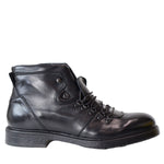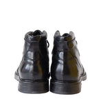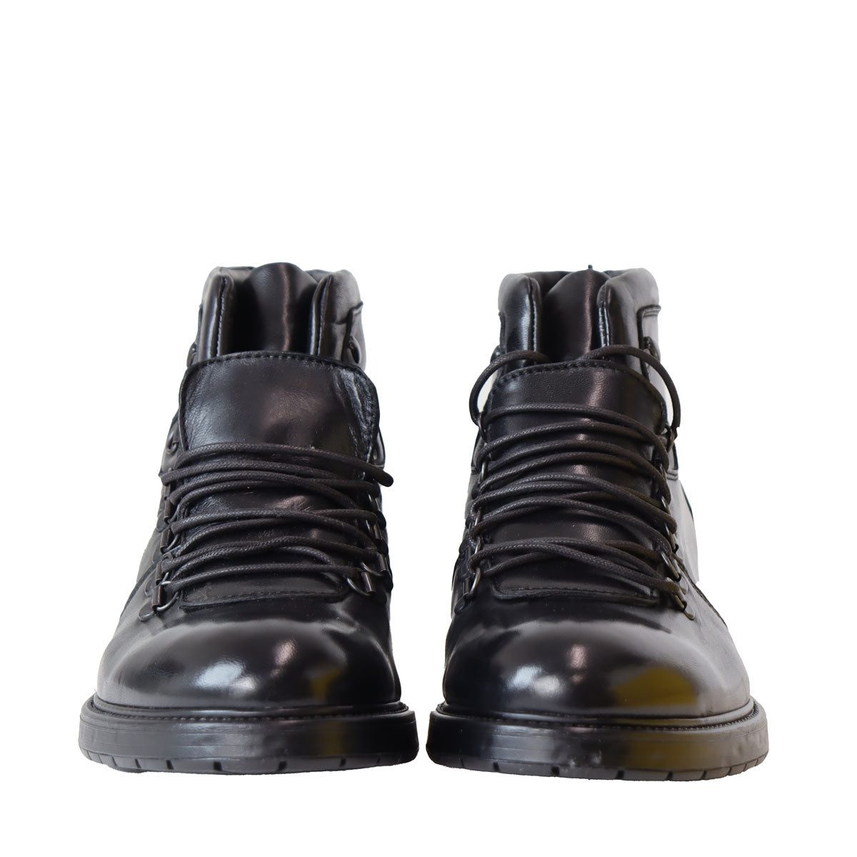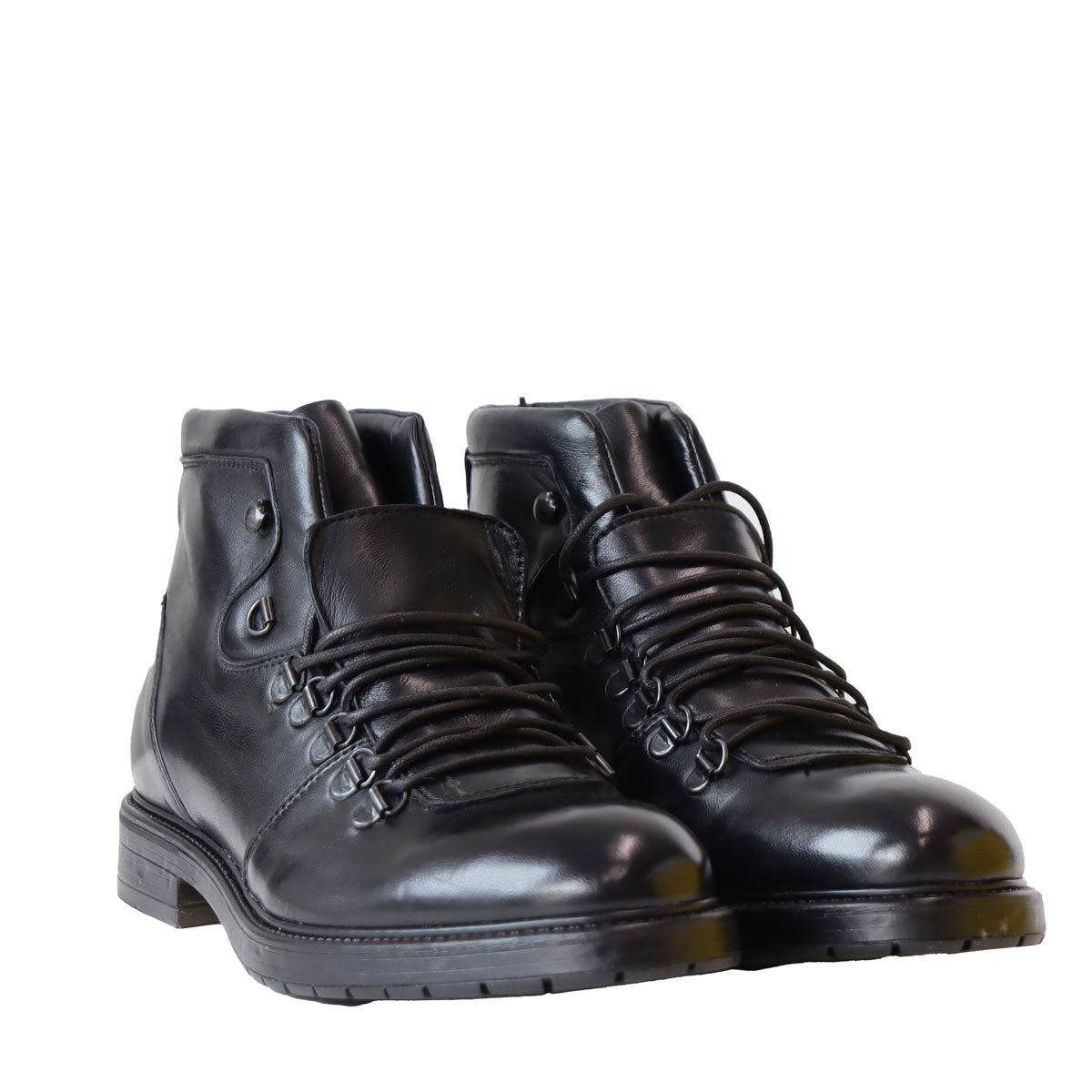 Pedula nera di KEBO in pelle con altezza midi, collarino imbottito, ganci per lacci in metallo. Fondo in gomma.